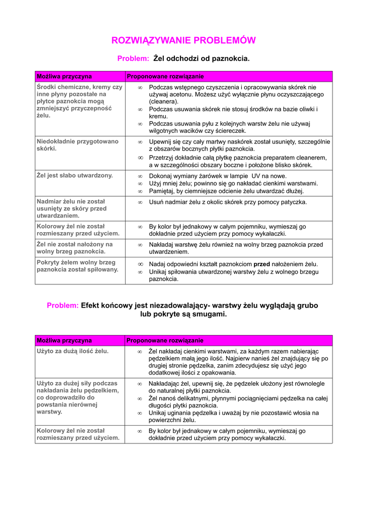 ROZWIĄZYWANIE PROBLEMÓW Problem: Żel odchodzi od paznokcia. Możliwa przyczyna Środki chemiczne, kremy czy inne płyny pozostałe na płytce paznokcia mogą zmniejszyć przyczepność żelu. Proponowane rozwiązanie • • • Niedokładnie przygotowano skórki. • • Podczas wstępnego czyszczenia i opracowywania skórek nie używaj acetonu. Możesz użyć wyłącznie płynu oczyszczającego (cleanera). Podczas usuwania skórek nie stosuj środków na bazie oliwki i kremu. Podczas usuwania pyłu z kolejnych warstw żelu nie używaj wilgotnych wacików czy ściereczek. Upewnij się czy cały martwy naskórek został usunięty, szczególnie z obszarów bocznych płytki paznokcia. Przetrzyj dokładnie całą płytkę paznokcia preparatem cleanerem, a w szczególności obszary boczne i położone blisko skórek. Żel jest słabo utwardzony. • • • Dokonaj wymiany żarówek w lampie UV na nowe. Użyj mniej żelu; powinno się go nakładać cienkimi warstwami. Pamiętaj, by ciemniejsze odcienie żelu utwardzać dłużej. Nadmiar żelu nie został usunięty ze skóry przed utwardzaniem. • Usuń nadmiar żelu z okolic skórek przy pomocy patyczka. Kolorowy żel nie został rozmieszany przed użyciem. • By kolor był jednakowy w całym pojemniku, wymieszaj go dokładnie przed użyciem przy pomocy wykałaczki. Żel nie został nałożony na wolny brzeg paznokcia. • Nakładaj warstwę żelu również na wolny brzeg paznokcia przed utwardzeniem. Pokryty żelem wolny brzeg paznokcia został spiłowany. • Nadaj odpowiedni kształt paznokciom przed nałożeniem żelu. Unikaj spiłowania utwardzonej warstwy żelu z wolnego brzegu paznokcia. • Problem: Efekt końcowy jest niezadowalający- warstwy żelu wyglądają grubo lub pokryte są smugami. Możliwa przyczyna Proponowane rozwiązanie Użyto za dużą ilość żelu. • Żel nakładaj cienkimi warstwami, za każdym razem nabierając pędzelkiem małą jego ilość. Najpierw nanieś żel znajdujący się po drugiej stronie pędzelka, zanim zdecydujesz się użyć jego dodatkowej ilości z opakowania. Użyto za dużej siły podczas nakładania żelu pędzelkiem, co doprowadziło do powstania nierównej warstwy. • Nakładając żel, upewnij się, że pędzelek ułożony jest równolegle do naturalnej płytki paznokcia. Żel nanoś delikatnymi, płynnymi pociągnięciami pędzelka na całej długości płytki paznokcia. Unikaj uginania pędzelka i uważaj by nie pozostawić włosia na powierzchni żelu. Kolorowy żel nie został rozmieszany przed użyciem. • • • By kolor był jednakowy w całym pojemniku, wymieszaj go dokładnie przed użyciem przy pomocy wykałaczki. Problem: Żel kurczy się podczas utwardzania. Możliwa przyczyna Proponowane rozwiązanie Żel niedokładnie się utwardza. • Dokonaj wymiany żarówek w lampie UV na nowe. Płytka paznokcia nie została wystarczająco zmatowiona przed nałożeniem żelu. • Upewnij się, że nadano płytce chropowaty charakter na całej jej długości, a skórki zostały odchylone. Jeśli używasz starego pilnika, dokonaj jego wymiany. Kolorowy żel nie został rozmieszany przed użyciem. • • By kolor był jednakowy w całym pojemniku, wymieszaj go dokładnie przed użyciem przy pomocy wykałaczki. Problem: Po naniesieniu nabłyszczacza Top Gel kolor powierzchni płytki stał się mętny. Możliwa przyczyna Na płytce pozostał osad, pył. Proponowane rozwiązanie • • Używaj tylko czystej strony wacika lub całkowicie nowego wacika bezpyłowego wraz z cleanerem, by uniknąć osadzania się pyłu. Podczas stylizacji często zmieniaj waciki bezpyłowe. Problem: Nie można usunąć żelu. Możliwa przyczyna Proponowane rozwiązanie Klientka była długo wystawiona na działanie promieni UV w solarium lub poza nim. • Opiłowuj i zmywaj dokładnie każdą warstwę żelu do momentu pozbycia się ostatniej z nich. Proces zmywania został przeprowadzony niedokładnie lub niekompletnie. • Żel Top Gel nie został dokładnie zeszlifowany pilnikiem z powierzchni płytki paznokcia, co przeszkadza w zmywaniu warstw acetonem. Nie użyto 100% acetonu. • Problem: Wystąpiło podrażnienie. Możliwa przyczyna Część żelu pozostała na skórze. U klientki mogła wystąpić reakcja alergiczna na monomery metakrylowe lub cyjanoakryle. Proponowane rozwiązanie • • Zadbaj o to, by nadmiar żelu z okolic skórek został usunięty przed utwardzaniem w lampie. Podczas oczyszczania lepkiej warstwy żelu, używaj tylko czystej strony wacika lub całkowicie nowego wacika, ponieważ nagromadzony na nim żel może dostać się na skórę. • Usuń żel i zaproponuj użycie odżywki do paznokci. Problem: Końcówka French Wrap Plus odchodzi od paznokcia. Możliwa przyczyna Proponowane rozwiązanie Nie zapewniono odpowiedniej przyczepności na brzegach i w rogach końcówki. • Szerokość użytej końcówki Frech Wrap Plus jest większa niż szerokość naturalnego wolnego brzegu paznokcia. • Użyto zbyt małej ilości podkładu French Bonder. • • • • By końcówka French Wrap Plus dobrze przylegała, dopilnuj by nanieść klej na boczne obszary płytki paznokcia . Plastikową osłonkę usuwaj, naciskając od środka ku jego bokom. Podczas nakładania żelu na końcówkę French Wrap Plus, dokładnie pokryj nim linię uśmiechu, by przytwierdzić ją do płytki paznokcia. Podczas dopasowywania końcówki French Wrap Plus upewnij się, że szerokość linii uśmiechu nie wykracza poza szerokość naturalnego wolnego brzegu paznokcia. W razie potrzeby spiłuj lub przytnij końcówkę French Wrap Plus tak, by pokrywała się szerokością z naturalnym wolnym brzegiem paznokcia. Podkład nakładaj oszczędnie, ale dokładnie na całą długość brzegu. Problem: Linia uśmiechu jest niewyraźna. Możliwa przyczyna Proponowane rozwiązanie Poruszono końcówką French Wrap Plus po umiejscowieniu jej na płytce paznokcia. • Nie koryguj położenia końcówki French Wrap Pl