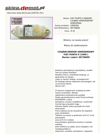 http://www.sklep.demot.pl/p,1009764,.html Nazwa: FIAT PUNTO II SENSOR CZUJNIK UDERZENIOWY UDERZENIA Numer produktu: 1009764 Kod OE/dostawcy: 46739605 Cena: 55 ZŁ Witamy na naszej aukcji! Mamy do zaoferowania: CZUJNIK/SENSOR UDERZENIOWY FIAT PUNTO II (1999-) Numer części: 46739605 Jesteśmy sprawdzonym sprzedawcą, zaufało nam już tysiące klientów! Jesteśmy firmą z wieloletnią tradycją, co gwarantuje że zakupy części w naszym sklepie, są bezpieczne! Do każdego zakupu dołączony jest paragon, lub na życzenie klienta faktura VAT. W naszych magazynach znajdują się setki tysięcy produktów, dlatego zapewniamy błyskawiczną wysyłkę! Dzięki wprowadzonemu przez firmę kurierską KOLPORTER, z którą posiadamy umowę o współpracy, systemowi monitoringu przesyłek mogą Państwo śledzić status przesyłki do chwili doręczenia! Praca odbywa się we wszystkie dni tygodnia poza niedzielami. Telefony są czynne w godzinach od 8-17 w dni powszednie oraz od 8-14 w soboty W pozostałych godzinach prosimy o kontakt mailowy, Jeżeli telefony są zajęte, poza zasięgiem, lub występują błędy w połączeniu, wszelkie zamówienia i zapytania proszę kierować na maila, czytamy i odpowiadamy wszystkie e-maile! Przy zakupie powyżej 200 zł choinka zapachowa do Twojego samochodu GRATIS !!! UWAGA! Kupując na kilku naszych aukcjach - za przesyłkę płacisz tylko raz! Posiadamy w ofercie tysiące oryginalnych części oraz zamienników do takich marek jak: AUDI, Alfa Romeo, Bmw, Chevrolet, Chrysler, Citroen, Dacia, Daewoo, Daihatsu, Dodge, Fiat, Ford, Honda, Hyundai, Jaguar, Jeep, Kia, Lancia, Land Rover, Lexus, Łada, Mazda, Mercedes, MG, Mini, Mitsubishi, Nissan, Opel, Peugeot, Polonez, Pontiac, Porsche, Renault, Rover, Saab, Seat, Skoda, Smart, Ssang Yong, Subaru, Suzuki, Tata, Toyota, Volkswagen, Volvo, ponadto posiadamy w ofercie części dla miłośników pojazdów zabytkowych i klasycznych. Zapraszamy na inne aukcje sklepu demot! Posiadamy w sprzedaży auto alarmy, zestawy słuchawkowe, radioodtwarzacze, mp3, DVD, TV, CB radio, CD, nawigacja GPS, aktualna mapa oraz filmy i gry o tematyce motoryzacyjnej. Jesteśmy autoryzowanym sprzedawcą produktów Castrol, posiadamy własny serwis zapewniający bezpłatną wymianę zakupionych u nas olejów. Staramy się aby klasa naszych usług była najwyższa! Oferujemy serwis wulkanizacyjny, oraz sprzedaż opon nowych, bieżnikowanych oraz używanych pochodzących ze stacji demontażu pojazdów. Przy zakupie kompletu opon używanych montaż gratis! W naszej firmie istnieje możliwość złomowania pojazdu. Złomowanie i kasacja samochodów oraz motocykli i skuterów jest możliwa dzięki uzyskanym zezwoleniom. Stacja demontażu wystawia zaświadczenia umożliwiające wyrejestrowanie pojazdu. Nasza oferta jest skierowana do wszystkich ceniących sobie wysoki standard oferowanych usług!