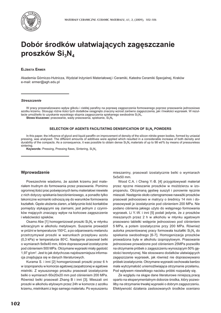 MATERIA£Y CERAMICZNE /CERAMIC MATERIALS/, 61, 2, (2009), 102-106 Dobór rodków uatwiajcych zagszczanie proszków Si3N4 ELBIETA ERMER Akademia Górniczo-Hutnicza, Wydzia Inynierii Materiaowej i Ceramiki, Katedra Ceramiki Specjalnej, Kraków e-mail: [email protected] Streszczenie W pracy przeanalizowano wpyw glikolu i ciekej parafiny na popraw zagszczenia formowanego poprzez prasowanie jednoosiowe azotku krzemu. Stosujc róne iloci tych dodatków osignito znaczny wzrost zarówno zagszczenia, jak i trwaoci wyprasek. W rezultacie umoliwio to uzyskanie wysokiego stopnia zagszczenia spiekanego swobodnie Si3N4. Sowa kluczowe: prasowanie, wady prasowania, spiekanie, Si3N4 SELECTION OF AGENTS FACILITATING DENSIFICATION OF Si3N4 POWDERS In this paper, the influence of glycol and liquid paraffin on improvement of density of the silicon nitride green bodies, formed by uniaxial pressing, was analysed. The different amounts of additives were applied which resulted in a considerable increase of both density and durability of the compacts. As a consequence, it was possible to obtain dense Si3N4 materials of up to 98 wt/% by means of pressureless sintering. Keywords: Pressing, Pressing flaws, Sintering, Si3N4 Wprowadzenie Powszechnie wiadomo, e azotek krzemu jest materiaem trudnym do formowania przez prasowanie. Pomimo ogromnej iloci prac powiconych temu materiaowi niewiele z nich dotyczy spiekania bezcinieniowego, a ponadto tylko lakoniczne wzmianki odnosz si do warunków formowania ksztatek. Gste uoenie ziaren, a faktycznie ilo kontaktów pomidzy stykajcymi si ziarnami, jest jednym z czynników majcych znaczcy wpyw na kocowe zagszczenie i waciwoci spieków. Osamo Abe [1] homogenizowa proszki Si3N4 w mynku wibracyjnym w alkoholu metylowym. Suszenie prowadzi w próni w temperaturze 150oC, a po odparowaniu metanolu przetrzymywa proszki w warunkach przepywu azotu (0,3 kPa) w temperaturze 80oC. Nastpnie prasowa belki o wymiarach 9x9x40 mm, które doprasowywa izostatycznie pod cinieniem 500 MPa. Otrzymane wypraski miay gsto 1,97 g/cm3. Jest to jak dotychczas najobszerniejsza informacja znajdujca si w danych literaturowych. Kurama S. i inni [2] homogenizowali proszki przez 6 h w izopropanolu w komorze agatowej zaopatrzonej w agatowe mielniki. Z wysuszonego proszku prasowali izostatycznie belki o wymiarach 60x20x20 mm pod cinieniem 200 MPa. Równie belki prasowali Zhang B i inni [3]. Mieszali oni proszki w alkoholu etylowym przez 24h w komorze z azotku krzemu, mielnikami z tego samego materiau. Po wysuszeniu 102 mieszaniny, prasowali izostatycznie belki o wymiarach 5x5x50 mm. Wood C.A. i Cheng Y.-B. [4] przygotowywali materia przez rczne mieszanie proszków w modzierzu w izopropanolu. Otrzyman gstw suszyli i ponownie rcznie mieszali. Nastpnie okoo czterogramowe nawaki proszków prasowali jednoosiowo w matrycy o rednicy 14 mm i doprasowywali je izostatycznie pod cinieniem 200 MPa. Nie podano cinienia jakiego uyto do wstpnego formowania wyprasek. Li Y.-W. i inni [5] podali jedynie, e z proszków mieszanych przez 2 h w alkoholu w mynku agatowym prasowano tabletki wstpnie jednoosiowo pod cinieniem 5 MPa, a potem izostatycznie przy 200 MPa. Równie autorka prezentowanej pracy formowaa ksztatki Si3N4 do spiekania swobodnego [6-7]. Homogenizacja proszków prowadzona bya w alkoholu izopropylowym. Prasowanie jednoosiowe prowadzone pod cinieniem 25MPa pozwolio na otrzymanie próbek o zagszczeniu wynoszcym 50% gstoci teoretycznej. Nie stosowano dodatków uatwiajcych zagszczanie wyprasek, jak równie nie doprasowywano próbek izostatycznie. Otrzymane wypraski cechowaa bardzo maa wytrzymao uniemoliwiajca otrzymanie przeamu. Pod wpywem niewielkiego nacisku próbki rozpaday si. Ze wzgldu na skpe dane literaturowe niniejsz prac oparto na eksperymentalnym doborze rodka, który pozwoliby na otrzymanie trwaej wypraski o dobrym zagszczeniu. Efektywno dziaania zastosowanych rodków oceniano DOBÓR RODKÓW UATWIAJCYCH ZAGSZCZANIE PROSZKÓW Si3N4... Opis eksperymentu W przeprowadzonych eksperymentach prasowania zastosowano proszek - Si3N4 (H.C. Starck M 11) oraz proszki Al2O3 (A-160 SG.–Alcoa) i MgO (Reachim), bdce dodatkami aktywujcymi proces spiekania, które wprowadzono w iloci 5% mas kady. Jako substancje uatwiajce polizg i zagszczanie proszku podczas formowania uyto glikolu etylenowego (cz.d.a., POCh) o gstoci = 1,11g/cm3 i ciekej parafiny (Laboratorium farmaceutyczne „Avena” SP.J.) o gstoci = 0,77g/cm3. Przeprowadzono równie próby formowania z udziaem ywicy fenolowej. Ilo wprowadzonych rodków podana w ml przypadajcych na 100 g proszku zestawiona zostaa w tabeli 1. Wszystkie skadniki, tzn. mieszaniny proszków i dodatki wspomagajce formowanie, homogenizowano na mokro w izopropanolu. Pojemniki, w których przeprowadzano homogenizacj byy polietylenowe, a jako mieszalniki stosowano kulki z azotku krzemu. Czas procesu homogenizacji wynosi 72 godziny. Proszki suszono pod promiennikiem podczerwieni, a nastpnie w suszarce, a do cakowitego odparowania alkoholu. Granulaty proszków otrzymywano poprzez przecieranie przez sito ( = 0,80 mm). Formowanie ksztatek przeprowadzono poprzez prasowanie jednoosiowe w matrycy stalowej o rednicy 20 mm pod cinieniem wynoszcym 15, 30, 60 i 90 MPa. Nawaki proszku wynosiy 3 g i 5 g, co pozwalao otrzyma próbki o przecitnej wysokoci wynoszcej odpowiednio 5 i 9 mm. Gsto pozorn wyprasek wyznaczano na podstawie pomiaru ich wymiarów i masy. Natomiast zagszczenie wzgldne okrelono w odniesieniu do gstoci mieszaniny proszków. Tabela 1. Zestawienie stosowanych rodków uatwiajcych zagszczanie proszków Si3N4 podczas formowania przez prasowanie. Table 1. Statement of the applied agents facilitating densification of the Si3N4 powders during pressing. jednoosiowego w zalenoci od stosowanego cinienia prasowania. Warto gstoci pozornej osignitej dla poszczególnych próbek o nawakach wynoszcych 3 g przedstawiono w tabeli 2. Zagszczenie proszku z dodatkiem glikolu w iloci 15 ml/100 g proszku przedstawia rysu
