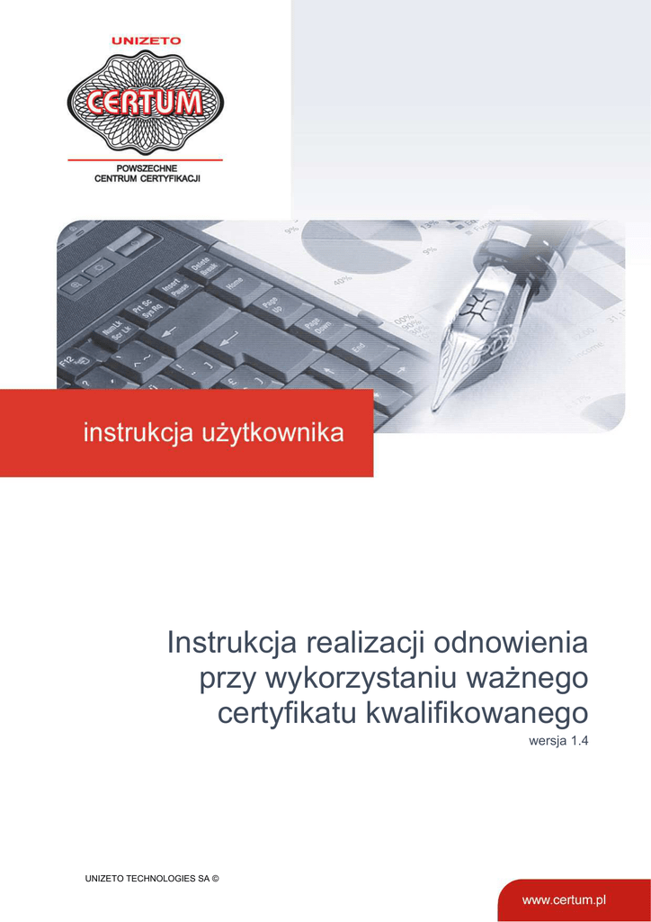 Instrukcja realizacji odnowienia przy wykorzystaniu waŜnego certyfikatu kwalifikowanego wersja 1.4 UNIZETO TECHNOLOGIES SA © Spis treści 1. WSTĘP ............................................................................................................................................... 3 2. ELEKTRONICZNY FORMULARZ OBSŁUGI ODNOWIEŃ .............................................................. 3 3. WYSŁANIE ZAMÓWIENIA ORAZ LISTY IMIENNEJ ....................................................................... 8 UNIZETO TECHNOLOGIES SA © 1. WSTĘP Szanowni Państwo, Certyfikat kwalifikowany, dla którego kończy się okres waŜności, naleŜy odnowić. Odnowienie moŜna zrealizować: - za pośrednictwem strony www.certum.pl, - w Punkcie Rejestracji CERTUM PCC, - w Punkcie Potwierdzenia ToŜsamości prowadzonym przez autoryzowanego Partnera Unizeto Technologies SA. UWAGA! PoniŜsza instrukcja pozwala na odnowienie jedynie tych certyfikatów kwalifikowanych, które jeszcze nie wygasły. JeŜeli chcesz odnowić certyfikat kwalifikowany, który został uniewaŜniony lub utracił swoją waŜność, prosimy o kontakt z naszą Infolinią w celu uzyskania szczegółowych instrukcji. 2. ELEKTRONICZNY FORMULARZ OBSŁUGI ODNOWIEŃ Przed przystąpieniem do procedury odnowienia drogą elektroniczną, przygotuj czytnik kart oraz kartę kryptograficzną z odnawianym certyfikatem kwalifikowanym. Odnowienie drogą elektroniczną moŜliwe jest przy wykorzystaniu przeglądarki Internet Explorer w wersji co najmniej 6. W celu realizacji odnowienia drogą elektroniczną, udaj się na stronę www.certum.pl, a następnie w górnym menu wybierz zakładkę OBSŁUGA CERTYFIKATÓW -> ODNAWIANIE CERTYFIKATÓW. Następnie przejdź do dedykowanego formularza odnowień, naciśnij przycisk ODNÓW CERTYFIKAT KWALIFIKOWANY. WSTĘP Wersja 1.4 UNIZETO TECHNOLOGIES SA © 3 W celu rozpoczęcia procesu podaj swój numer PESEL oraz Imię matki - takie same dane jakie zostały podane na dokumentach w trakcie składania wniosku o wydanie certyfikatu kwalifikowanego, który będzie odnawiany. Zaznacz akceptację OŚWIADCZENIA i naciśnij przycisk DALEJ aby kontynuować. W następnym oknie widoczny jest pasek z komunikatem o instalacji dodatku proCertumWebSign. Po kliknięciu na niego pojawi się okno, w którym naleŜy wybrać „Zainstaluj ten dodatek dla wszystkich uŜytkowników na tym komputerze”. ELEKTRONICZNY FORMULARZ OBSŁUGI ODNOWIEŃ Wersja 1.4 UNIZETO TECHNOLOGIES SA © 4 Aby dokończyć instalację proCertumWebSign naciśnij przycisk ZAINSTALUJ. Nie zainstalowanie proCertumWebSign będzie skutkować komunikatem zamieszczonym po prawej stronie. NaleŜy wtedy ponownie wykonać wszystkie instrukcje, od momentu wpisywania numeru PESEL. W tym momencie zostanie rozpoczęty proces składania podpisu elektronicznego pod aneksem do umowy o świadczenie usług certyfikacyjnych. W pierwszej kolejności zapoznaj się z treścią aneksu. Następnie umieść w czytniku kartę kryptograficzną zawierającą dany certyfikat kwalifikowany i naciśnij przycisk PRZEJDŹ DO PODPISANIA ANEKSU. ELEKTRONICZNY FORMULARZ OBSŁUGI ODNOWIEŃ Wersja 1.4 UNIZETO TECHNOLOGIES SA © 5 W kolejnym oknie zostanie ponownie zaprezentowany Aneks. W celu przejścia do jego podpisania naciśnij przycisk PODPISZ. Z zaprezentowanej w kolejnym oknie listy wybierz certyfikat kwalifikowany, który zostanie wykorzystany do złoŜenia podpisu (ten sam co jest odnawiany) po czym naciśnij przycisk WYBIERZ. W momencie pojawienia się okna PODPIS KWALIFIKOWANY, podaj KOD PIN odpowiedni dla danej karty kryptograficznej, a następnie naciśnij przycisk OK. Zostanie wyświetlony komunikat z informacją o złoŜeniu podpisu pod wcześniej zaprezentowanym aneksem do umowy. Naciśnięcie przycisku ZAMKNIJ zakończy proces składania podpisu. ELEKTRONICZNY FORMULARZ OBSŁUGI ODNOWIEŃ Wersja 1.4 UNIZETO TECHNOLOGIES SA © 6 Po powrocie na stronę z podpisanym juŜ Aneksem do umowy, naciśnij przycisk DALEJ. W kolejnym kroku zweryfikuj dane korespondencyjne oraz popraw je jeŜeli uległy zmianie. JeŜeli posiadasz zestaw z serii Suscriptor Q 01 i chcesz zrezygnować z modułu uwierzytelniającego w postaci dodatkowego czytnika USB zaznacz pole REZYGNUJĘ ZE SPRZĘTOWEGO MODUŁU UWIERZYTELNIAJĄCEGO. W celu zakończenia składania wniosku o odnowienie naciśnij przycisk DALEJ. ELEKTRONICZNY FORMULARZ OBSŁUGI ODNOWIEŃ Wersja 1.4 UNIZETO TECHNOLOGIES SA © 7 3. WYSŁANIE ZAMÓWIENIA ORAZ LISTY IMIENNEJ Udaj się ponownie na stronę www.certum.pl a następnie w górnym menu wybierz zakładkę OBSŁUGA CERTYFIKATÓW -> ODNAWIANIE CERTYFIKATÓW. Pobierz poniŜsze dokumenty: - lista imienna, - zamówienie. W celu kontynuowania procedury realizacji odnowienia, wszystkie wymienione powyŜej dokumenty zweryfikuj, wydrukuj po jednym egzemplarzu, uzupełnij w wymaganych miejscach i podpisz. Dokumenty przekaŜ do CERTUM PCC: - w zeskanowanej formie pocztą elektroniczną: [email protected], - lub w formie papierowej, tradycyjną drogą pocztową na adres: CERTUM PCC ul. Bajeczna 13 71-838 SZCZECIN Na podstawie podpisanego elektronicznie aneksu oraz po otrzymaniu przez CERTUM PCC prawidłowo wypełnionych dokumentów, w ciągu 7 dni roboczych zostanie wysłana nowa karta kryptograficzna oraz zostanie wydany certyfikat kwalifikowany. Adres odbiorcy będzie taki sam jak adres do korespondencji wskazany w trakcie wypełnienia elektronicznego formularza obsługi odnowień (pkt. 1). Powiadomienie o wydaniu certyfikatu kwalifikowanego zostanie przekazane na adres poczty elektronicznej podany w trakcie wypełniania elektronicznego formularza obsługi odnowień (pkt. 1). Po otrzymaniu nowej karty kryptograficznej pobierz na nią wydany przez CERTUM PCC certyfikat kwalifikowany – w tym celu prosimy o postępowanie zgodnie z instrukcjami zawartymi w wiadomości informującej o wydaniu certyfikatu kwalifikowanego. Szczegółowa instrukcja pobrania certyfikatu kwalifikowanego dostępn