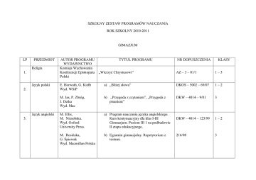 SZKOLNY ZESTAW PROGRAMÓW NAUCZANIA ROK SZKOLNY 2010-2011 GIMAZJUM LP PRZEDMIOT Religia 1. Język polski 2. Język angielski 3. AUTOR PROGRAMU WYDAWNCTWO Komisja Wychowania Konferencji Episkopatu Polski TYTUŁ PROGRAMU „Wierzyć Chrystusowi” NR DOPUSZCZENIA KLASY AZ – 3 – 01/1 1–3 E. Horwath, G. Kiełb Wyd. WSiP a) „Bliżej słowa” DKOS – 5002 – 69/07 1–2 M. Jas, P. Zbróg, J. Detka Wyd. Mac b) „Przygoda z czytaniem”, „Przygoda z pisaniem” DKW – 4014 – 9/01 3 M. Ellis, M. Niesobska. Wyd. Oxford University Press. a) Program nauczania języka angielskiego. Kurs kontynuacyjny dla klas I-III Gimnazjum. Poziom III 1 na podbudowie II etapu edukacyjnego. DKW – 4014 – 123/99 1–2 M. Rosińska, G. Śpiewak Wyd. Macmillan Polska b) Egzamin gimnazjalny. Repetytorium z testami. 216/08 3 Język rosyjski 4. R. Broniarz Wyd. WSiP. W. Gorczyca, B. Lipska-Gorczyca. Wyd. Rea. 97/1/2009 1 b) Program nauczania języka rosyjskiego w gimnazjum. Kurs dla początkujących. 97/2/2010 2 c) Program nauczania języka rosyjskiego w gimnazjum od podstaw. 333/00 3 Język niemiecki D. Wieruszewska I. Nowicka Wyd. PWN Program nauczanie języka niemieckiego w klasach 1-3 gimnazjum, poziom podstawowy DKOW-5002-28/08 1 Muzyka A. Kreiner-Bogdańska Oficyna Edukacyjna – Krzysztof Pazdro Muzyka w gimnazjum DPN 5002 – 11/09 1 Historia A. Plucińska-Mieloch K.Błachowska a) „Bliżej historii” 61/1/2009 1 b) „Bliżej historii” 61/2/2009 2 c) Program nauczania historii DKW 4014-4/00 3 DKW 140/2009 1–3 5. 6. J. Drob, T. Panfil, E. Trzcionowski 7. a) Program nauczania języka rosyjskiego w gimnazjum. Kurs dla początkujących. Wiedza o społeczeństwie M. WesołowskaStanowska, W. Stanowski A. Filipiuk Wyd. PWN „Bliżej świata” Geografia 8. Biologia 9. Chemia 10. Fizyka 11. Matematyka 12. E. M. Tuz D. Szczypiński Wyd. Nowa Era a) „Planeta Nowa” – program nauczania geografii 7/1/2009 1 b) „Planeta Nowa” – program nauczania geografii 7/2/2009 2 c) „Planeta Nowa” – program nauczania geografii DKOS – 5002 – 1/05 3 E. Jastrzębska E. Pyłka – Gutowska Wyd. WSiP a) Bliżej biologii 74/1/2009 1 b) Bliżej biologii 74/2/2009 2 M. Kłyś K. Żbikowska - Zdun Wyd. Nowa Era c) Biologia Nowa Era 105/01 3 J. Kulawik T. Kulawik M. Litwin Wyd. Nowa Era a) Chemia Nowa Era 49/1/2009 1 b) Chemia Nowa Era 49/2/2001 2 c) Chemia Nowa Era DKW – 4014 -23/08 3 M. Braun W. Śliwa Wyd. Nowa Era a) „To jest fizyka”- Nowa Era I 73/1/2009 1 b) „To jest fizyka” – Nowa Era II 72/2/2009 2 A. Kaczorowska Wyd. Żak M. Dobrowolska Wyd. GWO c) Fizyka z astronomią DKW – 4014 – 98/99 3 a) „Matematyka z plusem” 168/1/2009 1 b) „Matematyka z plusem” 168/2/2010 2 c) „Matematyka z plusem” Informatyka 13. 14. 15. 16. Wychowanie fizyczne J. Pańczyk Wyd. Helion M. Śmiglewska Wyd. Bea – Bleja 169/3/08 3 162/2009 1–3 a) „Program wychowania fizycznego. III etap edukacyjny – Gimnazjum I-III Innowacja programu 1–2 b) „Program wychowania fizycznego. III etap edukacyjny – Gimnazjum I-III DKW – 4014 – 290/99 3 Informatyka dla europejczyka Zajęcia artystyczne – muzyka E. Wachowiak Wyd. Gawa Zajęcia artystyczne w gimnazjum MEN 273/2010 1–2 Zajęcia techniczne A. Kowalczyk U. Białka Wyd. OPERON Zajęcia techniczne – papieroplastyczne 199/2009 1 M. Boniecka D. Łazuchiewicz Wyd. WSiP Technika – czy wiesz co jesz DKW – 4014 – 224/99 3 Ewa Zielińska Autorski program zajęć plastyki. 2010/2011 2 M. Kwiecień Wyd. Mac J. Dynek „W tym cała sztuka” DKOS – 5002 – 50/07 3 Program szkolenia sportowego dla klas I-III chłopców z koszykówki w Gimnazjum nr 39 w ZS 68 w Warszawie Program autorski 1–3 Plastyka 17. 18. Szkolenie sportowe P. Wit S. Pastuszko Program szkolenia sportowego z piłki siatkowej dla klas I-III dziewcząt i chłopców w Gimnazjum nr 39 w ZS 68 w Warszawie Program autorski 1–3 19. Szkolenie sportowe Szkolenie sportowe A. Ochal M. Zakrzewski Program szkolenia sportowego z tenisa stołowego dziewcząt i chłopców dla klas I-III w Gimnazjum nr 39 w ZS 68 w Warszawie Program autorski 1–3 20. Wychowanie do życia w rodzinie T. Król Wyd. Rubikon „Wędrując ku dorosłości” 205/2009 1–2 21.