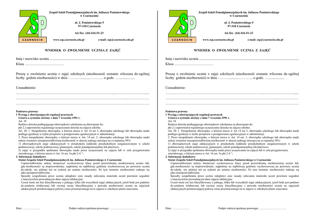 CZARNOCIN Zespół Szkół Ponadgimnazjalnych im. Juliusza Poniatowskiego w Czarnocinie Zespół Szkół Ponadgimnazjalnych im. Juliusza Poniatowskiego w Czarnocinie ul. J. Poniatowskiego 5 97-318 Czarnocin ul. J. Poniatowskiego 5 97-318 Czarnocin tel./fax (44) 616-51-23 tel./fax (44) 616-51-23 www.zsp.czarnocin.edu.pl e-mail: [email protected] CZARNOCIN www.zsp.czarnocin.edu.pl e-mail: [email protected] WNIOSEK O ZWOLNIENIE UCZNIA Z ZAJĘĆ WNIOSEK O ZWOLNIENIE UCZNIA Z ZAJĘĆ Imię i nazwisko ucznia ................................................................................................................ Klasa …………………………… Imię i nazwisko ucznia ................................................................................................................ Klasa …………………………… Proszę o zwolnienie ucznia z zajęć szkolnych (nieobecność zostanie wliczona do ogólnej liczby godzin nieobecności) w dniu : ………..........………... o godz. ….................. Proszę o zwolnienie ucznia z zajęć szkolnych (nieobecność zostanie wliczona do ogólnej liczby godzin nieobecności) w dniu : ………..........………... o godz. ….................. Uzasadnienie: …………………………….…………………………………………...……………………...... …………………………………………………………………………………..……………… …………………………………………………………………………………………….……. Uzasadnienie: …………………………….…………………………………………...……………………...... …………………………………………………………………………………..……………… …………………………………………………………………………………………….……. Podstawa prawna: 1 Wyciąg z obowiązujących regulacji prawnych Ustawa o systemie oświaty z dnia 7 września 1991 r. Art. 18 Rodzice dziecka podlegającego obowiązkowi szkolnemu są obowiązani do: pkt 2.) zapewnienia regularnego uczęszczania dziecka na zajęcia szkolne. Art. 20. 1. Niespełnienie obowiązku, o którym mowa w Art 14 ust 3, obowiązku szkolnego lub obowiązku nauki podlega egzekucji w trybie przepisów o postępowaniu egzekucyjnym w administracji. 2. Przez niespełnienie obowiązku, o którym mowa w Art. 14 ust. 3, obowiązku szkolnego lub obowiązku nauki należy rozumieć nieusprawiedliwioną nieobecność w okresie jednego miesiąca na co najmniej 50%: 1) obowiązkowych zajęć edukacyjnych w przedszkolu (oddziale przedszkolnym zorganizowanym w szkole podstawowej), szkole podstawowej, gimnazjum, szkole ponadgimnazjalnej lub placówce; 2) zajęć w przypadku spełniania obowiązku nauki przez uczęszczanie na zajęcia lub w celu przygotowania zawodowego, o którym mowa w Art. 16 ust. 5a pkt 2-4.”; 2. Informacje dodatkowe Statut Zespołu Szkół Ponadgimnazjalnych im. Juliusza Poniatowskiego w Czarnocinie Usprawiedliwienie należy dostarczyć wychowawczy klasy przed przewidzianą nieobecnością ucznia lub, gdy nieobecności są nieprzewidziane, najpóźniej na najbliższej godzinie wychowawczej po powrocie ucznia do szkoły, nie później niż na tydzień po ustaniu nieobecności. Po tym terminie nieobecności traktuje się jako nieusprawiedliwione. Sposoby uzupełniania przez ucznia zaległości oraz zasady zaliczania materiału uczeń powinien uzgodnić z nauczycielem prowadzącym dane zajęcia edukacyjne. Uczeń może nie być klasyfikowany z jednego, kilku lub wszystkich zajęć edukacyjnych, jeżeli brak jest podstaw do ustalenia śródrocznej lub rocznej oceny klasyfikacyjnej z powodu nieobecności ucznia na zajęciach edukacyjnych przekraczającej połowę czasu przeznaczonego na te zajęcia w szkolnym planie nauczania. Podstawa prawna: 1 Wyciąg z obowiązujących regulacji prawnych Ustawa o systemie oświaty z dnia 7 września 1991 r. Art. 18 Rodzice dziecka podlegającego obowiązkowi szkolnemu są obowiązani do: pkt 2.) zapewnienia regularnego uczęszczania dziecka na zajęcia szkolne. Art. 20. 1. Niespełnienie obowiązku, o którym mowa w Art 14 ust 3, obowiązku szkolnego lub obowiązku nauki podlega egzekucji w trybie przepisów o postępowaniu egzekucyjnym w administracji. 2. Przez niespełnienie obowiązku, o którym mowa w Art. 14 ust. 3, obowiązku szkolnego lub obowiązku nauki należy rozumieć nieusprawiedliwioną nieobecność w okresie jednego miesiąca na co najmniej 50%: 1) obowiązkowych zajęć edukacyjnych w przedszkolu (oddziale przedszkolnym zorganizowanym w szkole podstawowej), szkole podstawowej, gimnazjum, szkole ponadgimnazjalnej lub placówce; 2) zajęć w przypadku spełniania obowiązku nauki przez uczęszczanie na zajęcia lub w celu przygotowania zawodowego, o którym mowa w Art. 16 ust. 5a pkt 2-4.”; 2. Informacje dodatkowe Statut Zespołu Szkół Ponadgimnazjalnych im. Juliusza Poniatowskiego w Czarnocinie Usprawiedliwienie należy dostarczyć wychowawczy klasy przed przewidzianą nieobecnością ucznia lub, gdy nieobecności są nieprzewidziane, najpóźniej na najbliższej godzinie wychowawczej po powrocie ucznia do szkoły, nie później niż na tydzień po ustaniu nieobecności. Po tym terminie nieobecności traktuje się jako nieusprawiedliwione. Sposoby uzupełniania przez ucznia zaległości oraz zasady zaliczania materiału uczeń powinien uzgodnić z nauczycielem prowadzącym dane zajęcia edukacyjne. Uczeń może nie być klasyfikowany z jednego, kilku lub wszystkich zajęć edukacyjnych, jeżeli brak jest podstaw do ustalenia śródrocznej lub rocznej oceny klasyfikacyjnej z powodu nieobecności ucznia na zajęciach edukacyjnych przekraczającej połowę czasu przeznaczonego na te zajęcia w szkolnym planie nauczania. Data: ……………… Data: ……………… Podpis rodzica/opiekuna prawnego: ……
