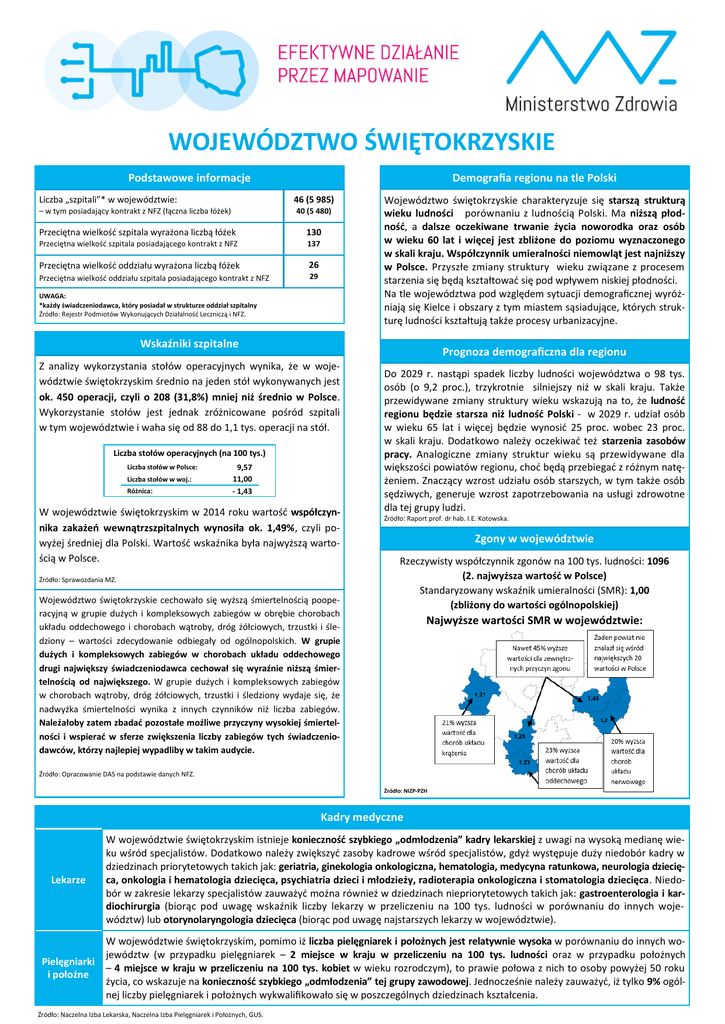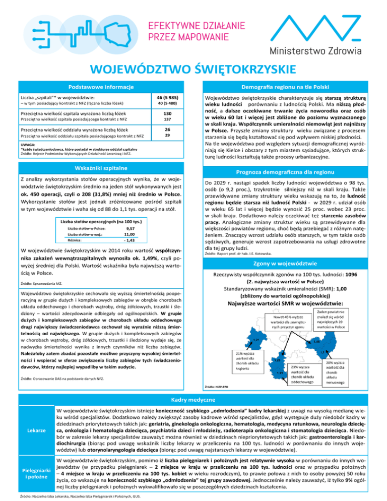 WOJEWÓDZTWO ŚWIĘTOKRZYSKIE Demografia regionu na tle Polski Podstawowe informacje Liczba „szpitali”* w województwie: 46 (5 985) – w tym posiadający kontrakt z NFZ (łączna liczba łóżek) 40 (5 480) Przeciętna wielkość szpitala wyrażona liczbą łóżek 130 Przeciętna wielkość szpitala posiadającego kontrakt z NFZ 137 Przeciętna wielkość oddziału wyrażona liczbą łóżek 26 Przeciętna wielkość oddziału szpitala posiadającego kontrakt z NFZ 29 UWAGA: *każdy świadczeniodawca, który posiadał w strukturze oddział szpitalny Źródło: Rejestr Podmiotów Wykonujących Działalność Leczniczą i NFZ. Województwo świętokrzyskie charakteryzuje się starszą strukturą wieku ludności porównaniu z ludnością Polski. Ma niższą płodność, a dalsze oczekiwane trwanie życia noworodka oraz osób w wieku 60 lat i więcej jest zbliżone do poziomu wyznaczonego w skali kraju. Współczynnik umieralności niemowląt jest najniższy w Polsce. Przyszłe zmiany struktury wieku związane z procesem starzenia się będą kształtować się pod wpływem niskiej płodności. Na tle województwa pod względem sytuacji demograficznej wyróżniają się Kielce i obszary z tym miastem sąsiadujące, których strukturę ludności kształtują także procesy urbanizacyjne. Wskaźniki szpitalne Prognoza demograficzna dla regionu Z analizy wykorzystania stołów operacyjnych wynika, że w województwie świętokrzyskim średnio na jeden stół wykonywanych jest ok. 450 operacji, czyli o 208 (31,8%) mniej niż średnio w Polsce. Wykorzystanie stołów jest jednak zróżnicowane pośród szpitali w tym województwie i waha się od 88 do 1,1 tys. operacji na stół. Liczba stołów operacyjnych (na 100 tys.) Liczba stołów w Polsce: Liczba stołów w woj.: Różnica: 9,57 11,00 - 1,43 W województwie świętokrzyskim w 2014 roku wartość współczynnika zakażeń wewnątrzszpitalnych wynosiła ok. 1,49%, czyli powyżej średniej dla Polski. Wartość wskaźnika była najwyższą wartością w Polsce. Źródło: Sprawozdania MZ. Województwo świętokrzyskie cechowało się wyższą śmiertelnością pooperacyjną w grupie dużych i kompleksowych zabiegów w obrębie chorobach układu oddechowego i chorobach wątroby, dróg żółciowych, trzustki i śledziony – wartości zdecydowanie odbiegały od ogólnopolskich. W grupie dużych i kompleksowych zabiegów w chorobach układu oddechowego drugi największy świadczeniodawca cechował się wyraźnie niższą śmiertelnością od największego. W grupie dużych i kompleksowych zabiegów w chorobach wątroby, dróg żółciowych, trzustki i śledziony wydaje się, że nadwyżka śmiertelności wynika z innych czynników niż liczba zabiegów. Należałoby zatem zbadać pozostałe możliwe przyczyny wysokiej śmiertelności i wspierać w sferze zwiększenia liczby zabiegów tych świadczeniodawców, którzy najlepiej wypadliby w takim audycie. Do 2029 r. nastąpi spadek liczby ludności województwa o 98 tys. osób (o 9,2 proc.), trzykrotnie silniejszy niż w skali kraju. Także przewidywane zmiany struktury wieku wskazują na to, że ludność regionu będzie starsza niż ludność Polski - w 2029 r. udział osób w wieku 65 lat i więcej będzie wynosić 25 proc. wobec 23 proc. w skali kraju. Dodatkowo należy oczekiwać też starzenia zasobów pracy. Analogiczne zmiany struktur wieku są przewidywane dla większości powiatów regionu, choć będą przebiegać z różnym natężeniem. Znaczący wzrost udziału osób starszych, w tym także osób sędziwych, generuje wzrost zapotrzebowania na usługi zdrowotne dla tej grupy ludzi. Źródło: Raport prof. dr hab. I.E. Kotowska. Zgony w województwie Rzeczywisty współczynnik zgonów na 100 tys. ludności: 1096 (2. najwyższa wartość w Polsce) Standaryzowany wskaźnik umieralności (SMR): 1,00 (zbliżony do wartości ogólnopolskiej) Najwyższe wartości SMR w województwie: Źródło: Opracowanie DAS na podstawie danych NFZ. Źródło: NIZP-PZH Kadry medyczne Lekarze W województwie świętokrzyskim istnieje konieczność szybkiego „odmłodzenia” kadry lekarskiej z uwagi na wysoką medianę wieku wśród specjalistów. Dodatkowo należy zwiększyć zasoby kadrowe wśród specjalistów, gdyż występuje duży niedobór kadry w dziedzinach priorytetowych takich jak: geriatria, ginekologia onkologiczna, hematologia, medycyna ratunkowa, neurologia dziecięca, onkologia i hematologia dziecięca, psychiatria dzieci i młodzieży, radioterapia onkologiczna i stomatologia dziecięca. Niedobór w zakresie lekarzy specjalistów zauważyć można również w dziedzinach niepriorytetowych takich jak: gastroenterologia i kardiochirurgia (biorąc pod uwagę wskaźnik liczby lekarzy w przeliczeniu na 100 tys. ludności w porównaniu do innych województw) lub otorynolaryngologia dziecięca (biorąc pod uwagę najstarszych lekarzy w województwie). Pielęgniarki i położne W województwie świętokrzyskim, pomimo iż liczba pielęgniarek i położnych jest relatywnie wysoka w porównaniu do innych województw (w przypadku pielęgniarek – 2 miejsce w kraju w przeliczeniu na 100 tys. ludności oraz w przypadku położnych – 4 miejsce w kraju w przeliczeniu na 100 tys. kobiet w wieku rozrodczym), to prawie połowa z nich to osoby powyżej 50 roku życia, co wskazuje na konieczność szybkiego „odmłodzenia” tej grupy zawodowej. Jednocześnie należy zauważyć, iż tylko 9% ogólnej liczby pielęgniarek i położnych wykwalifikowało się w poszczególnych dziedzinach kształcenia. Źródło: Naczelna Izba Lekarska, Naczelna Izba Pielęgniarek i Położnych, GUS. Liczba łóżek w województwie Źródło: Opracowanie DAS na podstawie danych NFZ. Zasoby sprzętowe w szpitalach województwa Sprzęt Statystyki Analizator biochemiczny Gammakamera Litotrypter Aparat RTG z torem wizyjnym Tomograf komputerowy Rezonans magnetyczny 2,55 0,36 0,49 3,70 1,54 0,65 3,25 0,32 0,63 3,25 1,90 0,