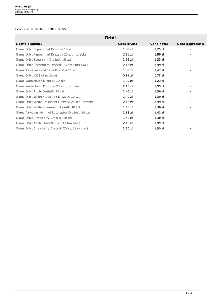 Hurtplus.pl http://www.hurtplus.pl [email protected] Cennik na dzień: 07-03-2017 08:55 Orbit Nazwa produktu Cena brutto Cena netto Cena poprzednia Guma Orbit Peppermint Drażetki 10 szt 1,35 zł 1,25 zł - Guma Orbit Peppermint Drażetki 25 szt ( torebka ) 2,15 zł 1,99 zł - Guma Orbit Spearmint Drażetki 10 szt 1,35 zł 1,25 zł - Guma Orbit Spearrmint Drażetki 25 szt ( torebka ) 2,15 zł 1,99 zł - Guma Airwaves Cool Casis Drażetki 10 szt 1,53 zł 1,42 zł - Guma Orbit KIDS (5 pasków) 0,81 zł 0,75 zł - Guma Winterfresh Drażetki 10 szt 1,33 zł 1,23 zł - Guma Winterfresh Drażetki 25 szt (torebka) 2,15 zł 1,99 zł - Guma Orbit Apple Drażetki 10 szt 1,40 zł 1,30 zł - Guma Orbit White Freshmint Drażetki 10 szt 1,40 zł 1,30 zł - Guma Orbit White Freshmint Drażetki 25 szt ( torebka ) 2,15 zł 1,99 zł - Guma Orbit White Spearmint Drażetki 10 szt 1,40 zł 1,30 zł - Guma Airwaves Menthol Eucalyptus Drażetki 10 szt 1,53 zł 1,42 zł - Guma Orbit Strawberry Drażetki 10 szt 1,40 zł 1,30 zł - Guma Orbit Apple Drażetki 25 szt ( torebka ) 2,15 zł 1,99 zł - Guma Orbit Strawberry Drażetki 25 szt ( torebka ) 2,15 zł 1,99 zł - 1/1 Powered by TCPDF (www.tcpdf.org)
