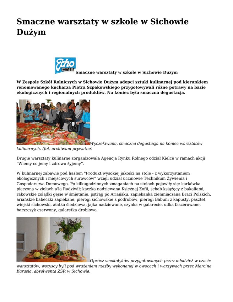 Smaczne warsztaty w szkole w Sichowie Dużym Smaczne warsztaty w szkole w Sichowie Dużym W Zespole Szkół Rolniczych w Sichowie Dużym adepci sztuki kulinarnej pod kierunkiem renomowanego kucharza Piotra Szpakowskiego przygotowywali różne potrawy na bazie ekologicznych i regionalnych produktów. Na koniec była smaczna degustacja. Wyczekiwana, smaczna degustacja na koniec warsztatów kulinarnych. (fot. archiwum prywatne) Drugie warsztaty kulinarne zorganizowała Agencja Rynku Rolnego odział Kielce w ramach akcji "Wiemy co jemy i zdrowo żyjemy”. W kulinarnej zabawie pod hasłem "Produkt wysokiej jakości na stole - z wykorzystaniem ekologicznych i miejscowych surowców” wzięli udział uczniowie Technikum Żywienia i Gospodarstwa Domowego. Po kilkugodzinnych zmaganiach na stołach pojawiły się: karkówka pieczona w ziołach a'la Radziwił; kaczka nadziewana Księżnej Zofii, schab książęcy z bakaliami, rakowskie żołądki gęsie w śmietanie, pstrąg po Ariańsku, zapiekanka ziemniaczana Braci Polskich, ariańskie babeczki zapiekane, pierogi sichowskie z podrobów, pierogi Babuni z kapusty, pasztet wiejski sichowski, ałatka śledziowa, jajka nadziewane, szynka w galarecie, udka faszerowane, barszczyk czerwony, galaretka drobiowa. Oprócz smakołyków przygotowanych przez młodzież w czasie warsztatów, wszyscy byli pod wrażeniem rzeźby wykonanej w owocach i warzywach przez Marcina Karasia, absolwenta ZSR w Sichowie. Źródło:echodnia.eu; 12.05.2011, /ps/ Gmina Rytwiany - www.rytwiany.com.pl