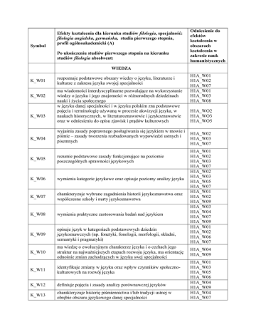 Symbol Efekty kształcenia dla kierunku studiów filologia, specjalność: filologia angielska, germańska, studia pierwszego stopnia, profil ogólnoakademicki (A) Po ukończeniu studiów pierwszego stopnia na kierunku studiów filologia absolwent: Odniesienie do efektów kształcenia w obszarach kształcenia w zakresie nauk humanistycznych WIEDZA K_W01 K_W02 K_W03 K_W04 rozpoznaje podstawowe obszary wiedzy o języku, literaturze i kulturze z zakresu języka swojej specjalności ma wiadomości interdyscyplinarne pozwalające na wykorzystanie wiedzy o języku i jego znajomości w różnorodnych dziedzinach nauki i życia społecznego w języku danej specjalności i w języku polskim zna podstawowe pojęcia i terminologię używaną w procesie akwizycji języka, w naukach historycznych, w literaturoznawstwie i językoznawstwie oraz w odniesieniu do opisu zjawisk i prądów kulturowych wyjaśnia zasady poprawnego posługiwania się językiem w mowie i piśmie – zasady tworzenia rozbudowanych wypowiedzi ustnych i pisemnych K_W05 rozumie podstawowe zasady funkcjonujące na poziomie poszczególnych sprawności językowych K_W06 wymienia kategorie językowe oraz opisuje poziomy analizy języka K_W07 charakteryzuje wybrane zagadnienia historii językoznawstwa oraz współczesne szkoły i nurty językoznawstwa K_W08 wymienia praktyczne zastosowania badań nad językiem K_W09 opisuje język w kategoriach podstawowych dziedzin językoznawczych (np. fonetyki, fonologii, morfologii, składni, semantyki i pragmatyki) K_W10 ma wiedzę o ewolucyjnym charakterze języka i o cechach jego struktur na najważniejszych etapach rozwoju języka, ma orientację odnośnie zmian zachodzących w języku swej specjalności K_W11 identyfikuje zmiany w języku oraz wpływ czynników społecznokulturowych na rozwój języka K_W12 definiuje pojęcia i zasady analizy porównawczej języków K_W13 charakteryzuje historię piśmiennictwa i/lub tradycji ustnej w obrębie obszaru językowego danej specjalności H1A_W01 H1A_W02 H1A_W07 H1A_W01 H1A_W03 H1A_W08 H1A_WO2 H1A_WO3 H1A_WO5 H1A_W02 H1A_W03 H1A_W07 H1A_W01 H1A_W02 H1A_W03 H1A_W07 H1A_W02 H1A_W03 H1A_W05 H1A_W07 H1A_W01 H1A_W02 H1A_W09 H1A_W03 H1A_W04 H1A_W07 H1A_W09 H1A_W01 H1A_W02 H1A_W06 H1A_W07 H1A_W04 H1A_W09 H1A_W01 H1A_W03 H1A_W05 H1A_W06 H1A_W04 H1A_W09 H1A_W04 H1A_W07 uwzględniającej kanon literatury – poezji, dramatu, prozy zna periodyzację dziejów literatury w krajach danej specjalności językowej oraz charakterystykę poszczególnych epok oraz najważniejszych nurtów, prądów i kierunków literackich zna twórczość najwybitniejszych przedstawicieli literatury danej specjalności językowej w kontekście epoki, w której tworzą lub tworzyli H1A_W09 K_W16 zna podstawową metodologię interpretacji dzieł literackich z uwzględnieniem ich kontekstu – kulturowego i historycznego K_W17 wymienia podstawowe pojęcia z zakresu poetyki i teorii literatury K_W18 ma elementarną, uporządkowaną wiedzę na temat historii i kultury krajów danej specjalności językowej H1A_W03 H1A_W05 H1A_W07 H1A_W02 H1A_W03 H1A_W04 H1A_W04 H1A_W05 H1A_W06 K_W14 K_W15 K_W21 ma podstawową wiedzę o współczesnym życiu kulturalnym i instytucjach kultury w krajach danej specjalności językowej rozpoznaje elementy materialne i symboliczne określające charakter wybranej kultury – środowisko geograficzne, instytucje, kontekst społeczny, polityczny i religijny zna psycholingwistyczne i glottodydaktyczne koncepcje akwizycji języka K_W22 zna podstawowe zagadnienia teorii komunikacji językowej K_W19 K_W20 H1A_W04 H1A_W06 H1A_W04 H1A_W10 H1A_W10 H1A_W04 H1A_W05 H1A_W010 H1A_W05 H1A_W06 H1A_W09 H1A_W03 H1A_W04 H1A_W09 UMIEJĘTNOŚCI K_U01 potrafi wykorzystać informacje o języku, literaturze i kulturze z zakresu wybranego języka w pracy zawodowej; K_U02 legitymuje się zbliżoną do rodzimej znajomością języka danej specjalności na poziomie biegłości C1 Europejskiego Systemu Opisu Kształcenia Językowego Rady Europy K_U03 potrafi posługiwać się językiem specjalistycznym niezbędnym w pracy zawodowej K_U04 wybiera sposób zastosowania interdyscyplinarnych kompetencji pozwalających na wykorzystanie wiedzy o języku i jego znajomości w różnorodnych dziedzinach nauki i życia społecznego K_U05 K_U06 K_U07 potrafi samodzielnie wyszukiwać, analizować, oceniać, selekcjonować i użytkować informacje, korzystając z różnych źródeł i nowoczesnych technologii potrafi ze zrozumieniem czytać, streszczać i interpretować teksty w języku danej specjalności potrafi czynnie uczestniczyć w dyskusjach prowadzonych w języku H1A_U03 H1A_U05 H1A_U010 H1A_U07 H1A_U08 H1A_U09 H1A_U010 H1A_U01 H1A_U06 H1A_U07 H1A_U010 H1A_U03 H1A_U04 H1A_U05 H1A_U06 H1A_U01 H1A_U10 H1A_W05 H1A_U10 H1A_U06 danej specjalności dotyczących różnych aspektów kulturowych, literaturoznawczych, historycznych i językoznawczych potrafi samodzielnie przygotowywać różnego rodzaju prace pisemne w języku danej specjalności, merytorycznie argumentując i formułując wnioski oraz korzystając z poglądów innych autorów w języku danej specjalności potrafi samodzielnie przygotowywać i przeprowadzać wystąpienia ustne dotyczące różnych aspektów językoznawczych, literaturoznawczych, historycznych i kulturowych kierując się wskazówkami opiekuna naukowego potrafi samodzielnie zdobywać wiedzę i rozwijać swe umiejętności badawcze w zakresie językoznawstwa, literaturoznawstwa, historii oraz wiedzy o kulturze krajów swej specjalności językowej H1A_U09 H1A_U10 H1A_U06 H1A_U08 H1A_U10 H1A_U06 H1A_U09 H1A_U10 K_U11 ocenia poprawne wykorzystanie języka w zakresie różnych rodzajów komunikacji językowej K_U12 potrafi stosować odpowiednie strategie komunikowania się w różnych sytuacjach społecznych K_U13 potrafi tworzyć teksty zróżnicowane stylistycznie i funkcjonalnie K_U14 potrafi wyrażać złożone sądy i opinie oraz posługiwać się językiem specjalistyc