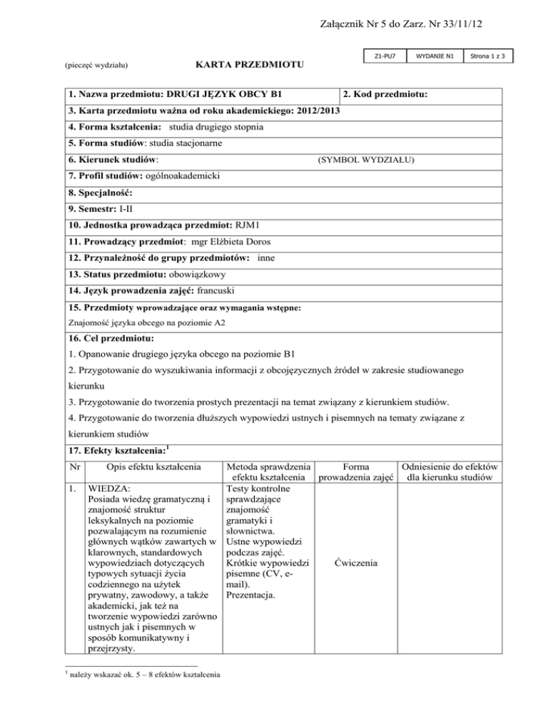 Załącznik Nr 5 do Zarz. Nr 33/11/12 Z1-PU7 (pieczęć wydziału) WYDANIE N1 Strona 1 z 3 KARTA PRZEDMIOTU 1. Nazwa przedmiotu: DRUGI JĘZYK OBCY B1 2. Kod przedmiotu: 3. Karta przedmiotu ważna od roku akademickiego: 2012/2013 4. Forma kształcenia: studia drugiego stopnia 5. Forma studiów: studia stacjonarne 6. Kierunek studiów: (SYMBOL WYDZIAŁU) 7. Profil studiów: ogólnoakademicki 8. Specjalność: 9. Semestr: I-II 10. Jednostka prowadząca przedmiot: RJM1 11. Prowadzący przedmiot: mgr Elżbieta Doros 12. Przynależność do grupy przedmiotów: inne 13. Status przedmiotu: obowiązkowy 14. Język prowadzenia zajęć: francuski 15. Przedmioty wprowadzające oraz wymagania wstępne: Znajomość języka obcego na poziomie A2 16. Cel przedmiotu: 1. Opanowanie drugiego języka obcego na poziomie B1 2. Przygotowanie do wyszukiwania informacji z obcojęzycznych źródeł w zakresie studiowanego kierunku 3. Przygotowanie do tworzenia prostych prezentacji na temat związany z kierunkiem studiów. 4. Przygotowanie do tworzenia dłuższych wypowiedzi ustnych i pisemnych na tematy związane z kierunkiem studiów 17. Efekty kształcenia:1 Nr 1. 1 Opis efektu kształcenia Metoda sprawdzenia Forma Odniesienie do efektów efektu kształcenia prowadzenia zajęć dla kierunku studiów WIEDZA: Testy kontrolne Posiada wiedzę gramatyczną i sprawdzające znajomość struktur znajomość leksykalnych na poziomie gramatyki i pozwalającym na rozumienie słownictwa. głównych wątków zawartych w Ustne wypowiedzi klarownych, standardowych podczas zajęć. wypowiedziach dotyczących Krótkie wypowiedzi Ćwiczenia typowych sytuacji życia pisemne (CV, ecodziennego na użytek mail). prywatny, zawodowy, a także Prezentacja. akademicki, jak też na tworzenie wypowiedzi zarówno ustnych jak i pisemnych w sposób komunikatywny i przejrzysty. należy wskazać ok. 5 – 8 efektów kształcenia 2. 3. UMIEJĘTNOŚCI: - Potrafi radzić sobie w większości sytuacji komunikacyjnych charakterystycznych dla danego obszaru językowego. - Rozumie znaczenie głównych wątków przekazu w jasnych, standardowych wypowiedziach dotyczących znanych jej spraw lub takich, którymi jest zainteresowana - Potrafi opisywać swoje doświadczenia w krótkich wypowiedziach ustnych i pisemnych, podając krótkie uzasadnienia, bądź wyjaśniając swoje opinie i poglądy. - Potrafi przygotować prezentacje na tematy związane z kierunkiem studiów - Potrafi przygotować dłuższe wypowiedzi ustne lub pisemne na tematy zawodowe. KOMPETENCJE SPOŁECZNE: - Rozumie potrzebę rozwijania umiejętności językowych przez całe życie - Potrafi pracować w grupie, przyjmując w niej różne cele - Rozumie różnice interkulturowe występujące między przedstawicielami różnych krajów. 18. Formy zajęć dydaktycznych i ich wymiar (liczba godzin): Ćwiczenia – Razem 60 h 19. Treści kształcenia: (oddzielnie dla każdej z form zajęć dydaktycznych W./Ćw./L./P./Sem.) Ćwiczenia: tematyka, słownictwo, funkcje komunikacyjne i struktury gramatyczne zgodne z „Europejskim Systemem Opisu Kształcenia Językowego” na poziomie A1 20. Egzamin: nie 21. Literatura podstawowa: Studio 60, niveau 2+ nagrania, Didier 2002 22. Literatura uzupełniająca: Jęz. francuski matura 2008+ nagrania, Wyd. Omega 2007; Grammaire- 350 exercices, niveau moyen, Hachette 2000; Prasa francuska 23. Nakład pracy studenta potrzebny do osiągnięcia efektów kształcenia Lp. Forma zajęć 1 Wykład 2 Ćwiczenia 3 Laboratorium / 4 Projekt / 5 Seminarium / 6 Inne / Suma godzin Liczba godzin kontaktowych / pracy studenta / 60 h / 60 h 60 h / 60 h 24. Suma wszystkich godzin: 120 25. Liczba punktów ECTS:2 4 26. Liczba punktów ECTS uzyskanych na zajęciach z bezpośrednim udziałem nauczyciela akademickiego 4 27. Liczba punktów ECTS uzyskanych na zajęciach o charakterze praktycznym (laboratoria, projekty) 26. Uwagi: Zatwierdzono: ……………………………. ………………………………………………… (data i podpis prowadzącego) (data i podpis dyrektora instytutu/kierownika katedry/ Dyrektora Kolegium Języków Obcych/kierownika lub dyrektora jednostki międzywydziałowej) 2 1 punkt ECTS – 30 godzin.