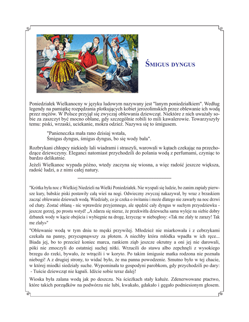 Śmigus dyngus Poniedziałek Wielkanocny w języku ludowym nazywany jest "lanym poniedziałkiem". Według legendy na pamiątkę rozpędzania plotkujących kobiet jerozolimskich przez oblewanie ich wodą przez mężów. W Polsce przyjął się zwyczaj oblewania dziewcząt. Niektóre z nich uważały sobie za zaszczyt być mocno oblane, gdy szczególnie robili to mili kawalerowie. Towarzyszyły temu: piski, wrzaski, uciekanie, mokra odzież. Nazywa się to śmigusem. "Panieneczka mała rano dzisiaj wstała, Śmigus dyngus, śmigus dyngus, bo się wody bała". Rozbrykani chłopcy niekiedy lali wiadrami i straszyli, warowali w kątach czekając na przechodzące dziewczyny. Eleganci natomiast przychodzili do polania wodą z perfumami, czyniąc to bardzo delikatnie. Jeżeli Wielkanoc wypada późno, wtedy zaczyna się wiosna, a więc radość jeszcze większa, radość ludzi, a z nimi całej natury. _____________________________________ "Krótka była noc z Wielkiej Niedzieli na Wielki Poniedziałek. Nie wyspali się ludzie, bo zanim zapiały pierwsze kury, babskie piski postawiły całą wieś na nogi. Odwieczny zwyczaj nakazywał, by wraz z brzaskiem zacząć oblewanie dziewuch wodą. Wiedziały, co je czeka o świtaniu i może dlatego nie zawarły na noc drzwi od chaty. Zostać oblaną - nic wprawdzie przyjemnego, ale spędzić cały dyngus w suchym przyodziewku jeszcze gorzej, po prostu wstyd! „A zdarza się nieraz, że przekwitła dziewucha sama wyleje na siebie dobry dzbanek wody w kącie obejścia i wybiegnie na drogę, krzycząc w niebogłosy: «Tak me zlały te zarazy! Tak me zlały»" "Oblewanie wodą w tym dniu to męski przywilej. Młodzież nie miarkowała i z cebrzykami czekała na panny, przycupnąwszy za płotem. A niechby która młódka wpadła w ich ręce... Biada jej, bo to przecież koniec marca, rankiem ziąb jeszcze okrutny a oni jej nie darowali, póki nie zmoczyli do ostatniej suchej nitki. Wrzucili do stawu albo zepchnęli z wysokiego brzegu do rzeki, bywało, że wtrącili i w koryto. Po takim śmigusie matka rodzona nie poznała niebogi! A z drugiej strony, to widać było, że ma panna powodzenie. Smutno było w tej chacie, w której miodki siedziały suche. Wypominała to gospodyni parobkom, gdy przychodzili po dary: - Tuście dziewcząt nie kąpali. Idźcie sobie teraz dalej! Wioska była zalana wodą jak po deszczu. Na ścieżkach stały kałuże. Zdenerwowane ptactwo, które takich porządków na podwórzu nie lubi, kwakało, gdakało i gęgało podniesionym głosem. Psy ujadały zajadle, bo je poczęstowano resztką wody z cebrzyka. Koty pochowały się w najciemniejsze kątki. Zabawa trwała na całego. Już nie tylko chłopcy uganiali się za dziewczętami, ale i gospodarz chlusnął kubkiem wody na okazały biust gospodyni. Gorset mokry... Gospodyni niby to się gniewała, ale przecie była rada, że i ona jeszcze nie taka ostatnia. Jutro odbije sobie za dzisiaj. Nazajutrz bowiem zmieniały się role i baby miały sprawiać dyngus-śmigus chłopom. Ale na razie jak Polska długa i szeroka trwało oblewania dziewcząt. Echo niosło piski, krzyki od Bałtyku po Karpaty. Nawet na dworze królewskim arystokratyczni kawalerowie dystyngowanie skraplali damy wodą różaną z flaszeczki. Trudno dzisiaj powiedzieć, jaki był sens tego zwyczaju, który przecież jest kontynuowany. W wielu okolicach w drugi dzień świąt wielkanocnych oblewano nie tylko kobiety, ale i ziemię, by spowodować większe plony." Cyt. Polskie tradycje świąteczne, Ewa Ferenc, Poznań 2000 _______________________________________ Na Pomorzu "Przed wielkanocnymi kolędnikami lub dyngownikami bądź śmigusami, smigielcami, dziewczęta na ogół starannie zamykały wejścia na klucz. Ale ci bardziej pomysłowi i wytrwali, często za zgoda rodziców dziewczyny lub po przekupieniu jej brata, już w niedzielę wieczorem chowali się na jakimś strychu czy w zapomnianej komórce, by przeczekać noc. O świcie zakradali się do sypialni i po odrzuceniu pierzyny śmigali swoje upatrzone ofiary po nogach i innych odsłoniętych nagościach. Wiele, nawet bardzo wiele, było przy tym krzyku i pisku. Wśród starszej młodzieży śmigus był wyrazem zalotów. Chłopcy wybierali się do domów swoich panien, bo powszechnie twierdzono, że kto mocniej smaga, ten bardziej kocha. Chłosta trwała tak długo, aż dziewczyna się uwolniła lub wykupiła datkiem wyrażonym w przyśpiewce: Śmigu, śmigu po dyngusie to są rany po Chrystusie Dyngu, dyngus, aja aja, nie chcę chleba, jeno jaja. Niekiedy wykup dawała matka, żałując smaganą córkę. Rózgowanie było dla dziewcząt karą za ich kuszenie i przesadną zalotność. Było czasem wiele bólu, ale każda chciała zostać wychłostana. W przeciwnym razie dziewczyna skazana była na wielki dyshonor, bo to znaczyło, że nie była godna niczyjej uwagi. Żeby uniknąć takiej „zniewagi" niejedna brzydula sama sobie wychłostała nogi, żeby wszyscy widzieli, że też ma swego adoratora. Zawsze przeważał ów symbol życia, jakim było jajko. Obrotni dyngownicy chodząc po takiej kolędzie wielkanocnej zarobili niejeden mendel barwnych jaj. Dlatego też to oni najchętniej uczestniczyli w zawodach jaj, bowiem mieli ich wiele. Zabawa polegała na wzajemnym zderzaniu wierzchołkami jajko o jajko. Wygrywał właściciel jajka nie uszkodzonego, zabierając to stłuczone. W dzień następny zaczynało się wszystko od początku: rewanżowały się dziewczęta, biczując chłopców. Mówią, że rewanż był zawsze sroższy. „Boże rany" chłopcom goiły się nawet aż do Zielonych Świątek." Cyt. Dawnych obyczajów rok cały. Miedzy wiarą, tradycją i obrzędem. R. Landowski, Pelplin 2000
