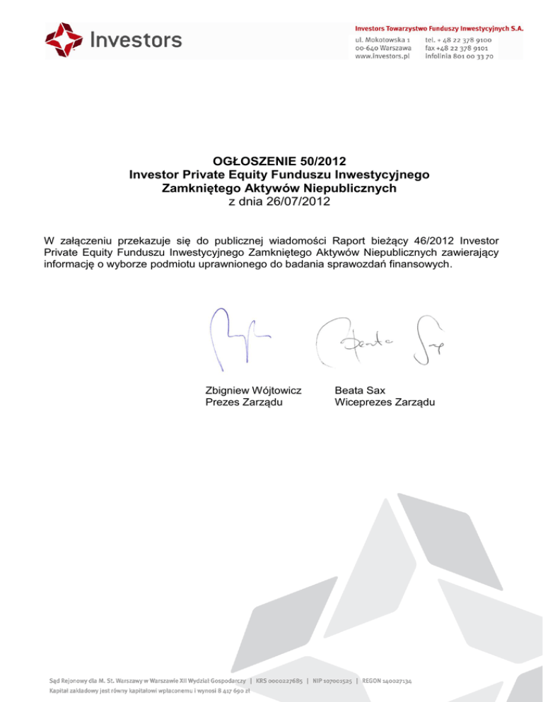 OGŁOSZENIE 50/2012 Investor Private Equity Funduszu Inwestycyjnego Zamkniętego Aktywów Niepublicznych z dnia 26/07/2012 W załączeniu przekazuje się do publicznej wiadomości Raport bieżący 46/2012 Investor Private Equity Funduszu Inwestycyjnego Zamkniętego Aktywów Niepublicznych zawierający informację o wyborze podmiotu uprawnionego do badania sprawozdań finansowych. Zbigniew Wójtowicz Prezes Zarządu Beata Sax Wiceprezes Zarządu INVESTOR PRIVATE EQUITY FIZ AN RB_FI_E 46 2012 korekta KOMISJANADZORUFINANSOWEGO Raport bieżący funduszu inwestycyjnego nr 46 / 2012 (numer kol ejny raportu / rok) Data przekazania: 2012-07-26 Nazwa podmiotu: INVESTOR PRIVATE EQUITY FUNDUSZ INWESTYCYJNY ZAMKNIĘTY AKTYWÓW NI Temat raportu: Wybór podmiotu uprawnionego do badania sprawozdań finansowyc h. Podstawa prawna § 42 ust. 1 pkt 34 oie - wybór podm. upraw do badania sprawozd. finansow. WIADOMOŚĆ Rada Nadzorcza Investors Towarzystwo Funduszy Inwestycyjnych Spółki Akcyjnej w dniu 26 lipca 2012 roku dokonała zgodnie z obowiązującymi przepisami i normami zawodowymi wyboru Ernst & Young Audit Sp. z o.o. z siedzibą w Warszawie, ul. Rondo ONZ 1, 00-124 Warszawa, wpisanej na listę podmiotów uprawnionych do badania sprawozdań finansowych prowadzoną przez Krajową Izbę Biegłych Rewidentów pod numerem 130 do przeprowadzenia przeglądu i badania sprawozdań finansowych Funduszu za 2012 rok. Fundusz korzystał wcześniej z usług wybranego podmiotu. Ernst & Young Audit Sp. z o.o. przeprowadziła przegląd i badanie sprawozdań finansowych Funduszu za 2011 rok. Umowa pomiędzy Funduszem a w/w podmiotem dotyczy przeprowadzenia przeglądu półrocznego jednostkowego sprawozdania finansowego oraz badania rocznego jednostkowego sprawozdania finansowego według stanu na dzień 31 grudnia 2012 r. Pli k Opi s PODPISYOSÓBREPREZENTUJĄCYCHPODMIOT Data Imię i Nazwi sko Stanowisko/Funkcja 2012-07-26 Piotr Dzi adek Wiceprezes Zarządu 2012-07-26 Dorota Winarska Prokurent Podpis Komisja Nadzoru Finansowego 1