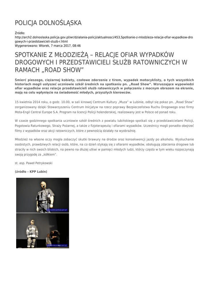 POLICJA DOLNOŚLĄSKA Źródło: http://arch2.dolnoslaska.policja.gov.pl/wr/dzialania-policji/aktualnosci/453,Spotkanie-z-mlodzieza-relacje-ofiar-wypadkow-dro gowych-i-przedstawicieli-sluzb-r.html Wygenerowano: Wtorek, 7 marca 2017, 08:46 SPOTKANIE Z MŁODZIEŻĄ – RELACJE OFIAR WYPADKÓW DROGOWYCH I PRZEDSTAWICIELI SŁUŻB RATOWNICZYCH W RAMACH „ROAD SHOW” Śmierć pieszego, ciężarnej kobiety, czołowe zderzenie z tirem, wypadek motocyklisty, o tych wszystkich historiach mogli usłyszeć uczniowie szkół średnich na spotkaniu pn. „Road Show”. Wzruszające wypowiedzi ofiar wypadków oraz relacje przedstawicieli służb ratowniczych w połączeniu z mocnym obrazem na ekranie, mają na celu wpłynięcie na świadomość młodych, przyszłych kierowców. 15 kwietnia 2014 roku, o godz. 10.00, w sali kinowej Centrum Kultury „Muza” w Lubinie, odbył się pokaz pn. „Road Show” zorganizowany dzięki Stowarzyszeniu Centrum Inicjatyw na rzecz poprawy Bezpieczeństwa Ruchu Drogowego oraz firmy Mota-Engil Central Europe S.A. Program na licencji Policji holenderskiej, realizowany jest w Polsce od ponad roku. W czasie godzinnego spotkania uczniowie szkół średnich z powiatu lubińskiego spotkali się z przedstawicielami Policji, Pogotowia Ratunkowego, Straży Pożarnej, a także z fizjoterapeutą i ofiarami wypadków. Uczestnicy mogli ponadto obejrzeć filmy z wypadków oraz akcji ratowniczych, które z pewnością działały na wyobraźnię. Młodzież na własne oczy mogła zobaczyć skutki brawury na drodze oraz konsekwencji jazdy po alkoholu. Wysłuchanie osobistych, prawdziwych relacji osób, które, na co dzień stykają się z ofiarami wypadków, obsługują zdarzenia drogowe lub straciły w nich swoich bliskich, na pewno na dłużej utkwi w pamięci młodych ludzi, którzy często w tym wieku rozpoczynają swoją przygodę za „kółkiem”. st. asp. Paweł Petrykowski (źródło – KPP Lubin) Zainstaluj wtyczkę Flash, aby zobaczyć odtwarzacz. pobierz film - 18.55 MB Ocena: 0/5 (0) Tweetnij