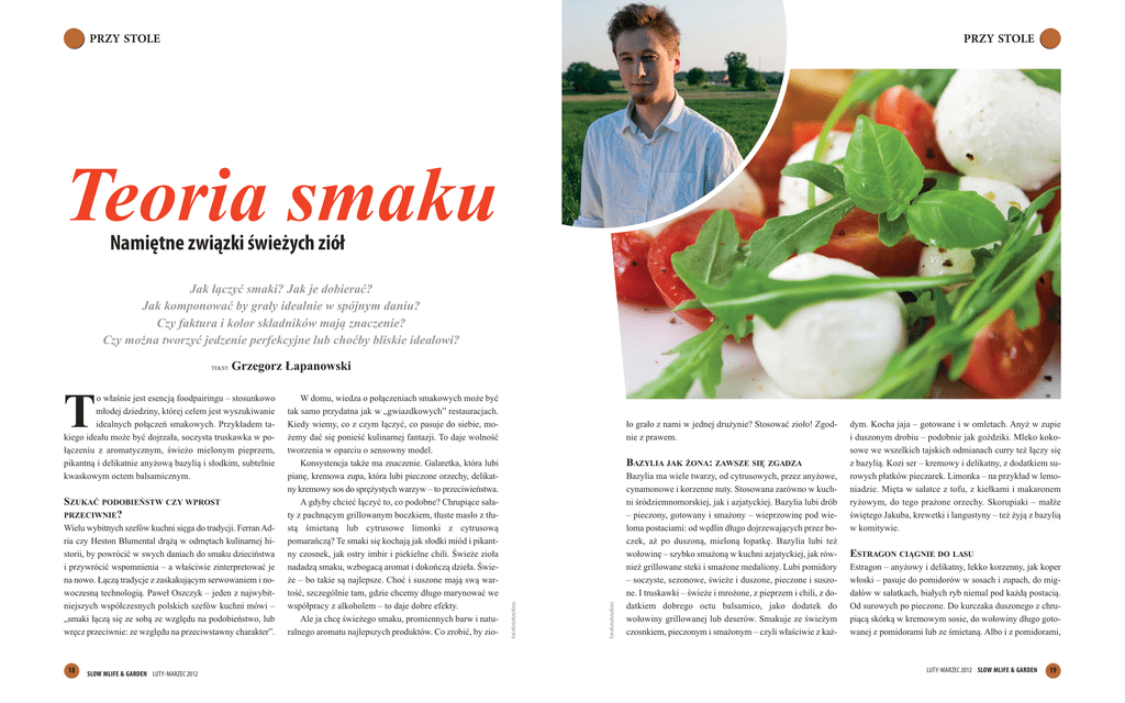 PRZY STOLE PRZY STOLE Teoria smaku Namiętne związki świeżych ziół Jak łączyć smaki? Jak je dobierać? Jak komponować by grały idealnie w spójnym daniu? Czy faktura i kolor składników mają znaczenie? Czy można tworzyć jedzenie perfekcyjne lub choćby bliskie ideałowi? Grzegorz Łapanowski T SZUKAĆ PODOBIEŃSTW CZY WPROST PRZECIWNIE? Wielu wybitnych szefów kuchni sięga do tradycji. Ferran Adria czy Heston Blumental drążą w odmętach kulinarnej historii, by powrócić w swych daniach do smaku dzieciństwa i przywrócić wspomnienia – a właściwie zinterpretować je na nowo. Łączą tradycje z zaskakującym serwowaniem i nowoczesną technologią. Paweł Oszczyk – jeden z najwybitniejszych współczesnych polskich szefów kuchni mówi – „smaki łączą się ze sobą ze względu na podobieństwo, lub wręcz przeciwnie: ze względu na przeciwstawny charakter”. 18 SLOW MLIFE & GARDEN LUTY-MARZEC 2012 W domu, wiedza o połączeniach smakowych może być tak samo przydatna jak w „gwiazdkowych” restauracjach. Kiedy wiemy, co z czym łączyć, co pasuje do siebie, możemy dać się ponieść kulinarnej fantazji. To daje wolność tworzenia w oparciu o sensowny model. Konsystencja także ma znaczenie. Galaretka, która lubi pianę, kremowa zupa, która lubi pieczone orzechy, delikatny kremowy sos do sprężystych warzyw – to przeciwieństwa. A gdyby chcieć łączyć to, co podobne? Chrupiące sałaty z pachnącym grillowanym boczkiem, tłuste masło z tłustą śmietaną lub cytrusowe limonki z cytrusową pomarańczą? Te smaki się kochają jak słodki miód i pikantny czosnek, jak ostry imbir i piekielne chili. Świeże zioła nadadzą smaku, wzbogacą aromat i dokończą dzieła. Świeże – bo takie są najlepsze. Choć i suszone mają swą wartość, szczególnie tam, gdzie chcemy długo marynować we współpracy z alkoholem – to daje dobre efekty. Ale ja chcę świeżego smaku, promiennych barw i naturalnego aromatu najlepszych produktów. Co zrobić, by zio- ło grało z nami w jednej drużynie? Stosować zioło! Zgodnie z prawem. BAZYLIA JAK ŻONA: ZAWSZE SIĘ ZGADZA fotofotofotofoto o właśnie jest esencją foodpairingu – stosunkowo młodej dziedziny, której celem jest wyszukiwanie idealnych połączeń smakowych. Przykładem takiego ideału może być dojrzała, soczysta truskawka w połączeniu z aromatycznym, świeżo mielonym pieprzem, pikantną i delikatnie anyżową bazylią i słodkim, subtelnie kwaskowym octem balsamicznym. fotofotofotofoto TEKST: Bazylia ma wiele twarzy, od cytrusowych, przez anyżowe, cynamonowe i korzenne nuty. Stosowana zarówno w kuchni śródziemnomorskiej, jak i azjatyckiej. Bazylia lubi drób – pieczony, gotowany i smażony – wieprzowinę pod wieloma postaciami: od wędlin długo dojrzewających przez boczek, aż po duszoną, mieloną łopatkę. Bazylia lubi też wołowinę – szybko smażoną w kuchni azjatyckiej, jak również grillowane steki i smażone medaliony. Lubi pomidory – soczyste, sezonowe, świeże i duszone, pieczone i suszone. I truskawki – świeże i mrożone, z pieprzem i chili, z dodatkiem dobrego octu balsamico, jako dodatek do wołowiny grillowanej lub deserów. Smakuje ze świeżym czosnkiem, pieczonym i smażonym – czyli właściwie z każ- dym. Kocha jaja – gotowane i w omletach. Anyż w zupie i duszonym drobiu – podobnie jak goździki. Mleko kokosowe we wszelkich tajskich odmianach curry też łączy się z bazylią. Kozi ser – kremowy i delikatny, z dodatkiem surowych płatków pieczarek. Limonka – na przykład w lemoniadzie. Mięta w sałatce z tofu, z kiełkami i makaronem ryżowym, do tego prażone orzechy. Skorupiaki – małże świętego Jakuba, krewetki i langustyny – też żyją z bazylią w komitywie. ESTRAGON CIĄGNIE DO LASU Estragon – anyżowy i delikatny, lekko korzenny, jak koper włoski – pasuje do pomidorów w sosach i zupach, do migdałów w sałatkach, białych ryb niemal pod każdą postacią. Od surowych po pieczone. Do kurczaka duszonego z chrupiącą skórką w kremowym sosie, do wołowiny długo gotowanej z pomidorami lub ze śmietaną. Albo i z pomidorami, LUTY-MARZEC 2012 SLOW MLIFE & GARDEN 19 PRZY STOLE Kolendra – trawiasta, cytrusowa i bardzo aromatyczna, kontrowersyjna. Ma ona swoich zagorzałych fanów i anty fanów. Lekko mydlana, idealna w większości miejsc, gdzie sprawdza się też natka pietruszki. Pasują do niej niemal wszystkie rodzaje mięs – w szczególności jagnięcina, drób i wołowina, jak również ryby, od surowych przez smażone, parowane i pieczone. Większość warzyw i cytrusy, a także owoce morza i orzechy nerkowca, sos sojowy, rybny i ostrygowy, chili, czosnek, imbir i korzenne przyprawy. Kolendra to jedno z najbardziej uniwersalnych ziół. KOPEREK, SAMA PROZA ŻYCIA Koper – mocny, trawiasty, ziemisty i świeży zarazem – lubi wędzone ryby, gotowane jaja i ziemniaki, w lekkich sałatkowych sosach także cytrynę, a nabiał na śniadanie 20 SLOW MLIFE & GARDEN LUTY-MARZEC 2012 ku i na patelni kochają się z majerankiem, po polsku – po prostu. ser, grzyby i pietruszka, groszek i fistaszki, arbuz, feta, cebula… i mięta, rzecz jasna – wielozadaniowa! MELISA NIE LUBI PIKANTERII OREGANO DZIAŁA Z JAJAMI Melisa – cytrusowa, odświeżająca, lekka i deserowa. Pasuje do kurczaka bo ten uwielbia cytrynę i limonki. Melisa, tak jak mięta zagra tam, gdzie potrzebny jest odświeżający aromat bez pikantnych nut. Z czekoladą i owocami, a gruszkami w szczególności, idzie w parze. Oregano – ostre w smaku, wytrawne, śródziemnomorskie, lubi sery twarde tak jak lubi pizzę, pomidory i czosnek. W gulaszu i ze spaghetti łączy się z oliwą, wieprzowiną, wołowiną i tymiankiem. Rankiem zadziała z jajami wybornie. MIĘTA NIEJEDNO MA IMIĘ PIETRUSZKA: A KTO TAM ZA NIĄ NADĄŻY Mięta – ma wiele twarzy i pewnie nikt nie zliczy jej odmian. Co ciekawe, tak w Azji, Europie, jak i w Ameryce Połudn