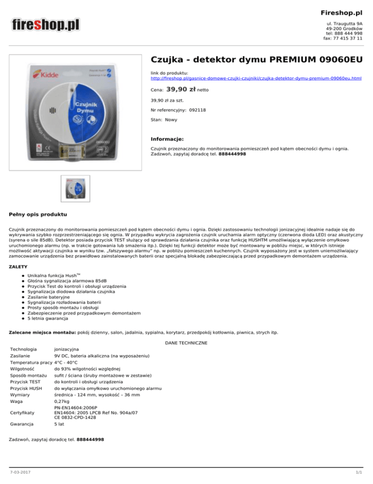 Fireshop.pl ul. Traugutta 9A 49-200 Grodków tel: 888 444 998 fax: 77 415 37 11 Czujka - detektor dymu PREMIUM 09060EU link do produktu: http://fireshop.pl/gasnice-domowe-czujki-czujniki/czujka-detektor-dymu-premium-09060eu.html Cena: 39,90 zł netto 39,90 zł za szt. Nr referencyjny: 092118 Stan: Nowy Informacje: Czujnik przeznaczony do monitorowania pomieszczeń pod kątem obecności dymu i ognia. Zadzwoń, zapytaj doradcę tel. 888444998 Pełny opis produktu Czujnik przeznaczony do monitorowania pomieszczeń pod kątem obecności dymu i ognia. Dzięki zastosowaniu technologii jonizacyjnej idealnie nadaje się do wykrywania szybko rozprzestrzeniającego się ognia. W przypadku wykrycia zagrożenia czujnik uruchamia alarm optyczny (czerwona dioda LED) oraz akustyczny (syrena o sile 85dB). Detektor posiada przycisk TEST służący od sprawdzania działania czujnika oraz funkcję HUSHTM umożliwiającą wyłączenie omyłkowo uruchomionego alarmu (np. w trakcie gotowania lub smażenia itp.). Dzięki tej funkcji detektor może być montowany w pobliżu miejsc, w których istnieje możliwość aktywacji czujnika w wyniku tzw. „fałszywego alarmu” np. w pobliżu pomieszczeń kuchennych. Czujnik wyposażony jest w system uniemożliwiający zamocowanie urządzenia bez prawidłowo zainstalowanych baterii oraz specjalną blokadę zabezpieczającą przed przypadkowym demontażem urządzenia. ZALETY Unikalna funkcja HushTM Głośna sygnalizacja alarmowa 85dB Przycisk Test do kontroli i obsługi urządzenia Sygnalizacja diodowa działania czujnika Zasilanie bateryjne Sygnalizacja rozładowania baterii Prosty sposób montażu i obsługi Zabezpieczenie przed przypadkowym demontażem 5 letnia gwarancja Zalecane miejsca montażu: pokój dzienny, salon, jadalnia, sypialna, korytarz, przedpokój kotłownia, piwnica, strych itp. DANE TECHNICZNE Technologia jonizacyjna Zasilanie 9V DC, bateria alkaliczna (na wyposażeniu) Temperatura pracy 4°C - 40°C Wilgotność do 93% wilgotności względnej Sposób montażu sufit / ściana (śruby montażowe w zestawie) Przycisk TEST do kontroli i obsługi urządzenia Przycisk HUSH do wyłączania omyłkowo uruchomionego alarmu Wymiary średnica - 124 mm, wysokość – 36 mm Waga 0,27kg Certyfikaty PN-EN14604:2006P EN14604: 2005 LPCB Ref No. 904a/07 CE 0832-CPD-1428 Gwarancja 5 lat Zadzwoń, zapytaj doradcę tel. 888444998 7-03-2017 1/1