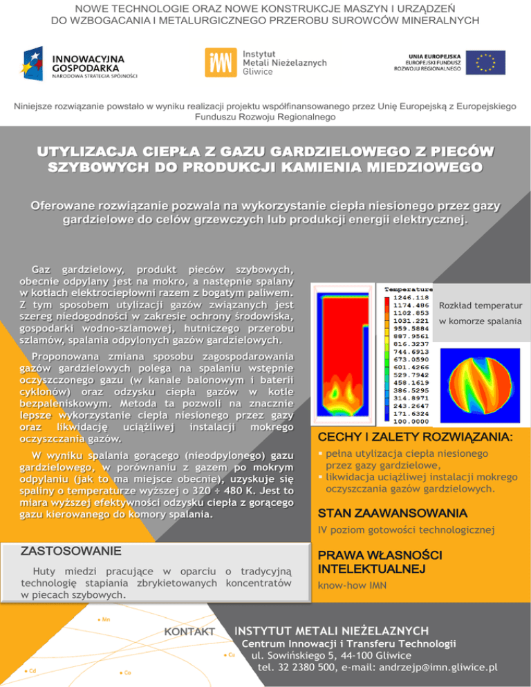 NOWE TECHNOLOGIE ORAZ NOWE KONSTRUKCJE MASZYN I URZĄDZEŃ DO WZBOGACANIA I METALURGICZNEGO PRZEROBU SUROWCÓW MINERALNYCH Niniejsze rozwiązanie powstało w wyniku realizacji projektu współfinansowanego przez Unię Europejską z Europejskiego Funduszu Rozwoju Regionalnego UTYLIZACJA CIEPŁA Z GAZU GARDZIELOWEGO Z PIECÓW SZYBOWYCH DO PRODUKCJI KAMIENIA MIEDZIOWEGO Oferowane rozwiązanie pozwala na wykorzystanie ciepła niesionego przez gazy gardzielowe do celów grzewczych lub produkcji energii elektrycznej. Gaz gardzielowy, produkt pieców szybowych, obecnie odpylany jest na mokro, a następnie spalany w kotłach elektrociepłowni razem z bogatym paliwem. Z tym sposobem utylizacji gazów związanych jest szereg niedogodności w zakresie ochrony środowiska, gospodarki wodno-szlamowej, hutniczego przerobu szlamów, spalania odpylonych gazów gardzielowych. Proponowana zmiana sposobu zagospodarowania gazów gardzielowych polega na spalaniu wstępnie oczyszczonego gazu (w kanale balonowym i baterii cyklonów) oraz odzysku ciepła gazów w kotle bezpaleniskowym. Metoda ta pozwoli na znacznie lepsze wykorzystanie ciepła niesionego przez gazy oraz likwidację uciążliwej instalacji mokrego oczyszczania gazów. W wyniku spalania gorącego (nieodpylonego) gazu gardzielowego, w porównaniu z gazem po mokrym odpylaniu (jak to ma miejsce obecnie), uzyskuje się spaliny o temperaturze wyższej o 320 ÷ 480 K. Jest to miara wyższej efektywności odzysku ciepła z gorącego gazu kierowanego do komory spalania. Rozkład temperatur w komorze spalania CECHY I ZALETY ROZWIĄZANIA: pełna utylizacja ciepła niesionego przez gazy gardzielowe, likwidacja uciążliwej instalacji mokrego oczyszczania gazów gardzielowych. STAN ZAAWANSOWANIA IV poziom gotowości technologicznej ZASTOSOWANIE Huty miedzi pracujące w oparciu o tradycyjną technologię stapiania zbrykietowanych koncentratów w piecach szybowych. KONTAKT PRAWA WŁASNOŚCI INTELEKTUALNEJ know-how IMN INSTYTUT METALI NIEŻELAZNYCH Centrum Innowacji i Transferu Technologii ul. Sowińskiego 5, 44-100 Gliwice tel. 32 2380 500, e-mail: [email protected]