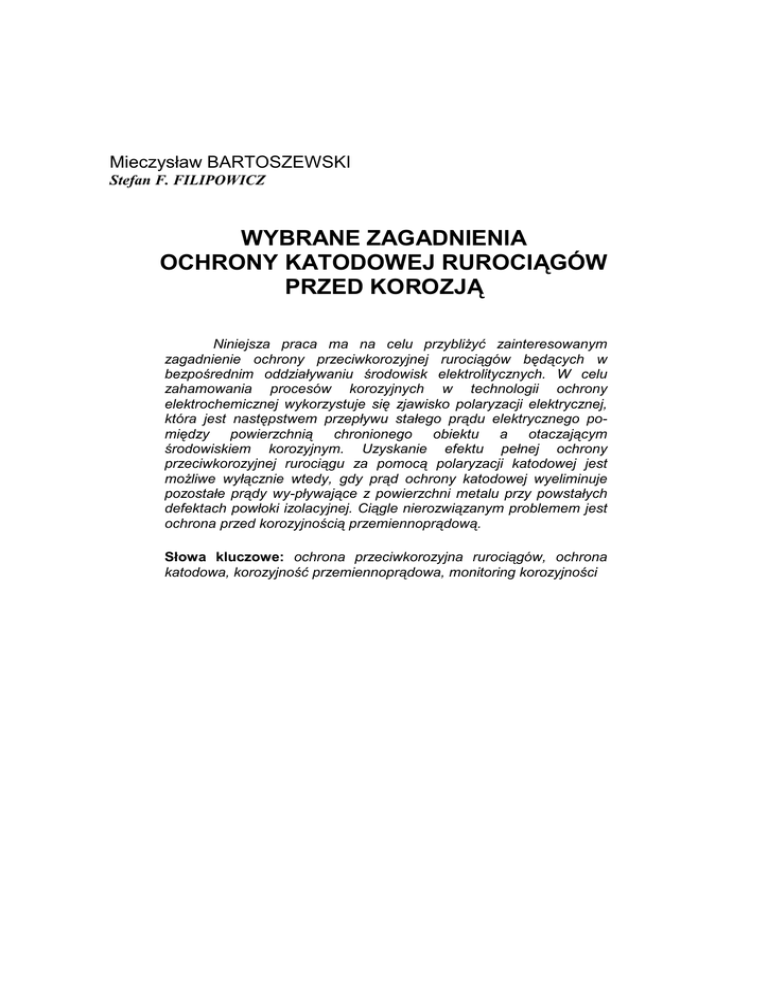 Mieczysław BARTOSZEWSKI Stefan F. FILIPOWICZ WYBRANE ZAGADNIENIA OCHRONY KATODOWEJ RUROCIĄGÓW PRZED KOROZJĄ Niniejsza praca ma na celu przybliŜyć zainteresowanym zagadnienie ochrony przeciwkorozyjnej rurociągów będących w bezpośrednim oddziaływaniu środowisk elektrolitycznych. W celu zahamowania procesów korozyjnych w technologii ochrony elektrochemicznej wykorzystuje się zjawisko polaryzacji elektrycznej, która jest następstwem przepływu stałego prądu elektrycznego pomiędzy powierzchnią chronionego obiektu a otaczającym środowiskiem korozyjnym. Uzyskanie efektu pełnej ochrony przeciwkorozyjnej rurociągu za pomocą polaryzacji katodowej jest moŜliwe wyłącznie wtedy, gdy prąd ochrony katodowej wyeliminuje pozostałe prądy wy-pływające z powierzchni metalu przy powstałych defektach powłoki izolacyjnej. Ciągle nierozwiązanym problemem jest ochrona przed korozyjnością przemiennoprądową. Słowa kluczowe: ochrona przeciwkorozyjna rurociągów, ochrona katodowa, korozyjność przemiennoprądowa, monitoring korozyjności