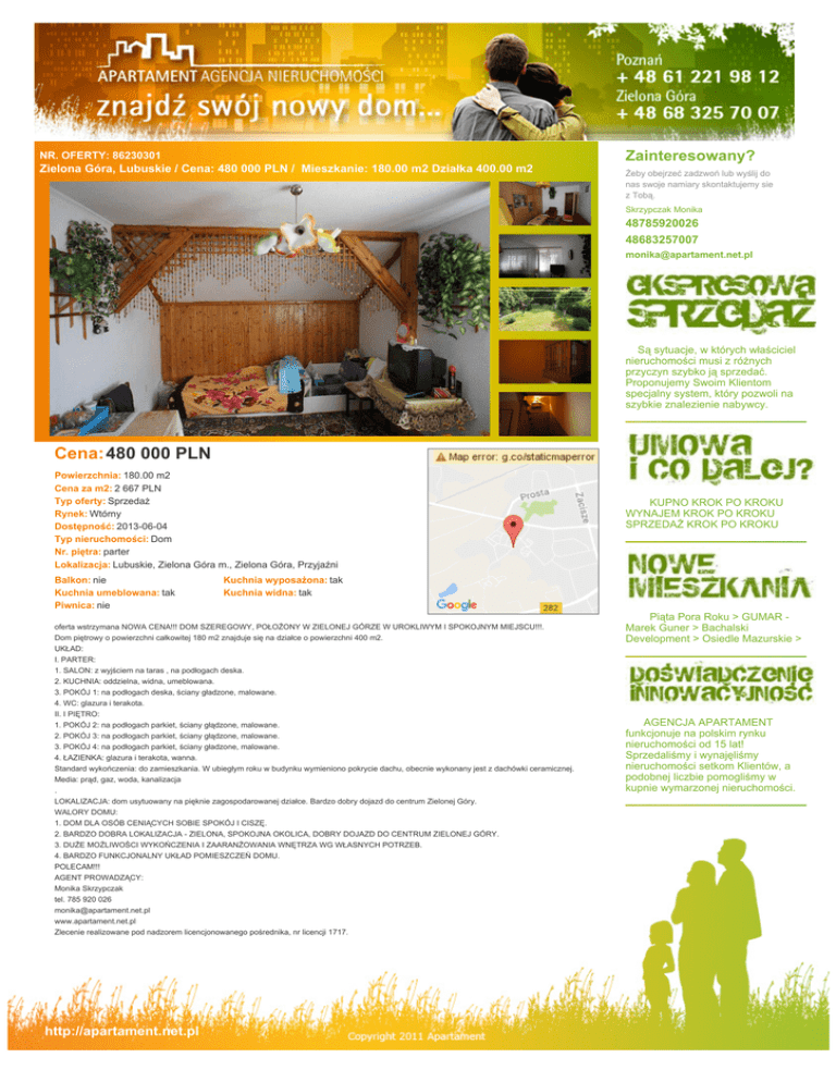 Zainteresowany? NR. OFERTY: 86230301 Zielona Góra, Lubuskie / Cena: 480 000 PLN / Mieszkanie: 180.00 m2 Działka 400.00 m2 Żeby obejrzeć zadzwoń lub wyślij do nas swoje namiary skontaktujemy sie z Tobą. Skrzypczak Monika 48785920026 48683257007 [email protected] Są sytuacje, w których właściciel nieruchomości musi z różnych przyczyn szybko ją sprzedać. Proponujemy Swoim Klientom specjalny system, który pozwoli na szybkie znalezienie nabywcy. Cena: 480 000 PLN Powierzchnia: 180.00 m2 Cena za m2: 2 667 PLN Typ oferty: Sprzedaż Rynek: Wtórny Dostępność: 2013-06-04 Typ nieruchomości: Dom Nr. piętra: parter Lokalizacja: Lubuskie, Zielona Góra m., Zielona Góra, Przyjaźni Balkon: nie Kuchnia umeblowana: tak Piwnica: nie Kuchnia wyposażona: tak Kuchnia widna: tak oferta wstrzymana NOWA CENA!!! DOM SZEREGOWY, POŁOŻONY W ZIELONEJ GÓRZE W UROKLIWYM I SPOKOJNYM MIEJSCU!!!. Dom piętrowy o powierzchni całkowitej 180 m2 znajduje się na działce o powierzchni 400 m2. UKŁAD: I. PARTER: 1. SALON: z wyjściem na taras , na podłogach deska. 2. KUCHNIA: oddzielna, widna, umeblowana. 3. POKÓJ 1: na podłogach deska, ściany gładzone, malowane. 4. WC: glazura i terakota. II. I PIĘTRO: 1. POKÓJ 2: na podłogach parkiet, ściany głądzone, malowane. 2. POKÓJ 3: na podłogach parkiet, ściany głądzone, malowane. 3. POKÓJ 4: na podłogach parkiet, ściany gładzone, malowane. 4. ŁAZIENKA: glazura i terakota, wanna. Standard wykończenia: do zamieszkania. W ubiegłym roku w budynku wymieniono pokrycie dachu, obecnie wykonany jest z dachówki ceramicznej. Media: prąd, gaz, woda, kanalizacja . LOKALIZACJA: dom usytuowany na pięknie zagospodarowanej działce. Bardzo dobry dojazd do centrum Zielonej Góry. WALORY DOMU: 1. DOM DLA OSÓB CENIĄCYCH SOBIE SPOKÓJ I CISZĘ. 2. BARDZO DOBRA LOKALIZACJA - ZIELONA, SPOKOJNA OKOLICA, DOBRY DOJAZD DO CENTRUM ZIELONEJ GÓRY. 3. DUŻE MOŻLIWOŚCI WYKOŃCZENIA I ZAARANŻOWANIA WNĘTRZA WG WŁASNYCH POTRZEB. 4. BARDZO FUNKCJONALNY UKŁAD POMIESZCZEŃ DOMU. POLECAM!!! AGENT PROWADZĄCY: Monika Skrzypczak tel. 785 920 026 [email protected] www.apartament.net.pl Zlecenie realizowane pod nadzorem licencjonowanego pośrednika, nr licencji 1717. http://apartament.net.pl KUPNO KROK PO KROKU WYNAJEM KROK PO KROKU SPRZEDAŻ KROK PO KROKU Piąta Pora Roku > GUMAR Marek Guner > Bachalski Development > Osiedle Mazurskie > AGENCJA APARTAMENT funkcjonuje na polskim rynku nieruchomości od 15 lat! Sprzedaliśmy i wynajęliśmy nieruchomości setkom Klientów, a podobnej liczbie pomogliśmy w kupnie wymarzonej nieruchomości.