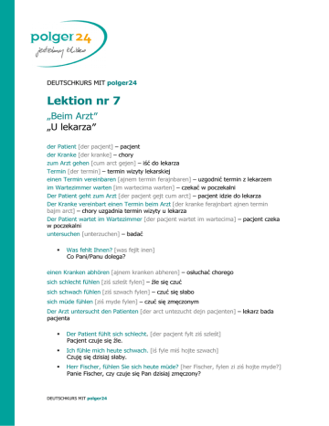 DEUTSCHKURS MIT polger24 Lektion nr 7 „Beim Arzt″ „U lekarza″ der Patient [der pacjent] – pacjent der Kranke [der kranke] – chory zum Arzt gehen [cum arct gejen] – iść do lekarza Termin [der termin] – termin wizyty lekarskiej einen Termin vereinbaren [ajnem termin ferajnbaren] – uzgodnić termin z lekarzem im Wartezimmer warten [im wartecima warten] – czekać w poczekalni Der Patient geht zum Arzt [der pacjent gejt cum arct] – pacjent idzie do lekarza Der Kranke vereinbart einen Termin beim Arzt [der kranke ferajnbart ajnen termin bajm arct] – chory uzgadnia termin wizyty u lekarza Der Patient wartet im Wartezimmer [der pacjent wartet im wartecima] – pacjent czeka w poczekalni untersuchen [unterzuchen] – badać Was fehlt Ihnen? [was fejlt inen] Co Pani/Panu dolega? einen Kranken abhören [ajnem kranken abheren] – osłuchać chorego sich schlecht fühlen [ziś szleśt fylen] – źle się czuć sich schwach fühlen [ziś szwach fylen] – czuć się słabo sich müde fühlen [ziś myde fylen] – czuć się zmęczonym Der Arzt untersucht den Patienten [der arct untezucht dejn pacjenten] – lekarz bada pacjenta Der Patient fühlt sich schlecht. [der pacjent fylt ziś szleśt] Pacjent czuje się źle. Ich fühle mich heute schwach. [iś fyle miś hojte szwach] Czuję się dzisiaj słaby. Herr Fischer, fühlen Sie sich heute müde? [her Fischer, fylen zi ziś hojte myde?] Panie Fischer, czy czuje się Pan dzisiaj zmęczony? DEUTSCHKURS MIT polger24 Wo haben Sie Schmerzen? Gdzie Pana boli? Mein Knie (Bein, Arm, Kopf, Magen, Fuß, Unterschenkel, Oberschenkel, Zeh, Ohr, Finger) tut mir weh. Boli mnie moje kolano, noga, ramię, głowa, żołądek, stopa, łydka, udo, palec u nogi, ucho, palec u ręki. Frau Fischer hat (starke) Kopfschmerzen (Magen-, Brust-, Arm-, Zahnschmerzen). Pani Fischer ma (ostry) ból głowy (żołądka, w piersiach, ramienia, zęba). Frau Fischer hat (kalte) Schweißausbrüche. Pani Fischer oblała się zimnym potem. Sie hat ein (starkes) Stechen in der Brust und im linken Arm. Ona ma (ostry) kłujący ból w piersi i w lewym ramienu. Sie hat seit zwei Tagen (starken) Durchfall, Husten. Ona od dwóch dni ma (ostrą) biegunkę, kaszel. Frau Fischer ist hingefallen, Ihr Fuß (Arm, Bein) ist geschwollen. Pani Fischer upadła, jej noga jest spuchnięta. Sie ist gestürzt und blutet am Kopf (Bein, Arm). Ona upadła i krwawi z rany na głowie (na nodze, na ramieniu). Sie ist gestürzt und blutet aus der Nase. Ona upadła i krwawi z nosa. Sie hat sich das Bein (den Fuß, den Arm, die Hand, den Kopf) verletzt. Ona skaleczyła sobie nogę (stopę, ramię, rękę, głowę). Sie ist am Fuß, Bein, Arm, Kopf (an der Hand) verletzt. Ona skaleczyła się w stopę, nogę, ramię, głowę. Das Bein muss verbunden werden. Ta noga musi być opatrzona. Es braucht einen Verband. Potrzebny jest opatrunek. Frau Fischer hat (starkes) Fieber. Pani Fischer ma ostre przeziębienie. Sie hat 42 Grad. Ona ma 42 stopnie. Sie müssen im Bett bleiben. Ona musi zostać w łóżku. Nehmen Sie zwei Tabletten dreimal täglich vor den Mahlzeiten. Proszę wziąć dwie tabletki trzy razy dziennie przed posiłkiem. Lassen Sie die Tabletten im Mund zergehen. Proszę zostawić tabletkę w ustach do rozpuszczenia. Schlucken Sie die Tabletten mit etwas Wasser. Proszę połknąć tabletkę z niewielką ilością wody. Reiben Sie (massieren Sie) die Salbe ein. Proszę wetrzeć (wmasować) maść. DEUTSCHKURS MIT polger24 Messen Sie regelmäßig den Blutdruck. Proszę mierzyć jej regularnie ciśnienie. Ihr Blutdruck ist 80 zu 150. Jej ciśnienie wynosi 80 na 150. Sie hat einen Puls von 120. Jej puls wynosi 120. Sie hat einen schwachen, unregelmäßigen Puls. Ona ma słaby, nieregularny puls. DEUTSCHKURS MIT polger24
