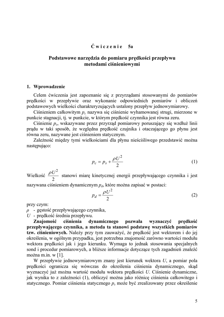 Ćwiczenie 5a Podstawowe narzędzia do pomiaru prędkości przepływu metodami ciśnieniowymi 1. Wprowadzenie Celem ćwiczenia jest zapoznanie się z przyrządami stosowanymi do pomiarów prędkości w przepływie oraz wykonanie odpowiednich pomiarów i obliczeń podstawowych wielkości charakteryzujących ustalony przepływ jednowymiarowy. Ciśnieniem całkowitym pc nazywa się ciśnienie wyhamowanej strugi, mierzone w punkcie stagnacji, tj. w punkcie, w którym prędkość czynnika jest równa zeru. Ciśnienie ps, wskazywane przez przyrząd pomiarowy poruszający się wzdłuŜ linii prądu w taki sposób, Ŝe względna prędkość czujnika i otaczającego go płynu jest równa zeru, nazywane jest ciśnieniem statycznym. ZaleŜność między tymi wielkościami dla płynu nieściśliwego przedstawić moŜna następująco: pc = p s + ρU 2 2 (1) ρU 2 stanowi miarę kinetycznej energii przepływającego czynnika i jest 2 nazywana ciśnieniem dynamicznym pd, które moŜna zapisać w postaci: ρU 2 pd = (2) 2 przy czym: ρ - gęstość przepływającego czynnika, U - prędkość średnia przepływu. Znajomość ciśnienia dynamicznego pozwala wyznaczyć prędkość przepływającego czynnika, a metoda ta stanowi podstawę wszystkich pomiarów tzw. ciśnieniowych. NaleŜy przy tym zauwaŜyć, Ŝe prędkość jest wektorem i do jej określenia, w ogólnym przypadku, jest potrzebna znajomość zarówno wartości modułu wektora prędkości jak i jego kierunku. Wymaga to jednak stosowania specjalnych sond i procedur pomiarowych, a bliŜsze informacje dotyczące tych zagadnień znaleźć moŜna m.in. w [1]. W przepływie jednowymiarowym znany jest kierunek wektora U, a pomiar pola prędkości ogranicza się wówczas do określenia ciśnienia dynamicznego, skąd wyznaczyć juŜ moŜna wartość modułu wektora prędkości U. Ciśnienie dynamiczne, jak wynika to z zaleŜności (1), obliczyć moŜna jako róŜnicę ciśnienia całkowitego i statycznego. Pomiar ciśnienia statycznego ps moŜe być zrealizowany przez określenie Wielkość 5 ciśnienia na ściance kanału lub za pomocą specjalnej sondy. Pierwsza z metod wymaga wywiercenia w ścianie przewodu otworu o średnicy zaleŜnej od charakteru przepływu, w którym dokonywany jest pomiar (zazwyczaj w większości zastosowań technicznych średnica ta wynosi 0,5 ÷ 1 mm) oraz połączenia go z manometrem. Czynnikami warunkującymi prawidłowy pomiar są: jednorodność strugi oraz dokładność wykonania otworu i brak pofalowania ścianki. JeŜeli przepływ jest niejednorodny i zachodzi potrzeba pomiaru ciśnienia statycznego w określonym jego punkcie, wówczas stosuje się specjalne sondy, których walcowa czułka jest zakończona kulistą powierzchnią (rys. 1). W miejscu, gdzie linie prądu po pewnym zakłóceniu spowodowanym opływem wierzchołka czułki są juŜ równoległe do ścianek sondy, wykonane są otworki pomiarowe, których średnica nie powinna przekraczać 0,1 d (d – średnica walcowej części sondy). Otwory te winny być starannie wykonane, a szczególną uwagę naleŜy zwracać na prostopadłość osi otworów do osi czułki oraz na gładkość powierzchni w okolicach tychŜe otworów. Warunkiem prawidłowości pomiaru ciśnienia statycznego za pomocą omawianej sondy jest równoległość osi czułki do linii prądu. Rys. 1. Sonda ciśnienia statycznego Zakres stosowalności sond tego typu jest ograniczony z jednej strony wpływem lepkości na pomiar, z drugiej zaś moŜliwością pojawienia się fali uderzeniowej przy opływie wierzchołka sondy. Pomiary mogą być zatem realizowane w zakresie, w którym są spełnione następujące warunki: U ⋅d U Re = > 800 oraz M = ≤ 0,85 (3) ν a gdzie: Re - liczba Reynoldsa, M - liczba Macha, U - prędkość średnia, ν - kinematyczny współczynnik lepkości płynu, d - średnica czułki sondy, a - lokalna prędkość dźwięku. Pomiar ciśnienia całkowitego wymaga uprzedniego wytworzenia punktu stagnacji, a schemat typowej sondy ciśnienia całkowitego (nazywanej rurką Pitota ciśnienia całkowitego) pokazano na rysunku 2. 6 Rys. 2. Czułka sondy ciśnienia całkowitego Podobnie jak w przypadku poprzedniej sondy, takŜe i czułka rurki Pitota ciśnienia całkowitego winna być ustawiona równolegle do kierunku przepływu i wówczas manometr połączony z sondą wskaŜe ciśnienie całkowite pc w badanym punkcie przepływu. Jak wskazał to eksperyment [2], poprzez odpowiednie ukształtowanie wlotu czułki moŜna zmniejszyć czułość sondy na kierunek napływu czynnika. Kształt wlotu czułki (pokazany na rys. 2) dopuszcza odchylenie osi czułki od kierunku linii prądu w zakresie ±15o, bez wprowadzania istotnych błędów w ocenie ciśnienia całkowitego. Podobnie jak w przypadku sond ciśnienia statycznego, na prawidłowość pomiaru sondami spiętrzającymi wpływa równieŜ lepkość czynnika, przy czym zakres prawidłowego pomiaru pc jest ograniczony następującymi warunkami: Ud U Re = > 60 oraz M = ≤ 1,05 (4) ν a MoŜliwe jest zastąpienie niezaleŜnych pomiarów ciśnienia całkowitego i statycznego bezpośrednim pomiarem ciśnienia dynamicznego przez zastosowanie tzw. statycznej rurki Pitota (często nazywanej sondą Prandtla), pokazanej na rys. 3. Rys. 3. Schemat budowy statycznej rurki Pitota i sposób pomiaru z jej wykorzystaniem Stanowi ona połączenie sondy Pitota ciśnienia całkowitego i sondy ciśnienia statycznego, a róŜnicowy pomiar ciśnień z obydwu jej króćców daje wskazania manometru proporcjonalne do ciśnienia dynamicznego pd. Zakres pomiarowy dla sond tego typu jest identyczny jak dla sond ciśnienia statycznego (wzór(3)). 7 2. Opis stanowiska pomiarowego W skład stanowiska pomiarowego, poza elementami pokazanymi na rys. 4, wchodzi wentylator promieniowy przetłaczający powietrze przez komorę wyrównawczą zakończoną dyszą, której zadaniem jest wyrównanie profilu prędkości. Końcówka pomiarowa to kołowy odcinek prostoosiowe