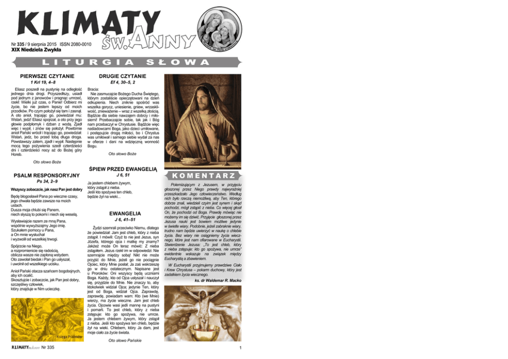 Nr 335 / 9 sierpnia 2015 ISSN 2080-0010 XIX Niedziela Zwykła L I T U R G I A S Ł O W A PIERWSZE CZYTANIE DRUGIE CZYTANIE Eliasz poszedł na pustynię na odległość jednego dnia drogi. Przyszedłszy, usiadł pod jednym z janowców i pragnąc umrzeć, rzekł: Wielki już czas, o Panie! Odbierz mi życie, bo nie jestem lepszy od moich przodków. Po czym położył się tam i zasnął. A oto anioł, trącając go, powiedział mu: Wstań, jedz! Eliasz spojrzał, a oto przy jego głowie podpłomyk i dzban z wodą. Zjadł więc i wypił, i znów się położył. Powtórnie anioł Pański wrócił i trącając go, powiedział: Wstań, jedz, bo przed tobą długa droga. Powstawszy zatem, zjadł i wypił. Następnie mocą tego pożywienia szedł czterdzieści dni i czterdzieści nocy aż do Bożej góry Horeb. Bracia: Nie zasmucajcie Bożego Ducha Świętego, którym zostaliście opieczętowani na dzień odkupienia. Niech zniknie spośród was wszelka gorycz, uniesienie, gniew, wrzaskliwość, znieważenie – wraz z wszelką złością. Bądźcie dla siebie nawzajem dobrzy i miłosierni! Przebaczajcie sobie, tak jak i Bóg nam przebaczył w Chrystusie. Bądźcie więc naśladowcami Boga, jako dzieci umiłowane, i postępujcie drogą miłości, bo i Chrystus was umiłował i samego siebie wydał za nas w ofierze i dani na wdzięczną wonność Bogu. 1 Krl 19, 4–8 Ef 4, 30–5, 2 Oto słowo Boże Oto słowo Boże PSALM RESPONSORYJNY Ps 34, 2–9 Wszyscy zobaczcie, jak nasz Pan jest dobry Będę błogosławił Pana po wieczne czasy, jego chwała będzie zawsze na moich ustach. Dusza moja chlubi się Panem, niech słyszą to pokorni i niech się weselą. Wysławiajcie razem ze mną Pana, wspólnie wywyższajmy Jego imię. Szukałem pomocy u Pana, a On mnie wysłuchał i wyzwolił od wszelkiej trwogi. Spójrzcie na Niego, a rozpromienicie się radością, oblicza wasze nie zapłoną wstydem. Oto zawołał biedak i Pan go usłyszał, i uwolnił od wszelkiego ucisku. Anioł Pański otacza szańcem bogobojnych, aby ich ocalić. Skosztujcie i zobaczcie, jak Pan jest dobry, szczęśliwy człowiek, który znajduje w Nim ucieczkę. ŚPIEW PRZED EWANGELIĄ J 6, 51 Ja jestem chlebem żywym, który zstąpił z nieba. Jeśli kto spożywa ten chleb, będzie żył na wieki... EWANGELIA J 6, 41–51 Żydzi szemrali przeciwko Niemu, dlatego że powiedział: Jam jest chleb, który z nieba zstąpił. I mówili: Czyż to nie jest Jezus, syn Józefa, którego ojca i matkę my znamy? Jakżeż może On teraz mówić: Z nieba zstąpiłem. Jezus rzekł im w odpowiedzi: Nie szemrajcie między sobą! Nikt nie może przyjść do Mnie, jeżeli go nie pociągnie Ojciec, który Mnie posłał; Ja zaś wskrzeszę go w dniu ostatecznym. Napisane jest u Proroków: Oni wszyscy będą uczniami Boga. Każdy, kto od Ojca usłyszał i nauczył się, przyjdzie do Mnie. Nie znaczy to, aby ktokolwiek widział Ojca; jedynie Ten, który jest od Boga, widział Ojca. Zaprawdę, zaprawdę, powiadam wam: Kto (we Mnie) wierzy, ma życie wieczne. Jam jest chleb życia. Ojcowie wasi jedli mannę na pustyni i pomarli. To jest chleb, który z nieba zstępuje: kto go spożywa, nie umrze. Ja jestem chlebem żywym, który zstąpił z nieba. Jeśli kto spożywa ten chleb, będzie żył na wieki. Chlebem, który Ja dam, jest moje ciało za życie świata. KOMENTARZ Polemizującym z Jezusem, w przyjęciu głoszonej przez Niego prawdy najwyraźniej przeszkadzało Jego człowieczeństwo. Według nich było rzeczą niemożliwą, aby Ten, którego dobrze znali, wiedzieli czyim jest synem i skąd pochodzi, mógł zstąpić z nieba. Co więcej głosił On, że pochodzi od Boga. Prawdę mówiąc nie możemy im się dziwić. Przyjęcie głoszonej przez Jezusa nauki jest bowiem możliwe jedynie w świetle wiary. Podobnie, jeżeli zabraknie wiary, trudno nam będzie uwierzyć w naukę o chlebie życia. Bez wiary nie osiągniemy życia wiecznego, które jest nam ofiarowane w Eucharystii. Stwierdzenie Jezusa: „To jest chleb, który z nieba zstępuje: kto go spożywa, nie umrze” ewidentnie wskazuje na związek między Eucharystią a zbawieniem. W Eucharystii przyjmujemy prawdziwe Ciało i Krew Chrystusa – pokarm duchowy, który jest zadatkiem życia wiecznego. ks. dr Waldemar R. Macko Oto słowo Pańskie Nr 335 1 KOMUNIKATY DUSZPASTERSKIE XIX Niedziela Zwykła – 9 sierpnia 2015 r. 4. W najbliższym czasie sakramentalny związek małżeński zawrą: – Marcin Rękawek, kawaler z parafii tutejszej i Kinga Dominika Szymańska, panna z parafii tutejszej – zapowiedź II; 1. Nabożeństwo różańcowe w intencji pielgrzymów zostanie odprawione o godz. 17.00. Po nabożeństwie modlić się będziemy w intencji zmarłych polecanych w wypominkach rocznych. 2. W tym tygodniu przypadają następujące wspomnienia liturgiczne: – w poniedziałek, 10 sierpnia, Wspomnienie św. Wawrzyńca, diakona i męczennika; – we wtorek, 11 sierpnia, Wspomnienie św. Klary, dziewicy; – w piątek, 14 sierpnia, Wspomnienie św. Maksymiliana Marii Kolbego, kapłana i męczennika; – w sobotę, 15 sierpnia, Uroczystość Wniebowzięcia NMP. Msze św. z uroczystości zostaną odprawione o godz.: 7.00, 12.00 i 18.00. Na każdej Mszy św. po komunii świętej poświęcimy kwiaty i owoce z naszych pól, działek i ogrodów. Każdy, kto by wiedział o przeszkodach zachodzących między narzeczonymi, zobowiązany jest powiadomić kancelarię parafialną. Narzeczonych polecamy modlitwie parafian. – Marek Jabłoński, kawaler z parafii pw. M.B. Miłosierdzia w Warszawie i Dorota Edyta Mazurek, panna z parafii tutejszej – zapowiedź II; – Andrzej Tołoczko, kawaler z parafii tutejszej i Anna Kołakowska, panna z parafii tutejszej – zapowiedź II; Wszystkim obchodzącym w tym tygodniu imieniny, składamy życzenia błogosławieństwa Bożego i wszelkiej pomyślności w życiu osobistym i zawodowym. 3. Taca z dzisiejszej niedzieli przeznaczona jest na potrzeby Katolickiego Uniwers
