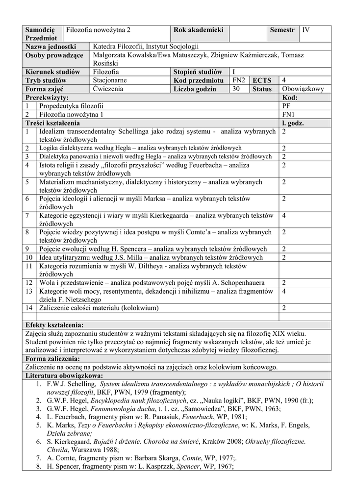 Filozofia nowożytna 2 Samoñcię Rok akademicki Semestr IV Przedmiot Katedra Filozofii, Instytut Socjologii Nazwa jednostki Osoby prowadzące Małgorzata Kowalska/Ewa Matuszczyk, Zbigniew Kaźmierczak, Tomasz Rosiński Filozofia Kierunek studiów Stopień studiów I Stacjonarne 4 Tryb studiów Kod przedmiotu FN2 ECTS Ćwiczenia 30 Forma zajęć Liczba godzin Status Obowiązkowy Prerekwizyty: Kod: 1 Propedeutyka filozofii PF 2 Filozofia nowożytna 1 FN1 Treści kształcenia l. godz. 1 Idealizm transcendentalny Schellinga jako rodzaj systemu - analiza wybranych 2 tekstów źródłowych Logika dialektyczna według Hegla – analiza wybranych tekstów źródłowych 2 2 3 Dialektyka panowania i niewoli według Hegla – analiza wybranych tekstów źródłowych 2 4 Istota religii i zasady „filozofii przyszłości” według Feuerbacha – analiza 2 wybranych tekstów źródłowych 5 Materializm mechanistyczny, dialektyczny i historyczny – analiza wybranych 2 tekstów źródłowych 6 Pojęcia ideologii i alienacji w myśli Marksa – analiza wybranych tekstów 2 źródłowych 7 Kategorie egzystencji i wiary w myśli Kierkegaarda – analiza wybranych tekstów 4 źródłowych 8 Pojęcie wiedzy pozytywnej i idea postępu w myśli Comte’a – analiza wybranych 2 tekstów źródłowych 9 Pojęcie ewolucji według H. Spencera – analiza wybranych tekstów źródłowych 2 10 Idea utylitaryzmu według J.S. Milla – analiza wybranych tekstów źródłowych 2 11 Kategoria rozumienia w myśli W. Diltheya - analiza wybranych tekstów źródłowych 12 Wola i przedstawienie – analiza podstawowych pojęć myśli A. Schopenhauera 2 13 Kategorie woli mocy, resentymentu, dekadencji i nihilizmu – analiza fragmentów 4 dzieła F. Nietzschego 14 Zaliczenie całości materiału (kolokwium) 2 Efekty kształcenia: Zajęcia służą zapoznaniu studentów z ważnymi tekstami składających się na filozofię XIX wieku. Student powinien nie tylko przeczytać co najmniej fragmenty wskazanych tekstów, ale też umieć je analizować i interpretować z wykorzystaniem dotychczas zdobytej wiedzy filozoficznej. Forma zaliczenia: Zaliczenie na ocenę na podstawie aktywności na zajęciach oraz kolokwium końcowego. Literatura obowiązkowa: 1. F.W.J. Schelling, System idealizmu transcendentalnego : z wykładów monachijskich ; O historii nowszej filozofii, BKF, PWN, 1979 (fragmenty); 2. G.W.F. Hegel, Encyklopedia nauk filozoficznych, cz. „Nauka logiki”, BKF, PWN, 1990 (fr.); 3. G.W.F. Hegel, Fenomenologia ducha, t. 1. cz. „Samowiedza”, BKF, PWN, 1963; 4. L. Feuerbach, fragmenty pism w: R. Panasiuk, Feuerbach, WP, 1981; 5. K. Marks, Tezy o Feuerbachu i Rękopisy ekonomiczno-filozoficzne, w: K. Marks, F. Engels, Dzieła zebrane; 6. S. Kierkegaard, Bojaźń i drżenie. Choroba na śmierć, Kraków 2008; Okruchy filozoficzne. Chwila, Warszawa 1988; 7. A. Comte, fragmenty pism w: Barbara Skarga, Comte, WP, 1977;. 8. H. Spencer, fragmenty pism w: L. Kasprzzk, Spencer, WP, 1967; 9. J. S. Mill, Utylitaryzm, Warszawa 2006; 10. W. Dilthey, fragmenty pism w: Z. Kuderowicz, Dilthey, WP, 1987; 11. A. Schopenhauer, Świat jako wola i przedstawienie, t. 1. Warszawa 1994 (fragmenty); 12. F. Nietzsche, Tako rzecze Zaratustra (To rzekł Zaratustra), Poza dobrem i złem, Wola mocy (fragmenty). Literatura uzupełniająca: Podpis osób prowadzących: Podpis kierownika jednostki: