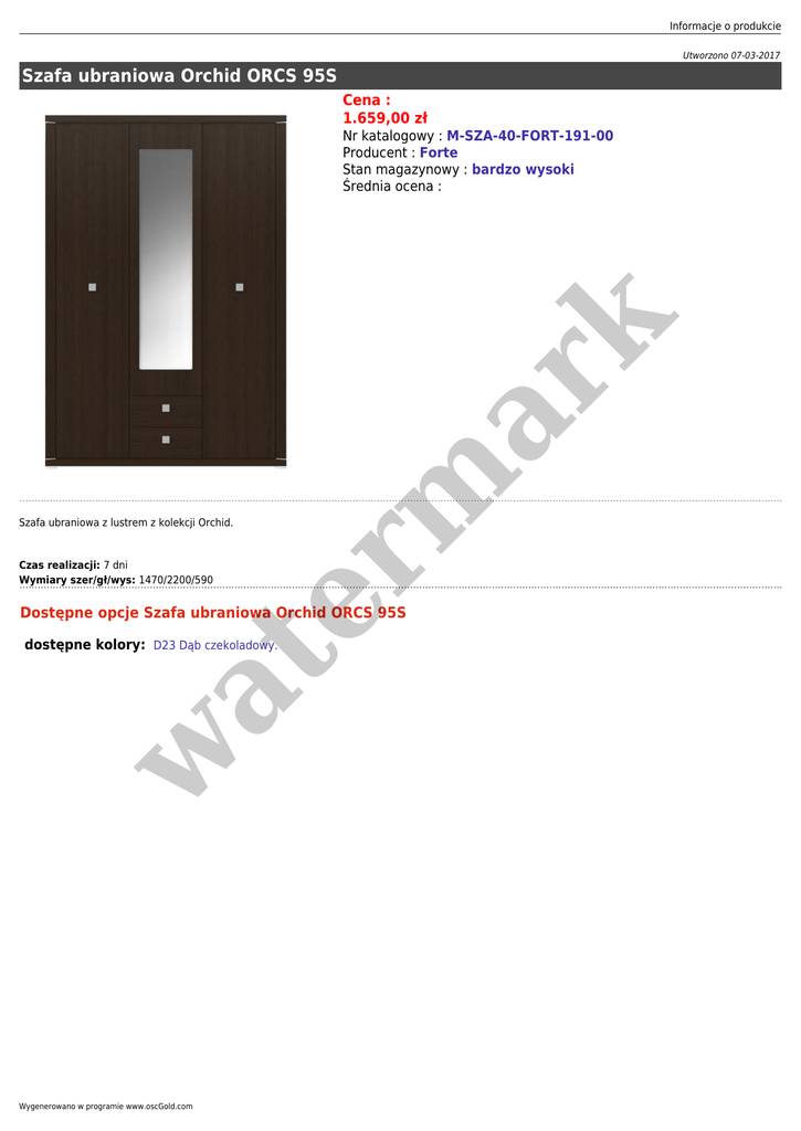 Informacje o produkcie Utworzono 07-03-2017 Szafa ubraniowa Orchid ORCS 95S Cena : 1.659,00 zł er m ar k Nr katalogowy : M-SZA-40-FORT-191-00 Producent : Forte Stan magazynowy : bardzo wysoki Średnia ocena : Szafa ubraniowa z lustrem z kolekcji Orchid. Czas realizacji: 7 dni Wymiary szer/gł/wys: 1470/2200/590 Dostępne opcje Szafa ubraniowa Orchid ORCS 95S w at dostępne kolory: D23 Dąb czekoladowy. Wygenerowano w programie www.oscGold.com