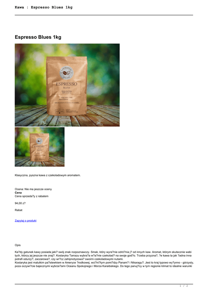 Kawa : Espresso Blues 1kg Espresso Blues 1kg Klasyczna, pyszna kawa z czekoladowym aromatem. Ocena: Nie ma jeszcze oceny Cena Cena sprzeda?y z rabatem 94,00 z? Rabat Zapytaj o produkt Opis Ka?dy gatunek kawy posiada jaki? swój znak rozpoznawczy. Smak, który wyra?nie odró?nia j? od innych kaw. Aromat, którym skutecznie wabi tych, którzy jej jeszcze nie znaj?. Kostaryka Tarrazu wybra?a w?a?nie czekolad? na swoje god?o. Trzeba przyzna?, ?e kawa ta jak ?adna inna potrafi odurzy?, zaczarowa?, czy wr?cz zahipnotyzowa? swoimi czekoladowymi nutami. Kostaryka jest malutkim pa?stewkiem w Ameryce ?rodkowej, wci?ni?tym pomi?dzy Panam? i Nikaragu?. Jest to kraj typowo wy?ynno - górzysty, poza oczywi?cie bajecznymi wybrze?ami Oceanu Spokojnego i Morza Karaibskiego. Do tego panuj?cy w tym regionie klimat to idealne warunki 1 / 2 Kawa : Espresso Blues 1kg do uprawy krzewów kawowca. Ale ?ród tych znakomitych obszarów wyró?ni? mo?emy dolin? Tarrazu. Tam ro?nie w?a?nie ten gatunek kawy, którego smakiem rozpoznawczym jest czekolada. ?yzne, powulkaniczne pod?o?e, odpowiednia wysoko?? oraz krystalicznie czyste powietrze sprawiaj?, ?e aromat tej kawy jest niepowtarzalny. Dzi?ki tej kawie ka?dy poranek b?dzie kojarzy? Ci si? ze zmys?owym aromatem gor?cej czekolady. Kawa Kostaryka Terrazu uprawiana wysoko w górach dojrzewa powoli, w idealnie ekologicznych warunkach, dzie? po dniu wype?niaj?c swe ziarna tym, co w naturze zdecydowanie najlepsze. Aromat orzechów w?oskich fantastycznie wspó?gra tutaj z nutami przypraw, tworz?c razem kompozycj? doskona??. 2 / 2 Powered by TCPDF (www.tcpdf.org)