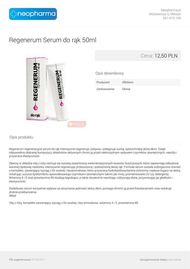 Neopharma.pl Mickiewicza 5, Mikstat 531-470-109 Regenerum Serum do rąk 50ml Cena: 12,50 PLN Opis słownikowy Producent Aflofarm Zastosowanie Dłonie Opis produktu Regenerum regeneracyjne serum do rąk intensywnie regeneruje, odżywia i pielęgnuje suchą, spierzchniętą skórę dłoni. Dzięki odpowiednio dobranej kompozycji składników aktywnych chroni ją przed niekorzystnym wpływem czynników zewnętrznych, nawilża i przywraca elastyczność. Obecny w składzie olej z róży cechuje się wysoką zawartością wielonienasyconych kwasów tłuszczowych, które zapewniają odbudowę warstwy lipidowej naskórka, intensywnie regenerując przesuszoną i podrażnioną skórę rąk. Formuła serum została wzbogacona również o kompleks, zawierający wyciąg z lilii wodnej i lipoaminokwas, który przywraca hydrolipidową barierę ochronną i wpływa kojąco na skórę, redukując uczucie dyskomfortu spowodowanego czynnikami zewnętrznymi takimi jak mróz, promieniowane UV czy detergenty. Witaminy A i E oraz prowitamina B5 działają łagodząco ,a także skutecznie nawilżają i odżywiają skórę, przywracając jej gładkość i elastyczność. Dodatkowo serum korzystnie wpływa na utrzymanie jędrności skóry dłoni, pomaga chronić ją przed fotostarzeniem oraz redukuje drobne przebarwienia. Skład Olej z róży, kompleks zawierający wyciąg z lilii wodnej i lipo aminokwas, witaminy A i E, prowitamina B5 Plik wygenerowano: 07-03-2017 Powered by TCPDF (www.tcpdf.org) Oprogramowanie sklepu: AptusShop