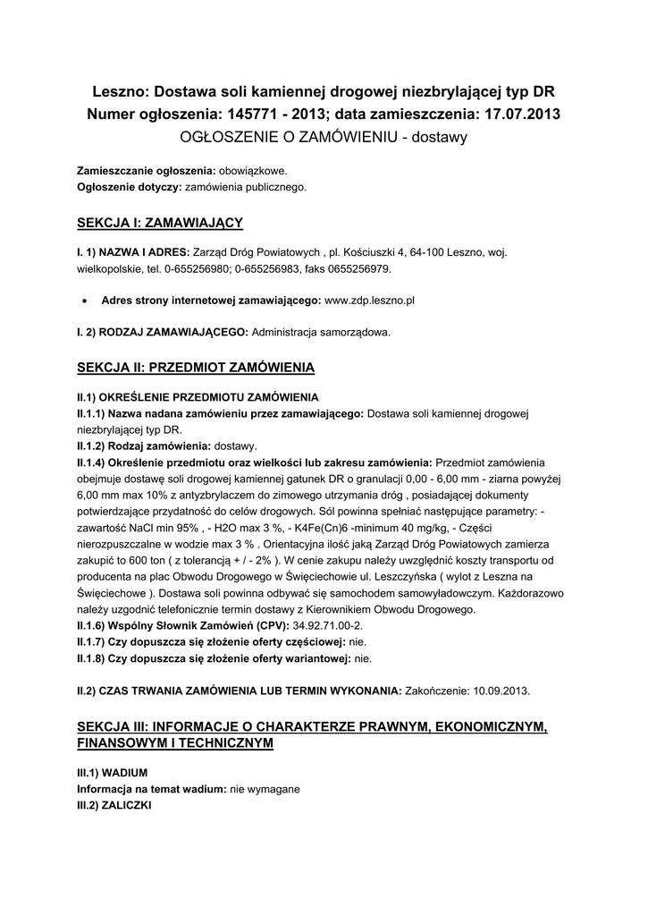 Leszno: Dostawa soli kamiennej drogowej niezbrylającej typ DR Numer ogłoszenia: 145771 - 2013; data zamieszczenia: 17.07.2013 OGŁOSZENIE O ZAMÓWIENIU - dostawy Zamieszczanie ogłoszenia: obowiązkowe. Ogłoszenie dotyczy: zamówienia publicznego. SEKCJA I: ZAMAWIAJĄCY I. 1) NAZWA I ADRES: Zarząd Dróg Powiatowych , pl. Kościuszki 4, 64-100 Leszno, woj. wielkopolskie, tel. 0-655256980; 0-655256983, faks 0655256979. Adres strony internetowej zamawiającego: www.zdp.leszno.pl I. 2) RODZAJ ZAMAWIAJĄCEGO: Administracja samorządowa. SEKCJA II: PRZEDMIOT ZAMÓWIENIA II.1) OKREŚLENIE PRZEDMIOTU ZAMÓWIENIA II.1.1) Nazwa nadana zamówieniu przez zamawiającego: Dostawa soli kamiennej drogowej niezbrylającej typ DR. II.1.2) Rodzaj zamówienia: dostawy. II.1.4) Określenie przedmiotu oraz wielkości lub zakresu zamówienia: Przedmiot zamówienia obejmuje dostawę soli drogowej kamiennej gatunek DR o granulacji 0,00 - 6,00 mm - ziarna powyżej 6,00 mm max 10% z antyzbrylaczem do zimowego utrzymania dróg , posiadającej dokumenty potwierdzające przydatność do celów drogowych. Sól powinna spełniać następujące parametry: zawartość NaCl min 95% , - H2O max 3 %, - K4Fe(Cn)6 -minimum 40 mg/kg, - Części nierozpuszczalne w wodzie max 3 % . Orientacyjna ilość jaką Zarząd Dróg Powiatowych zamierza zakupić to 600 ton ( z tolerancją + / - 2% ). W cenie zakupu należy uwzględnić koszty transportu od producenta na plac Obwodu Drogowego w Święciechowie ul. Leszczyńska ( wylot z Leszna na Święciechowe ). Dostawa soli powinna odbywać się samochodem samowyładowczym. Każdorazowo należy uzgodnić telefonicznie termin dostawy z Kierownikiem Obwodu Drogowego. II.1.6) Wspólny Słownik Zamówień (CPV): 34.92.71.00-2. II.1.7) Czy dopuszcza się złożenie oferty częściowej: nie. II.1.8) Czy dopuszcza się złożenie oferty wariantowej: nie. II.2) CZAS TRWANIA ZAMÓWIENIA LUB TERMIN WYKONANIA: Zakończenie: 10.09.2013. SEKCJA III: INFORMACJE O CHARAKTERZE PRAWNYM, EKONOMICZNYM, FINANSOWYM I TECHNICZNYM III.1) WADIUM Informacja na temat wadium: nie wymagane III.2) ZALICZKI III.3) WARUNKI UDZIAŁU W POSTĘPOWANIU ORAZ OPIS SPOSOBU DOKONYWANIA OCENY SPEŁNIANIA TYCH WARUNKÓW III. 3.1) Uprawnienia do wykonywania określonej działalności lub czynności, jeżeli przepisy prawa nakładają obowiązek ich posiadania Opis sposobu dokonywania oceny spełniania tego warunku o - ocena spełnienia warunku udziału w postępowaniu dokonana zostanie na podstawie złożonego oświadczenie o spełnianiu warunków udziału w postępowaniu wynikających z art. 22 ust.1 ustawy - Prawo zamówień publicznych. III.3.2) Wiedza i doświadczenie Opis sposobu dokonywania oceny spełniania tego warunku o - ocena spełnienia warunku udziału w postępowaniu dokonana zostanie na podstawie złożonego oświadczenie o spełnianiu warunków udziału w postępowaniu wynikających z art. 22 ust.1 ustawy - Prawo zamówień publicznych. III.3.3) Potencjał techniczny Opis sposobu dokonywania oceny spełniania tego warunku o - ocena spełnienia warunku udziału w postępowaniu dokonana zostanie na podstawie złożonego oświadczenie o spełnianiu warunków udziału w postępowaniu wynikających z art. 22 ust.1 ustawy - Prawo zamówień publicznych. III.3.4) Osoby zdolne do wykonania zamówienia Opis sposobu dokonywania oceny spełniania tego warunku o - ocena spełnienia warunku udziału w postępowaniu dokonana zostanie na podstawie złożonego oświadczenie o spełnianiu warunków udziału w postępowaniu wynikających z art. 22 ust.1 ustawy - Prawo zamówień publicznych. III.3.5) Sytuacja ekonomiczna i finansowa Opis sposobu dokonywania oceny spełniania tego warunku o - ocena spełnienia warunku udziału w postępowaniu dokonana zostanie na podstawie złożonego oświadczenie o spełnianiu warunków udziału w postępowaniu wynikających z art. 22 ust.1 ustawy - Prawo zamówień publicznych. III.4) INFORMACJA O OŚWIADCZENIACH LUB DOKUMENTACH, JAKIE MAJĄ DOSTARCZYĆ WYKONAWCY W CELU POTWIERDZENIA SPEŁNIANIA WARUNKÓW UDZIAŁU W POSTĘPOWANIU ORAZ NIEPODLEGANIA WYKLUCZENIU NA PODSTAWIE ART. 24 UST. 1 USTAWY III.4.1) W zakresie wykazania spełniania przez wykonawcę warunków, o których mowa w art. 22 ust. 1 ustawy, oprócz oświadczenia o spełnianiu warunków udziału w postępowaniu należy przedłożyć: III.4.2) W zakresie potwierdzenia niepodlegania wykluczeniu na podstawie art. 24 ust. 1 ustawy, należy przedłożyć: oświadczenie o braku podstaw do wykluczenia; aktualny odpis z właściwego rejestru lub z centralnej ewidencji i informacji o działalności gospodarczej, jeżeli odrębne przepisy wymagają wpisu do rejestru lub ewidencji, w celu wykazania braku podstaw do wykluczenia w oparciu o art. 24 ust. 1 pkt 2 ustawy, wystawiony nie wcześniej niż 6 miesięcy przed upływem terminu składania wniosków o dopuszczenie do udziału w postępowaniu o udzielenie zamówienia albo składania ofert; III.4.3) Dokumenty podmiotów zagranicznych Jeżeli wykonawca ma siedzibę lub miejsce zamieszkania poza terytorium Rzeczypospolitej Polskiej, przedkłada: III.4.3.1) dokument wystawiony w kraju, w którym ma siedzibę lub miejsce zamieszkania potwierdzający, że: nie otwarto jego likwidacji ani nie ogłoszono upadłości - wystawiony nie wcześniej niż 6 miesięcy przed upływem terminu składania wniosków o dopuszczenie do udziału w postępowaniu o udzielenie zamówienia albo składania ofert; III.4.4) Dokumenty dotyczące przynależności do tej samej grupy kapitałowej lista podmiotów należących do tej samej grupy kapitałowej w rozumieniu ustawy z dnia 16 lutego 2007 r. o ochronie konkurencji i konsumentów albo informacji o tym, że nie należy do grupy kapitałowej; III.5) INFORMACJA O DOKUMENTACH POTWIERDZAJĄCYCH, ŻE OFEROWANE DOSTAWY, USŁUGI LUB ROBOTY BUDOWLANE ODPOWIADAJĄ OKREŚLONYM WYMAGANIOM W zakresie potwierdzenia, że oferowane roboty budowlane, dostawy lub usługi odpowiadaj
