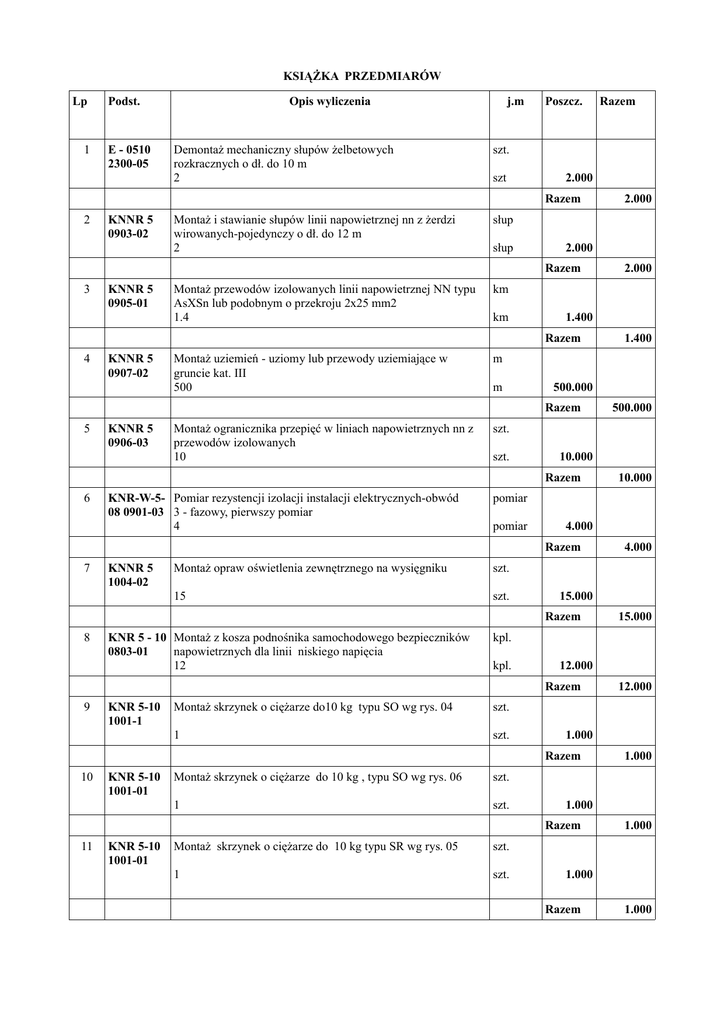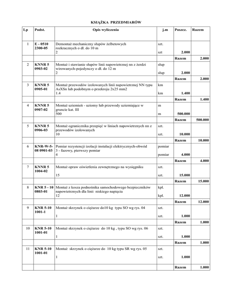 KSIĄŻKA PRZEDMIARÓW Lp 1 Podst. E - 0510 2300-05 Opis wyliczenia Demontaż mechaniczny słupów żelbetowych rozkracznych o dł. do 10 m 2 j.m Poszcz. szt. szt 2.000 Razem 2 KNNR 5 0903-02 Montaż i stawianie słupów linii napowietrznej nn z żerdzi wirowanych-pojedynczy o dł. do 12 m 2 KNNR 5 0905-01 Montaż przewodów izolowanych linii napowietrznej NN typu AsXSn lub podobnym o przekroju 2x25 mm2 1.4 słup 2.000 KNNR 5 0907-02 Montaż uziemień - uziomy lub przewody uziemiające w gruncie kat. III 500 km 1.400 KNNR 5 0906-03 Montaż ogranicznika przepięć w liniach napowietrznych nn z przewodów izolowanych 10 m 500.000 KNR-W-5- Pomiar rezystencji izolacji instalacji elektrycznych-obwód 08 0901-03 3 - fazowy, pierwszy pomiar 4 szt. 10.000 KNNR 5 1004-02 pomiar 4.000 Montaż opraw oświetlenia zewnętrznego na wysięgniku szt. 15 szt. KNR 5 - 10 Montaż z kosza podnośnika samochodowego bezpieczników 0803-01 napowietrznych dla linii niskiego napięcia 12 KNR 5-10 1001-1 kpl. 12.000 Montaż skrzynek o ciężarze do10 kg typu SO wg rys. 04 szt. 1 szt. KNR 5-10 1001-01 Montaż skrzynek o ciężarze do 10 kg , typu SO wg rys. 06 szt. 1 szt. KNR 5-10 1001-01 Montaż skrzynek o ciężarze do 10 kg typu SR wg rys. 05 szt. 1 szt. 1.000 1.000 Razem 11 12.000 1.000 Razem 10 15.000 kpl. Razem 9 4.000 15.000 Razem 8 10.000 pomiar Razem 7 500.000 szt. Razem 6 1.400 m Razem 5 2.000 km Razem 4 2.000 słup Razem 3 Razem 1.000 1.000 Razem 1.000