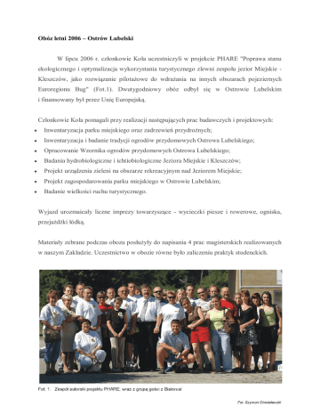Obóz letni 2006 – Ostrów Lubelski W lipcu 2006 r. członkowie Koła uczestniczyli w projekcie PHARE "Poprawa stanu ekologicznego i optymalizacja wykorzystania turystycznego zlewni zespołu jezior Miejskie Kleszczów, jako rozwiązanie pilotażowe do wdrażania na innych obszarach pojeziernych Euroregionu Bug" (Fot.1). Dwutygodniowy obóz odbył się w Ostrowie Lubelskim i finansowany był przez Unię Europejską. Członkowie Koła pomagali przy realizacji następujących prac badawczych i projektowych: Inwentaryzacja parku miejskiego oraz zadrzewień przydrożnych; Inwentaryzacja i badanie tradycji ogrodów przydomowych Ostrowa Lubelskiego; Opracowanie Wzornika ogrodów przydomowych Ostrowa Lubelskiego; Badania hydrobiologiczne i ichtiobiologiczne Jeziora Miejskie i Kleszczów; Projekt urządzenia zieleni na obszarze rekreacyjnym nad Jeziorem Miejskie; Projekt zagospodarowania parku miejskiego w Ostrowie Lubelskim; Badanie wielkości ruchu turystycznego. Wyjazd urozmaicały liczne imprezy towarzyszące - wycieczki piesze i rowerowe, ogniska, przejażdżki łódką. Materiały zebrane podczas obozu posłużyły do napisania 4 prac magisterskich realizowanych w naszym Zakładzie. Uczestnictwo w obozie równe było zaliczeniu praktyk studenckich.