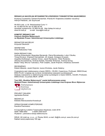 REDAKCJA NACZELNA WYDAWNICTW ŁÓDZKIEGO TOWARZYSTWA NAUKOWEGO Krystyna Czyżewska, Edward Karasiński, Wanda M. Krajewska (redaktor naczelny) Henryk Piekarski, Jan Szymczak 90-505 Łódź, ul. M. Skłodowskiej-Curie 11 tel. 42 665-54-59, fax 42 665-54-46 sprzedaż wydawnictw: 42 665-54-48, http://sklep.ltn.lodz.pl www.ltn.lodz.pl e-mail: [email protected] KOMITET REDAKCYJNY Centrum Studiów Wyborczych na Wydziale Prawa i Administracji Uniwersytetu Łódzkiego REDAKTOR NACZELNY Krzysztof Skotnicki SEKRETARZ Anna Rakowska-Trela RADA REDAKCYJNA Andrzej Antoszewski, Bogusław Banaszak, Olena Borysławska, Lubor Cibulka, Timea Drinóczi, Wojciech Hermeliński, Jiři Jirasek, Grzegorz Kryszeń, Angelika Nußberger, Ladislav Orosz, Jacek Raciborski, Viktor Rudenko, Oksana Szczerbaniuk, Andrzej Sokala, Haroldas Šinkūnas, Andrzej Szmyt, Beata Tokaj, Miruna Tudorascu, Piotr Uziębło, Jacek Wojnicki, Arkadiusz Żukowski RECENZENCI Robert Alberski, Jacek Wojnicki, Iwona Wrońska, Jacek Zaleśny Czasopismo jest indeksowane w bazie CEEOL, CEJSH, Copernicus, ProQuest, EBSCOhost, ERIH PLUS i znajduje się na liście ministerialnej czasopism punktowanych. Artykuły czasopisma w elektronicznej wersji są dostępne w bazie CEEOL, CEJSH, ProQuest, EBSCOhost, na portalu IBUK i ePNP. Tom XXII „Studiów Wyborczych” został dofinansowany przez Wydział Prawa i Administracji Uniwersytetu Łódzkiego oraz Krajowe Biuro Wyborcze PROJEKT OKŁADKI Agnieszka Roman REDAKCJA Elżbieta Marciszewska-Kowalczyk OPRACOWANIE KOMPUTEROWE Karolina Piechowicz © Copyright by Łódzkie Towarzystwo Naukowe, Łódź 2016 ISSN 1898-0082 e-ISSN 2450-9337 Wydanie I, pierwotna wersja elektroniczna DRUK: 2K Łódź sp. z o.o., ul. Płocka 35/43, e-mail: [email protected], www.2k.com.pl Nakład wersji papierowej 160 egz. SPIS TREŚCI STUDIA I ARTYKUŁY MICHAŁ PIERZGALSKI, PAWEŁ STĘPIEŃ Instytucjonalne uwarunkowania procedury zmiany granic okręgów wyborczych w Stanach Zjednoczonych Institutional determinants of redistricting in the United States of America MACIEJ RAKOWSKI Druga tura wyborów samorządowych – gwarancja demokracji czy zbędna dekoracja? The second round in the local elections – the guarranty of democracy or the useless decoration? 7 28 31 51 AGATA PYRZYŃSKA Głosowanie osób niepiśmiennych a zasada powszechności wyborów Voting by the illiterate and the principle of universal elections 53 73 MARTA GAŁĄZKA Prawa wyborcze mniejszości narodowych w państwach Grupy Wyszehradzkiej Electoral law of national minorities in Visegrad Countries 75 88 MARIA WINCŁAWSKA Głosy nieważne w wyborach do australijskiej Izby Reprezentantów 2001–2013 Informal votes in the Australian House of Representatives elections 2001–2013 89 104 GLOSA ANNA RAKOWSKA-TRELA Glosa do wyroku Trybunału Konstytucyjnego z 6 kwietnia 2016 r. w sprawie sygn. akt P 5/14 105 RECENZJA ANDRZEJ BISZTYGA Anna Rakowska-Trela, Kampania wyborcza w regulacji prawnej i w praktyce, Łódź 2015, ss. 477 115 BIBLIOGRAFIA PAWEŁ RAŹNY Polska bibliografia wyborczo-referendalna za 2015 rok 121 WYNIKI WYBORÓW I REFERENDÓW NA ŚWIECIE MAGDALENA WRZALIK Wyniki wyborów prezydenckich, parlamentarnych i referendów na świecie w okresie od 1 kwietnia do 30 września 2016 roku 141 Michał Pierzgalski*, Paweł Stępień** INSTYTUCJONALNE UWARUNKOWANIA PROCEDURY ZMIANY GRANIC OKRĘGÓW WYBORCZYCH W STANACH ZJEDNOCZONYCH Streszczenie Kształt i rozmiar okręgów wyborczych są zmiennymi mogącymi istotnie oddziaływać na wyniki wyborów. Z tego powodu, istotne znaczenie w objaśnianiu konsekwencji działania systemu wyborczego ma analiza procedur zmiany/tworzenia granic okręgów wyborczych. Celem artykułu jest analiza instytucjonalnych uwarunkowań tzw. redistrictingu, czyli procesu zmiany granic okręgów wyborczych w kilku wybranych amerykańskich stanach. W artykule odpowiadamy m.in. na następujące pytania: Jakie podstawowe procedury tworzenia okręgów wyborczych można zidentyfikować w USA? Jakie reguły tworzenia struktury okręgów wyborczych mają szczególne znaczenie z punktu widzenia ochrony przed gerrymanderingiem i malapportionmentem? Jakie podobieństwa (różnice) występują między modelami redistrictingu w Polsce i w USA? Słowa kluczowe: system wyborczy, redistricting, okręgi wyborcze. INSTITUTIONAL DETERMINANTS OF REDISTRICTING IN THE UNITED STATES OF AMERICA (summary) The shape and the magnitude of electoral districts may have a significant influence on the election results. Therefore, this is important to take the problem of districting/redistricting into account when studying the consequences of electoral systems. Our aim is to examine institutional determinants of redistricting in a few selected U.S. states. In this paper, we seek to find answers to the following questions: What are the legal requirements for districting/redistricting in U.S. states? Which legal rules of redistricting help to prevent gerrymandering and malapportionment? What similarities (differences) exist between models of districting/redistricting in Poland and in the USA? Keywords: electoral system, redistricting, electoral districts. * Dr, Katedra Systemów Politycznych, Wydział Studiów Międzynarodowych i Politologicznych, Uniwersytet Łódzki, [email protected]. ** Mgr, doktorant, Interdyscyplinarne Humanistyczne Studia Doktoranckie, Uniwersytet Łódzki, [email protected]. Maciej Rakowski* DRUGA TURA WYBORÓW SAMORZĄDOWYCH – GWARANCJA DEMOKRACJI CZY ZBĘDNA DEKORACJA? Streszczenie W artykule przedstawione zostały problemy związane z drugą turą wyborów wójtów, burmistrzów i prezydentów miast. Zgodnie z art. 473 k.w. przeprowadzenie drugiej rundy wyborów jest konieczne wówczas, gdy żaden z kandydatów nie uzyskał ponad połowy ważnie oddanych głosów. W ponownym głosowaniu, przeprowadzanym po 14 dniach, bierze udział dwóch kandydatów, którzy w pierwszym głosowaniu uzyskali największe liczby głosów. Autor zebrał dane dotycz