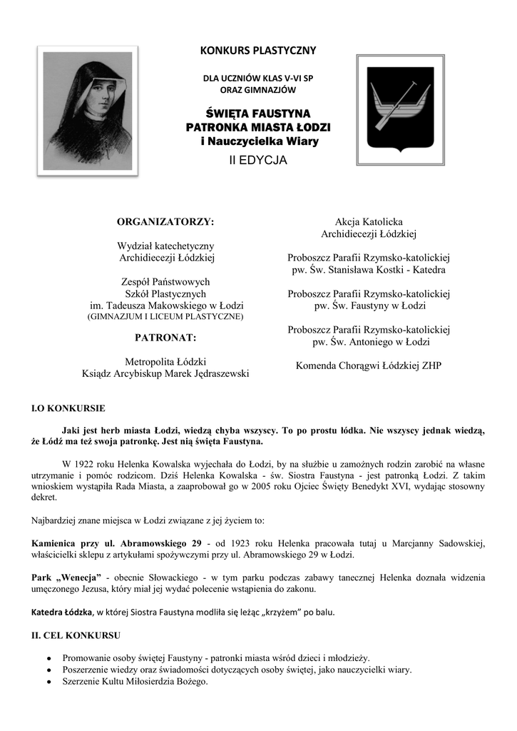 KONKURS PLASTYCZNY DLA UCZNIÓW KLAS V-VI SP ORAZ GIMNAZJÓW ŚWIĘTA FAUSTYNA PATRONKA MIASTA ŁODZI i Nauczycielka Wiary II EDYCJA ORGANIZATORZY: Wydział katechetyczny Archidiecezji Łódzkiej Zespół Państwowych Szkół Plastycznych im. Tadeusza Makowskiego w Łodzi Akcja Katolicka Archidiecezji Łódzkiej Proboszcz Parafii Rzymsko-katolickiej pw. Św. Stanisława Kostki - Katedra Proboszcz Parafii Rzymsko-katolickiej pw. Św. Faustyny w Łodzi (GIMNAZJUM I LICEUM PLASTYCZNE) PATRONAT: Proboszcz Parafii Rzymsko-katolickiej pw. Św. Antoniego w Łodzi Metropolita Łódzki Ksiądz Arcybiskup Marek Jędraszewski Komenda Chorągwi Łódzkiej ZHP I.O KONKURSIE Jaki jest herb miasta Łodzi, wiedzą chyba wszyscy. To po prostu łódka. Nie wszyscy jednak wiedzą, że Łódź ma też swoja patronkę. Jest nią święta Faustyna. W 1922 roku Helenka Kowalska wyjechała do Łodzi, by na służbie u zamożnych rodzin zarobić na własne utrzymanie i pomóc rodzicom. Dziś Helenka Kowalska - św. Siostra Faustyna - jest patronką Łodzi. Z takim wnioskiem wystąpiła Rada Miasta, a zaaprobował go w 2005 roku Ojciec Święty Benedykt XVI, wydając stosowny dekret. Najbardziej znane miejsca w Łodzi związane z jej życiem to: Kamienica przy ul. Abramowskiego 29 - od 1923 roku Helenka pracowała tutaj u Marcjanny Sadowskiej, właścicielki sklepu z artykułami spożywczymi przy ul. Abramowskiego 29 w Łodzi. Park „Wenecja” - obecnie Słowackiego - w tym parku podczas zabawy tanecznej Helenka doznała widzenia umęczonego Jezusa, który miał jej wydać polecenie wstąpienia do zakonu. Katedra Łódzka, w której Siostra Faustyna modliła się leżąc „krzyżem” po balu. II. CEL KONKURSU Promowanie osoby świętej Faustyny - patronki miasta wśród dzieci i młodzieży. Poszerzenie wiedzy oraz świadomości dotyczących osoby świętej, jako nauczycielki wiary. Szerzenie Kultu Miłosierdzia Bożego. Przedmiotem konkursu jest zilustrowanie faktu życia Świętej w naszym mieście, w tym roku jako nauczycielki wiary. III. ZASADY UCZESTNICTWA Konkurs skierowany jest do uczniów szkół podstawowych klas (V-VI) oraz gimnazjów znajdujących się na terenie Archidiecezji Łódzkiej. IV. WARUNKI UCZESTNICTWA Prace będą oceniane w kategoriach: rysunek, malarstwo oraz grafika komputerowa Format pracy: A3 Koszt przygotowania i dostarczenia pracy na konkurs ponosi uczestnik konkursu Każdy uczestnik może dostarczyć maksymalnie 1 prace Prace nie będą odsyłane i przechodzą na własność organizatora. Każda praca powinna być opatrzona na odwrocie informacją zawierającą dane: imię i nazwisko autora, wiek, klasa, nazwa i adres szkoły, tytuł, technika wykonania oraz imię i nazwisko nauczyciela pod którego kierunkiem praca została wykonana (wskazany mail i telefon) Organizatorom nie chodzi o klasyczny portret ale ukazanie jej jako uczącej nas wiary, np. w czasie modlitwy, w relacjach z innymi, itd… V. TERMIN NADSYŁANIA PRAC 31.01.2013 VI.TERMIN ROZTRZYGNIĘCIA KONKURSU 15.02.2013 VII. PRACE NALEŻY PRZESŁAĆ NA ADRES: Zespół Państwowych Szkół Plastycznych im. Tadeusza Makowskiego, ul. Gandhiego 14, 91-112 Łódź, bądź do Wydziału Katechetycznego ( z dopiskiem nazwy konkursu). VIII. JURY Oceny prac oraz podziału nagród dokona komisja konkursowa powołana przez dyrektora szkoły, w skład której wejdą min. nauczyciele przedmiotów artystycznych. Laureat konkursu otrzyma specjalne punkty, liczone dodatkowo przy egzaminach wstępnych oraz rekrutacji kandydatów do naszej szkoły (Gimnazjum i Liceum). IX. WYNIKI KONKURSU Po rozstrzygnięciu konkursu zostaną opublikowane na stronie internetowej szkoły www.plastyklodz.pl X. WYSTAWA POKONKURSOWA Najlepsze prace znajdą się na wystawie pokonkursowej. Miejsce wystawy i jej termin zostanie podany po rozstrzygnięciu konkursu. XI. Kontakt - koordynatorzy konkursu: Halina Chrapowicka [email protected] tel. 604-947-283 ks. ArturWejman [email protected] tel. 694-953-533 Łódź, dn. 14 listopada 2012r.