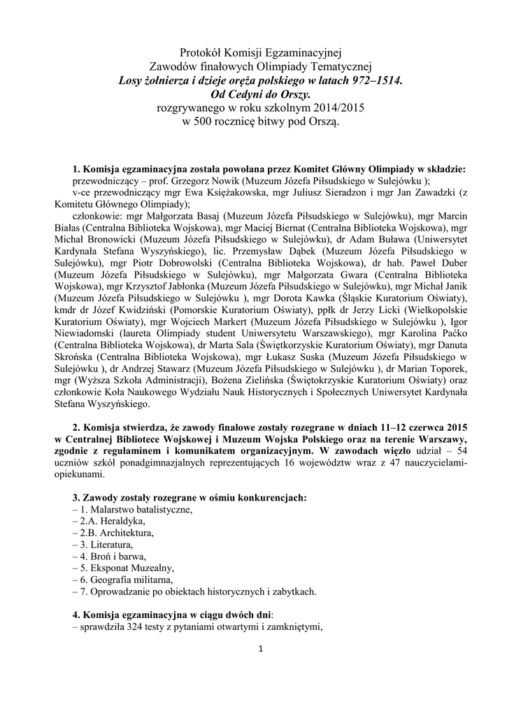 Protokół Komisji Egzaminacyjnej Zawodów finałowych Olimpiady Tematycznej Losy żołnierza i dzieje oręża polskiego w latach 972–1514. Od Cedyni do Orszy. rozgrywanego w roku szkolnym 2014/2015 w 500 rocznicę bitwy pod Orszą. 1. Komisja egzaminacyjna została powołana przez Komitet Główny Olimpiady w składzie: przewodniczący – prof. Grzegorz Nowik (Muzeum Józefa Piłsudskiego w Sulejówku ); v-ce przewodniczący mgr Ewa Księżakowska, mgr Juliusz Sieradzon i mgr Jan Zawadzki (z Komitetu Głównego Olimpiady); członkowie: mgr Małgorzata Basaj (Muzeum Józefa Piłsudskiego w Sulejówku), mgr Marcin Białas (Centralna Biblioteka Wojskowa), mgr Maciej Biernat (Centralna Biblioteka Wojskowa), mgr Michał Bronowicki (Muzeum Józefa Piłsudskiego w Sulejówku), dr Adam Buława (Uniwersytet Kardynała Stefana Wyszyńskiego), lic. Przemysław Dąbek (Muzeum Józefa Piłsudskiego w Sulejówku), mgr Piotr Dobrowolski (Centralna Biblioteka Wojskowa), dr hab. Paweł Duber (Muzeum Józefa Piłsudskiego w Sulejówku), mgr Małgorzata Gwara (Centralna Biblioteka Wojskowa), mgr Krzysztof Jabłonka (Muzeum Józefa Piłsudskiego w Sulejówku), mgr Michał Janik (Muzeum Józefa Piłsudskiego w Sulejówku ), mgr Dorota Kawka (Śląskie Kuratorium Oświaty), kmdr dr Józef Kwidziński (Pomorskie Kuratorium Oświaty), ppłk dr Jerzy Licki (Wielkopolskie Kuratorium Oświaty), mgr Wojciech Markert (Muzeum Józefa Piłsudskiego w Sulejówku ), Igor Niewiadomski (laureta Olimpiady student Uniwersytetu Warszawskiego), mgr Karolina Paćko (Centralna Biblioteka Wojskowa), dr Marta Sala (Świętkorzyskie Kuratorium Oświaty), mgr Danuta Skrońska (Centralna Biblioteka Wojskowa), mgr Łukasz Suska (Muzeum Józefa Piłsudskiego w Sulejówku ), dr Andrzej Stawarz (Muzeum Józefa Piłsudskiego w Sulejówku ), dr Marian Toporek, mgr (Wyższa Szkoła Administracji), Bożena Zielińska (Świętokrzyskie Kuratorium Oświaty) oraz członkowie Koła Naukowego Wydziału Nauk Historycznych i Społecznych Uniwersytet Kardynała Stefana Wyszyńskiego. 2. Komisja stwierdza, że zawody finałowe zostały rozegrane w dniach 11–12 czerwca 2015 w Centralnej Bibliotece Wojskowej i Muzeum Wojska Polskiego oraz na terenie Warszawy, zgodnie z regulaminem i komunikatem organizacyjnym. W zawodach więzło udział – 54 uczniów szkół ponadgimnazjalnych reprezentujących 16 województw wraz z 47 nauczycielamiopiekunami. 3. Zawody zostały rozegrane w ośmiu konkurencjach: – 1. Malarstwo batalistyczne, – 2.A. Heraldyka, – 2.B. Architektura, – 3. Literatura, – 4. Broń i barwa, – 5. Eksponat Muzealny, – 6. Geografia militarna, – 7. Oprowadzanie po obiektach historycznych i zabytkach. 4. Komisja egzaminacyjna w ciągu dwóch dni: – sprawdziła 324 testy z pytaniami otwartymi i zamkniętymi, 1 – wysłuchała 108 prezentacji, 5. W dwóch konkurencjach: 5. eksponat muzealny oraz 7. oprowadzanie po obiektach historycznych i zabytkach uczniowie wykazali bardzo wysokie kompetencje uzyskując przeciętnie od 80 do 100% możliwych do zdobycia punktów. 6. Poziom zawodów był bardzo wysoki, zadania na poziomie uniwersyteckim, a uczniowie, którzy zajęli czołowe miejsca od 1 do 10 uzyskali – od 70 – do niespełna 80% możliwych do zdobycia punktów. 7. Wyniki generalne z rozbiciem na poszczególne konkurencje stanowią załącznik do protokołu i zostaną opublikowane na stronie internetowej Olimpiady. 8. Niżej wymienieni uczniowie zajęli następujące miejsca i otrzymują nagrody: 8.1. Uczniowie, którzy zajęli miejsca od I do IX: I – Justyna Cybul z II LO im. Konstantego Ildefonsa Gałczyńskiego w Olszynie (nauczyciel p. Anna Brzostek) II – Maciej Żegota z II LO w Tomaszowie Mazowieckim (nauczyciel p. Katarzyna Kozioł Machel) III – Mateusz Skiba z XIII LO w Szczecinie (nauczyciel p. Andrzej Linder); IV – Małgorzata Samela z I LO im. Tadeusza Kościuszki w Starachowicach (nauczyciel p. Robert Słonka); V – Mateusz Korniak z X LO im. Stefanii Sempołowskiej we Wrocławiu (nauczyciel p. Ewa Piwnik) VI – Marta Sosnowska z I LO om. Józefa Ignacego Kraszewskiego w Białej Podlaskiej (nauczyciel p. Jarosław Radecki) VII – Mikołaj Zegar z II LO im. Stefana Żeromskiego w Tomaszowie Mazowieckim (nauczyciel p. Alina Gogól-Siniarska) VIII – Paweł Hypiak z LO w Lubaczowie (nauczyciel p. Monika Garbacz), IX – Michał Andruszkiewicz z III LO im K. K. Baczyńskiego w Białymstoku (nauczyciel p. Dariusz Rykaczewski) oraz Bartosz Popiela z II LO im. Karola Wojtyły w Lęborku (nauczyciel p. Karol Magott) uczniowie otrzymują dyplomy oraz: – Medale od Klubu Kawalerów Orderu Wojennego Virtuti Militari, – m-ca I–III – laptopy a m-ca IV–IX (EE) tablety oraz komplety książek historycznych od Centralnej Biblioteki Wojskowej, Fundacji PZU, Fundacji Rodziny Józefa Piłsudskiego, Instytutu Pamięci Narodowej, Muzeum Historii Polski, Muzeum Józefa Piłsudskiego w Sulejówku, Muzeum Wojska Polskiego i Oficyny Wydawniczej Rytm; 8.2. Pozostali uczniowie, uczestnicy zawodów finałowych otrzymują dyplomy oraz: – Medale od Klubu Kawalerów Orderu Wojennego Virtuti Militari, – komplety książek historycznych od Centralnej Biblioteki Wojskowej, Fundacji PZU, Fundacji Rodziny Józefa Piłsudskiego, Instytutu Pamięci Narodowej, Muzeum Historii Polski, Muzeum Józefa Piłsudskiego, Muzeum Wojska Polskiego i Oficyny Wydawniczej Rytm; Nagrody wręczać będą Organizatorzy Olimpiady: – Pan Minister Maciej Jankowski, patron Olimpiady, – Pan Krzysztof Jaraczewski, dyrektor Muzeum Józefa Piłsudskiego w Sulejówku, – Pan prof. Wiesław Wysocki z Wydziału Nauk Historycznych i Społecznych Uniwersytetu 2 Kardynała Stefana Wyszyńskiego, – Pan dr Jan Tarczyński dyrektor Centralnej Biblioteki Wojskowej 9. Tytuły Laureatów i Finalistów 9.1. Zgodnie z Regulaminu Olimpiady – tytuł laureatów Olimpiady uzyskują uczniowie, którzy uzyskali ponad 60% możliwych do zdobycia punktów, z