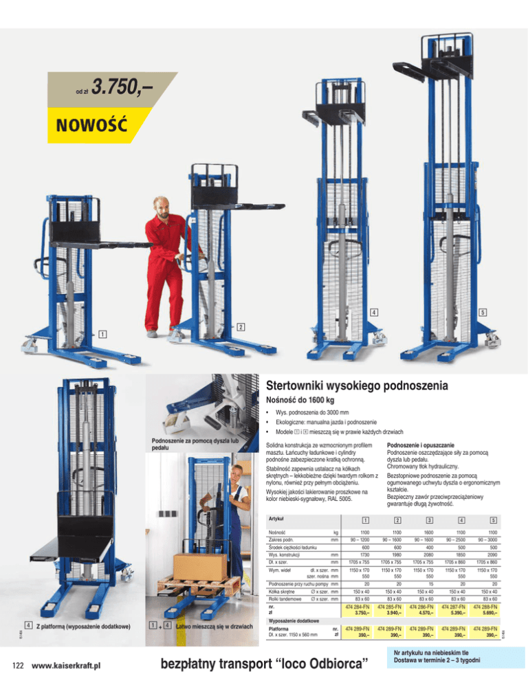 od zł 3.750,– NOWOŚĆ 4 5 2 1 Stertowniki wysokiego podnoszenia Nośność do 1600 kg Wys. podnoszenia do 3000 mm • Ekologiczne: manualna jazda i podnoszenie • Modele 1 i 4 mieszczą się w prawie każdych drzwiach Solidna konstrukcja ze wzmocnionym profilem masztu. Łańcuchy ładunkowe i cylindry podnośne zabezpieczone kratką ochronną. Stabilność zapewnia ustalacz na kółkach skrętnych – lekkobieżne dzięki twardym rolkom z nylonu, również przy pełnym obciążeniu. Wysokiej jakości lakierowanie proszkowe na kolor niebieski-sygnałowy, RAL 5005. Artykuł 1 2 3 4 5 mm mm 1100 90 – 1200 600 1730 1705 x 755 1100 90 – 1600 600 1980 1705 x 755 1600 90 – 1600 400 2080 1705 x 755 1100 90 – 2500 500 1850 1705 x 860 1100 90 – 3000 500 2090 1705 x 860 dł. x szer. mm szer. nośna mm 1150 x 170 550 1150 x 170 550 1150 x 170 550 1150 x 170 550 1150 x 170 550 Podnoszenie przy ruchu pompy mm Kółka skrętne Ø x szer. mm Rolki tandemowe Ø x szer. mm 20 150 x 40 83 x 60 20 150 x 40 83 x 60 15 150 x 40 83 x 60 20 150 x 40 83 x 60 20 150 x 40 83 x 60 474 284-FN 474 285-FN 474 286-FN 474 287-FN 474 288-FN 474 289-FN 474 289-FN 474 289-FN 474 289-FN 474 289-FN Nośność Zakres podn. Środek ciężkości ładunku Wys. konstrukcji Dł. x szer. Wym. wideł kg mm nr. zł 151456 4 Z platformą (wyposażenie dodatkowe) 122 www.kaiserkraft.pl 1+4 Łatwo mieszczą się w drzwiach Podnoszenie i opuszczanie Podnoszenie oszczędzające siły za pomocą dyszla lub pedału. Chromowany tłok hydrauliczny. Bezstopniowe podnoszenie za pomocą ogumowanego uchwytu dyszla o ergonomicznym kształcie. Bezpieczny zawór przeciwprzeciążeniowy gwarantuje długą żywotność. 3.750,– 3.940,– 4.570,– 5.390,– 5.690,– Wyposażenie dodatkowe Platforma Dł. x szer. 1150 x 560 mm nr. zł 390,– bezpłatny transport “loco Odbiorca” 390,– 390,– 390,– Nr artykułu na niebieskim tle Dostawa w terminie 2 – 3 tygodni 390,– 151456 Podnoszenie za pomocą dyszla lub pedału •