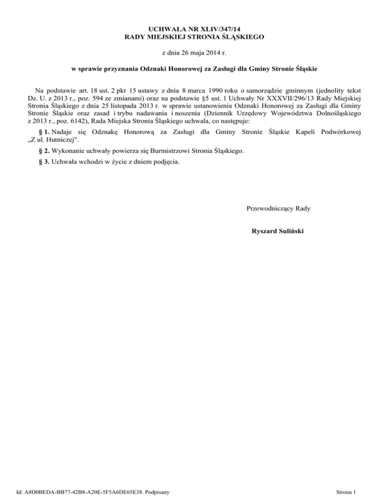 UCHWAŁA NR XLIV/347/14 RADY MIEJSKIEJ STRONIA ŚLĄSKIEGO z dnia 26 maja 2014 r. w sprawie przyznania Odznaki Honorowej za Zasługi dla Gminy Stronie Śląskie Na podstawie art. 18 ust. 2 pkt 15 ustawy z dnia 8 marca 1990 roku o samorządzie gminnym (jednolity tekst Dz. U. z 2013 r., poz. 594 ze zmianami) oraz na podstawie §5 ust. 1 Uchwały Nr XXXVII/296/13 Rady Miejskiej Stronia Śląskiego z dnia 25 listopada 2013 r. w sprawie ustanowienia Odznaki Honorowej za Zasługi dla Gminy Stronie Śląskie oraz zasad i trybu nadawania i noszenia (Dziennik Urzędowy Województwa Dolnośląskiego z 2013 r., poz. 6142), Rada Miejska Stronia Śląskiego uchwala, co następuje: § 1. Nadaje się Odznakę Honorową za Zasługi dla Gminy Stronie Śląskie Kapeli Podwórkowej „Z ul. Hutniczej". § 2. Wykonanie uchwały powierza się Burmistrzowi Stronia Śląskiego. § 3. Uchwała wchodzi w życie z dniem podjęcia. Przewodniczący Rady Ryszard Suliński Id: A8D0BEDA-BB77-42B8-A20E-5F5A6DE65E38. Podpisany Strona 1 Uzasadnienie Na podstawie §8 ust. 2 Uchwały Nr XXXVII/296/13 Rady Miejskiej Stronia Śląskiego z dnia 25 listopada 2013 r. w sprawie ustanowienia Odznaki Honorowej za Zasługi dla Gminy Stronie Śląskie oraz zasad i trybu nadawania i noszenia (Dziennik Urzędowy Województwa Dolnośląskiego z 2013 r., poz. 6142) oraz §9 ust.1 Regulaminu Działania Komisji Odznaki Honorowej za Zasługi dla Gminy Stronie Śląskie, Komisja Odznaki Honorowej za Zasługi dla Gminy Stronie Śląskie zarekomendowała nadanie Odznaki Honorowej za Zasługi dla Gminy Stronie Śląskie Kapeli Podwórkowej "Z ul. Hutniczej". Kapela „Z ul. Hutniczej” została założona w 1987 r., a jej repertuar zawiera ponad 110 piosenek i jest wzorowany na folklorze miejskim warszawskim, lwowskim i wileńskim. Do melodii zasłyszanych i niekiedy własnych, teksty pisze Pan Jerzy Kaczmarek. W swoich piosenkach Kapela wytyka i ośmiesza wady i przywary rodaków, porusza problemy życia codziennego.Promuje walory turystyczne Naszej Gminy podczas licznych koncertów i festiwali na terenie całego kraju i po za jego granicami. Kapela występowała w wielu dużych i małych miastach i miasteczkach: Warszawa - „Torwar”; Poznań – targi, Jelenia Góra, Częstochowa, Legnica, Rzeszów, Piotrków Trybunalski, Lublin, Zamość, Wrocław, Wałbrzych i w wielu innych miastach. Kapela brała udział, między innymi: - aż 15 razy w Ogólnopolskim Festiwalu w Przemyślu zdobywając w 1991 roku – nagrodę Biura Turystyki „Polonez” w Przemyślu, w 1993 roku - II nagrodę Festiwalu, w latach 1995 i 1998 - III nagrody Festiwalu. - w Krasnymstawie, na „Chmielakach” Kapela była 17 razy, zdobywając w latach 1995 i 1998 – II nagrodę, a w 1999 roku - III nagrodę. W latach 1993 i 2000 - IV nagrodę. - koncerty po za granicami kraju to w 1998 roku - Belgia oraz Holandia. W 2001 roku - Belgia /Bruksela udział w Festiwalu Folkloru i Kuchni Polskiej/. W 2004 roku – Węgry. W 2005 roku – Francja /La Machin/ oraz kilkakrotnie w byłej Czechosłowacji i obecnych Czechach. - Kapela swoje piosenki nagrywała w „Radiu Wrocław” w „Radiu Wałbrzych”, w programie telewizyjnym „Kawa czy Herbata”, „Pytanie na Śniadanie”, „Para w Polskę”, dla telewizyjnej „2” i „5”. Także dla telewizji lokalnych: Kraków, Rzeszów, Lublin i Wrocław. - Kapela „obsługiwała” ważne imprezy krajowe i międzynarodowe, wydarzenia kulturalne, sportowe, dożynki wojewódzkie i powiatowe, kampanię wyborczą do samorządu lokalnego, do Sejmu i Senatu. Wspomagała wielokrotnie Wielką Orkiestrę Świątecznej Pomocy oraz ważne uroczystości religijne. W 2013 r. Kapela obchodziła 35-lecie jubileuszu muzykowania. Przez te wszystkie lata Kapela jest wizytówką Stronia Śląskiego. Ww. przykłady działalności Kapeli są doskonałym dowodem na to, jak Kapela na przestrzeni lat, poprzez swoją działalność, aktywnie promowała i promuje Gminę Stronie Śląskie. Biorąc powyższe pod uwagę zasadnym jest nadanie Odznaki Honorowej za Zasługi dla Gminy Stronie Śląskie Kapeli Podwórkowej "Z ul. Hutniczej". Przewodniczący Rady Ryszard Suliński Id: A8D0BEDA-BB77-42B8-A20E-5F5A6DE65E38. Podpisany Strona 1