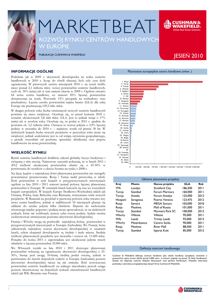 ROZWÓJ RYNKU CENTRÓW HANDLOWYCH W EUROPIE JESIEŃ 2010 PUBLIKACJA CUSHMAN & WAKEFIELD INFORMACJE OGÓLNE Podobnie jak w 2009 r. aktywność deweloperska na rynku centrów handlowych w 2010 r. licząc do chwili obecnej, była cały czas dość ograniczona. W pierwszych sześciu miesiącach 2010 r. na rynek trafiło nieco ponad 2,1 miliona mkw. nowej powierzchni centrów handlowych, czyli ok. 30% mniej niż w tym samym okresie w 2009 r. Ogółem otwarto 64 nowe centra handlowe, co stanowi 85% łącznej powierzchni dostarczonej na rynek. Pozostałe 15% przypada na rozbudowy oraz przebudowy. Łączne zasoby powierzchni najmu brutto (GLA) dla całej Europy nie przekraczają 129,2 mln. mkw. W drugiej połowie roku liczba otwieranych nowych centrów handlowych powinna się nieco zwiększyć. Oczekuje się, że przed końcem 2010 r. zostanie ukończonych 3,8 mln mkw. GLA. Jest to jednak wciąż o 17% mniej niż w zeszłym roku. Oczekuje się, że podaż w 2011 r. spadnie do poziomu ok. 5,2 miliona mkw. Oznacza to wzrost jedynie o 3,9% łącznej podaży w stosunku do 2010 r. – najniższy wynik od prawie 30 lat. W niektórych krajach liczba nowych projektów w przyszłym roku może się zwiększyć, jednak uzależnione jest to od tempa ożywienia gospodarczego, a przede wszystkim od poziomu sprzedaży detalicznej oraz popytu handlowców na nową powierzchnię. WIELKOŚĆ RYNKU Rynek centrów handlowych dotkliwie odczuł globalny kryzys kredytowy i związaną z nim recesję. Najnowsze szacunki pokazują, że w latach 2011 i 2012 wielkość ukończonej powierzchni obniży się o 45-50% w porównaniu do wyników z okresu boomu na rynku z 2008 r. Na liście krajów o największej ilości planowanej powierzchni nie nastąpiły poważniejsze przetasowania. Rosja i Turcja nadal przewodzą w tabeli. Ilość powierzchni w tych krajach w przygotowywanych inwestycjach ogółem za lata 2010 i 2011 stanowi ponad połowę łącznej planowanej powierzchni w Europie. W ostatnich latach kurczyła się ona we wszystkich krajach europejskich. W krajach Europy Środkowo-Wschodniej takich jak Ukraina, Polska, kraje Bałtyckie oraz Rumunia, wstrzymano wiele nowych projektów. W Rumunii na przykład w pierwszej połowie roku otwarto trzy nowe centra handlowe, jednak w najbliższych 18 miesiącach planuje się oddanie do użytku jedynie kilka obiektów. Dążenie do zachowania równowagi między popytem i podażą może spowodować, że na niektórych rynkach, które nie wchłonęły jeszcze całej nowej podaży, będzie można zaobserwować zmniejszenie poziomu aktywności deweloperskiej. Francja i Włochy mogą się pochwalić największą ilością powierzchni w przygotowywanych inwestycjach w Europie Zachodniej. We Francji, która odnotowała największy wzrost aktywności deweloperskiej w ostatnich latach, celem ekspansji deweloperów są średnie i małe miasta. Średnia wielkość planowanych projektów jest niewielka i wynosi ok. 11.000 mkw. Ponadto do końca 2011 r. zapowiadane jest ukończenie jedynie trzech obiektów o łącznej powierzchni 35.000 mkw. We Włoszech wyniki za lata 2010 i 2011 dotyczące planowanej powierzchni wskazują na ograniczenie aktywności deweloperskiej o 2530%, biorąc pod uwagę 10-letnią średnią podaż roczną, jednak w porównaniu do innych dojrzałych rynków w Europie Zachodniej poziom aktywności deweloperskiej raczej się nie zmienia. Ilość nowoczesnej powierzchni centrów handlowych na jednego mieszkańca powoli osiąga poziom obserwowany na dojrzałych rynkach nieruchomości handlowych takich jak Wlk. Brytania oraz Francja. 1 Planowane europejskie centra handlowe (mkw. ) 1. Rosja 2. Turcja 3. Francja 4. Wlochy 5. Bulgaria 6. Polska 7. UK 8. Niemcy 9. Hiszpania 10. Holandia 11. Austria 12. Chorwacja 13. Portugalia 14. Czechy 15. Slowacja 16. Rumunia 17. Ukraina 18. Slowenia 19. Grecja 20. Serbia 21. Irlandia 22. Litwa 23. Wegry 24. Belgia 25. Bosnia 26. Lotwa 27. Norwegia 28. Estonia 29. 30. Finlandia 31. Szwajcaria 32. Szwecja 33. Dania 34. Malta 0 250 000 500 000 750 000 1 000 000 1 250 000 1 500 000 1 750 000 2 000 000 Główne planowane projekty Kraj Miasto Nazwa projektu Wlk. Londyn Stambuł Antalia Saragossa Samara Moskwa Stambuł Villesse Leeds Misterbianco Moskwa Stambuł Stratford City Forum Marmara Forum Antalya Puerto Venecia MEGA Samara Mall of Russia Marmara Park SC Villesse Trinity Leeds Centro Sicilia River Mall Isparta Kule Turcja Turcja Hiszpani Rosja Rosja Turcja Włochy Wlk. Włochy Rosja Turcja GLA Rok 186,500 160,000 125,000 123,475 103,000 101,000 100,000 95,000 93,000 90,000 88,500 85,000 2011 2011 2012 2012 2010 2011 2012 2011 2013 2011 2011 2012 Definicja centrum handlowego Cushman & Wakefield definiuje centrum handlowe jako obiekt handlowy zarządzany centralnie o powierzchni najmu brutto (GLA) ponad 5.000 mkw., w którym znajduje się ponad 10 lokali handlowych. Analiza nie obejmuje centrów sklepów fabrycznych oraz parków handlowych. Wszelkie informacje pochodzą z centralnej europejskiej bazy danych firmy Cushman & Wakefield. ROZWÓJ RYNKU CENTRÓW HANDLOWYCH W EUROPIE JESIEŃ 2010 INWESTYCJE W 1 POŁ. 2010 r. W pierwszej połowie 2010 r. na rynek trafiło jedynie 2,1 miliona mkw. powierzchni centrów handlowych brutto. Jest to najniższy wynik za ten okres od 2005 r. Średnia podaż powierzchni w centrach handlowych przypadająca na 1.000 mieszkańców dla 27 krajów UE wynosi obecnie 231 mkw. Ogółem w dziesięciu krajach nie otwarto żadnego centrum handlowego. Dotyczyło to między innymi Czech, Węgier i Irlandii. Aktywność deweloperska wyraźnie się zmniejszyła na kilku europejskich rynkach wschodzących, jednak w 1 poł. 2010 r. na Europę ŚrodkowoWschodnią wciąż przypadała większość nowej podaży (nieco ponad 60%). Wynikało to przede wszystkim z niezmiennie wysokiego poziomu aktywności deweloperskiej w Rosji, Turcji, Polsce i Bułgarii. Zdecydowanie największym projektem oddanym do użytku w pierwszych sześciu mie