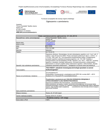 Projekt współfinansowany przez Unię Europejską z Europejskiego Funduszu Rozwoju Regionalnego oraz z budżetu państwa Fundusze europejskie dla rozwoju regionu łódzkiego Ogłoszenie o zamówieniu Inwestor: "Firma Posiadało" Spólka Jawna Wykno 40 97-225 UJAZD Sygnatura i nr wniosku: WND.RPLD.03.03.00-00-033/13 Data zamieszczenia ogłoszenia: 01.04.2014 Nazwa(firma) i adres zamawiającego: strona www adres e-mail: "Firma Posiadało" Spółka Jawna Wykno 40 97-225 UJAZD www.gladio.pl [email protected] KRS 000149398 NIP 773-11-21-302 590433911 REGON Telefon 44 719 23 75 Sposób i tryb udzielenia zamówienia: Zapytanie ofertowe. Zamawiający nie jest zobowiązany zgodnie z art. 3 ust.1 pkt. 5 ustawy z dnia 29 stycznia 2004r. Prawo zamówień publicznych (Dz.U. z 2010 r. nr 113 poz. 759 z póź. zm. ) do stosowania przedmiotowej ustawy. Postępowanie prowadzi zgodnie z polityką konkurencji zgodnie z art. 101-109- Traktatu o funkcjonowaniu Unii Europejskiej (TFUE). Zgodnie z art. 70(1) - 70(5) KC– przetarg zgodnie z zasadami równego traktowania, uczciwej konkurencji i przejrzystości. Zamówienia w ramach projektu będą realizowane zgodnie z dokumentem „Zasady udzielania zamówień publicznych...” dostępnym na stronie www.cop.lodzkie.pl Tytuł projektu: "ECO HEAVY- wdrożenie innowacyjnej technologii sposobem na wzrost konkurencyjności" Nazwa osi priortetowej i działania: Oś priorytetowa III: Gospodarka, innowacyjność, przedsiębiorczość RPO WŁ na lata 2007 —2013 Działanie III.3: Rozwój B+R w przedsiębiorstwach. Przedmiotem zamówienia jest USŁUGA DORADCZA ZWIĄZANA Z OPRACOWANIEM PLANU MARKETINGOWEGO. Dopuszcza się składanie ofert równoważnych, o tej samej funkcjonalności. Zakres zamówienia jest zgodny z zasadą neutralności technologicznej, nie faworyzuje żadnej konkretnej technologii, co oznacza, nie ogranicza możliwości technologicznego wyboru. Wszystkie kryteria mają charakter jedynie poglądowy, a przedstawione dane zwierają wartości brzegowe planowanej inwestycji. Opis przedmiotu zamówienia: Miejsce dostawy: Wykno 40, 97-225 Ujazd Termin realizacji projektu: marzec 2014-31.12.2014 Cena netto w PLN 100% Kryteria oceny i ich wagi: Strona 1 z 2 Opis sposobu obliczania punktów w poszczególnych kryteriach: Opis sposobu obliczania ceny Ocena wg kryterium ceny: C = ( Cmin / Cof) x 100 gdzie: C – ilość punktów za cenę przyznanych danej ofercie. Cmin – najniższa cena, Cof – cena oferenta. Opis sposobu przygotowania oferty: Oferta powinna być: 1. opatrzona pieczątką firmową, 2. posiadać datę sporządzenia, 3. podpisana przez osobę upoważnioną do reprezentowania dostawcy, wynikające z dokumentów rejestrowych, 4. jeden wykonawca może złożyć tylko jedną ofertę, 5. przesłana za pośrednictwem poczty elektronicznej na adres:[email protected], lub poczty, kuriera lub też dostarczona osobiście na adres: 97-225 UJAZD, Wykno 40. Termin ważności oferty : Oferta winna być ważna do 31.12.2014 Czas dostarczenia oferty: Oferta winna być dostarczona do dnia 14.04.2014. Decydować będzie data wpłynięcia ofert do siedziby Beneficjenta. Miejsce i termin otwarcia ofert: Oferty zostaną rozpatrzone dnia 15.04.2014 o godzinie 10.00.Zwycięzcą zostanie oferent, którego oferta zdobędzie największą liczbę punktów. Dostawca zostanie niezwłocznie powiadomiony o wyborze jego oferty. Dodatkowo zawiadomienie o wyborze najkorzystniejszej oferty zostanie zamieszczone w siedzibie zamawiającego poprzez wywieszenie na tablicy ogłoszeń oraz na jego stronie internetowej. Dodatkowe informacje: 1. Nie żąda się wnoszenia wadium. 2. Zamawiający zastrzega sobie prawo do zmiany warunków udzielenia zamówienia oraz do unieważnienia postępowania bez podania przyczyn. 3. W toku badania i oceny oferty Zamawiający może żądać od Dostawcy wyjaśnień dotyczących treści złożonych ofert i uzupełnienia dokumentacji. Osoba do kontaktu: Łukasz Posiadało 44 719 23 75 Strona 2 z 2