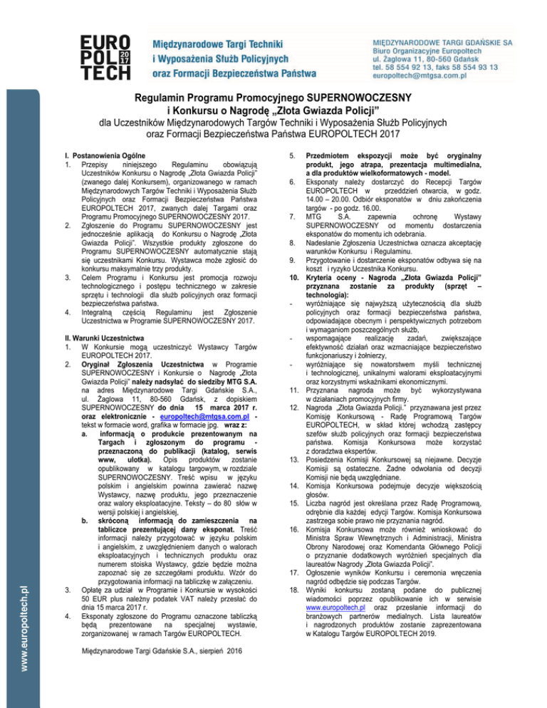Regulamin Programu Promocyjnego SUPERNOWOCZESNY i Konkursu o Nagrodę „Złota Gwiazda Policji” dla Uczestników Międzynarodowych Targów Techniki i Wyposażenia Służb Policyjnych oraz Formacji Bezpieczeństwa Państwa EUROPOLTECH 2017 I. Postanowienia Ogólne 1. Przepisy niniejszego Regulaminu obowiązują Uczestników Konkursu o Nagrodę „Złota Gwiazda Policji” (zwanego dalej Konkursem), organizowanego w ramach Międzynarodowych Targów Techniki i Wyposażenia Służb Policyjnych oraz Formacji Bezpieczeństwa Państwa EUROPOLTECH 2017, zwanych dalej Targami oraz Programu Promocyjnego SUPERNOWOCZESNY 2017. 2. Zgłoszenie do Programu SUPERNOWOCZESNY jest jednocześnie aplikacją do Konkursu o Nagrodę „Złota Gwiazda Policji”. Wszystkie produkty zgłoszone do Programu SUPERNOWOCZESNY automatycznie stają się uczestnikami Konkursu. Wystawca może zgłosić do konkursu maksymalnie trzy produkty. 3. Celem Programu i Konkursu jest promocja rozwoju technologicznego i postępu technicznego w zakresie sprzętu i technologii dla służb policyjnych oraz formacji bezpieczeństwa państwa. 4. Integralną częścią Regulaminu jest Zgłoszenie Uczestnictwa w Programie SUPERNOWOCZESNY 2017. 5. II. Warunki Uczestnictwa 1. W Konkursie mogą uczestniczyć Wystawcy Targów EUROPOLTECH 2017. 2. Oryginał Zgłoszenia Uczestnictwa w Programie SUPERNOWOCZESNY i Konkursie o Nagrodę „Złota Gwiazda Policji” należy nadsyłać do siedziby MTG S.A. na adres Międzynarodowe Targi Gdańskie S.A., ul. Żaglowa 11, 80-560 Gdańsk, z dopiskiem SUPERNOWOCZESNY do dnia 15 marca 2017 r. oraz elektronicznie - [email protected] tekst w formacie word, grafika w formacie jpg. wraz z: a. informacją o produkcie prezentowanym na Targach i zgłoszonym do programu przeznaczoną do publikacji (katalog, serwis www, ulotka). Opis produktów zostanie opublikowany w katalogu targowym, w rozdziale SUPERNOWOCZESNY. Treść wpisu w języku polskim i angielskim powinna zawierać nazwę Wystawcy, nazwę produktu, jego przeznaczenie oraz walory eksploatacyjne. Teksty – do 80 słów w wersji polskiej i angielskiej, b. skróconą informacją do zamieszczenia na tabliczce prezentującej dany eksponat. Treść informacji należy przygotować w języku polskim i angielskim, z uwzględnieniem danych o walorach eksploatacyjnych i technicznych produktu oraz numerem stoiska Wystawcy, gdzie będzie można zapoznać się ze szczegółami produktu. Wzór do przygotowania informacji na tabliczkę w załączeniu. 3. Opłatę za udział w Programie i Konkursie w wysokości 50 EUR plus należny podatek VAT należy przesłać do dnia 15 marca 2017 r. 4. Eksponaty zgłoszone do Programu oznaczone tabliczką będą prezentowane na specjalnej wystawie, zorganizowanej w ramach Targów EUROPOLTECH. - Międzynarodowe Targi Gdańskie S.A., sierpień 2016 6. 7. 8. 9. 10. - 11. 12. 13. 14. 15. 16. 17. 18. Przedmiotem ekspozycji może być oryginalny produkt, jego atrapa, prezentacja multimedialna, a dla produktów wielkoformatowych - model. Eksponaty należy dostarczyć do Recepcji Targów EUROPOLTECH w przeddzień otwarcia, w godz. 14.00 – 20.00. Odbiór eksponatów w dniu zakończenia targów - po godz. 16.00. MTG S.A. zapewnia ochronę Wystawy SUPERNOWOCZESNY od momentu dostarczenia eksponatów do momentu ich odebrania. Nadesłanie Zgłoszenia Uczestnictwa oznacza akceptację warunków Konkursu i Regulaminu. Przygotowanie i dostarczenie eksponatów odbywa się na koszt i ryzyko Uczestnika Konkursu. Kryteria oceny - Nagroda „Złota Gwiazda Policji” przyznana zostanie za produkty (sprzęt – technologia): wyróżniające się najwyższą użytecznością dla służb policyjnych oraz formacji bezpieczeństwa państwa, odpowiadające obecnym i perspektywicznych potrzebom i wymaganiom poszczególnych służb, wspomagające realizację zadań, zwiększające efektywność działań oraz wzmacniające bezpieczeństwo funkcjonariuszy i żołnierzy, wyróżniające się nowatorstwem myśli technicznej i technologicznej, unikalnymi walorami eksploatacyjnymi oraz korzystnymi wskaźnikami ekonomicznymi. Przyznana nagroda może być wykorzystywana w działaniach promocyjnych firmy. Nagroda „Złota Gwiazda Policji.” przyznawana jest przez Komisję Konkursową - Radę Programową Targów EUROPOLTECH, w skład której wchodzą zastępcy szefów służb policyjnych oraz formacji bezpieczeństwa państwa. Komisja Konkursowa może korzystać z doradztwa ekspertów. Posiedzenia Komisji Konkursowej są niejawne. Decyzje Komisji są ostateczne. Żadne odwołania od decyzji Komisji nie będą uwzględniane. Komisja Konkursowa podejmuje decyzje większością głosów. Liczba nagród jest określana przez Radę Programową, odrębnie dla każdej edycji Targów. Komisja Konkursowa zastrzega sobie prawo nie przyznania nagród. Komisja Konkursowa może również wnioskować do Ministra Spraw Wewnętrznych i Administracji, Ministra Obrony Narodowej oraz Komendanta Głównego Policji o przyznanie dodatkowych wyróżnień specjalnych dla laureatów Nagrody „Złota Gwiazda Policji”. Ogłoszenie wyników Konkursu i ceremonia wręczenia nagród odbędzie się podczas Targów. Wyniki konkursu zostaną podane do publicznej wiadomości poprzez opublikowanie ich w serwisie www.europoltech.pl oraz przesłanie informacji do branżowych partnerów medialnych. Lista laureatów i nagrodzonych produktów zostanie zaprezentowana w Katalogu Targów EUROPOLTECH 2019.
