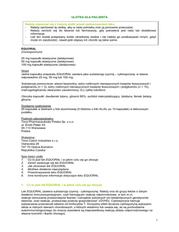 ULOTKA DLA PACJENTA NaleŜy zapoznać się z treścią ulotki przed zastosowaniem leku. - NaleŜy zachować tę ulotkę, aby w razie potrzeby móc ją ponownie przeczytać. - NaleŜy zwrócić się do lekarza lub farmaceuty, gdy potrzebna jest rada lub dodatkowa informacja. - Lek ten został przepisany ściśle określonej osobie i nie naleŜy go przekazywać innym, gdyŜ moŜe im zaszkodzić, nawet jeśli objawy ich chorób są takie same. EQUORAL (Ciclosporinum) 25 mg kapsułki elastyczne (Ŝelatynowe) 50 mg kapsułki elastyczne (Ŝelatynowe) 100 mg kapsułki elastyczne (Ŝelatynowe) Skład Jedna kapsułka preparatu EQUORAL zawiera jako substancję czynną – cyklosporynę, w dawce odpowiednio 25 mg, 50 mg lub 100 mg. Substancje pomocnicze: etanol bezwodny, estry roślinnych nienasyconych kwasów tłuszczowych i poliglicerolu (n = 3), estry roślinnych nienasyconych kwasów tłuszczowych i poliglicerolu (n = 10), makrogologlicerolu stearynian uwodorniony, D,L-(alfa) tokoferol. Otoczka kapsułki: dwutlenek tytanu, glicerol 85%, sorbitol niekrystalizujący, Ŝelatyna, tlenek Ŝelaza, glicyna. Dostępne opakowania 50 kapsułek w blistrach z folii aluminiowej (5 blistrów z folii AL/AL po 10 kapsułek) w tekturowym pudełku. Podmiot odpowiedzialny Teva Pharmaceuticals Polska Sp. z o.o. ul. Emilii Plater 53 00-113 Warszawa Polska Wytwórca Teva Czech Industries s.r.o. Ostravská 29 747 70 Opava-Komarov Republika Czeska Spis treści ulotki 1. Co to jest lek EQUORAL i w jakim celu się go stosuje 2. Zanim zastosuje się lek EQUORAL 3. Jak stosować lek EQUORAL 4. MoŜliwe działania niepoŜądane 5. Przechowywanie leku EQUORAL 6. Inne konieczne informacje dotyczące leku EQUORAL 1. Co to jest lek EQUORAL i w jakim celu się go stosuje Lek EQUORAL zawiera substancję czynną - cyklosporynę. NaleŜy ona do grupy leków o silnym działaniu immunosupresyjnym, czyli hamującym reakcje odpornościowe, w tym m.in. reakcje odrzucania przeszczepów tkanek i narządów pobranych od nieidentycznych genetycznie dawców, oraz reakcje „przeszczep przeciw gospodarzowi” (GVHD). Cyklosporyna hamuje wytwarzanie przeciwciał zaleŜne od limfocytów T. Korzystny efekt leczenia cyklosporyną wykazano takŜe w róŜnych stanach chorobowych, o których wiadomo lub uwaŜa się, Ŝe są pochodzenia autoimmunologicznego (to znaczy wywołane są nieprawidłową reakcją układu odpornościowego na własne komórki i tkanki chorego). 1 Wskazania do stosowania preparatu EQUORAL obejmują: • Przeszczepianie Przeszczepianie narządów miąŜszowych Zapobieganie odrzuceniu przeszczepu po alogenicznej transplantacji nerek, wątroby, serca, serca i płuc, płuc lub trzustki. Leczenie odrzucania przeszczepu u pacjentów uprzednio otrzymujących inne leki immunosupresyjne. Przeszczepianie szpiku Zapobieganie odrzuceniu przeszczepu po alogenicznej transplantacji szpiku. Zapobieganie lub leczenie choroby „przeszczep przeciw gospodarzowi” (GVHD). • Wskazania pozatransplantacyjne Endogenne zapalenie błony naczyniowej oka Zespół nerczycowy Reumatoidalne zapalenie stawów Łuszczyca Atopowe zapalenie skóry 2. Zanim zastosuje się lek EQUORAL Nie naleŜy stosować leku EQUORAL, jeśli występuje nadwraŜliwość na cyklosporynę lub którykolwiek składnik preparatu. Zachować szczególną ostroŜność stosując lek EQUORAL, gdyŜ: EQUORAL moŜe być przepisywany tylko przez lekarzy mających doświadczenie w leczeniu immunosupresyjnym, którzy mogą zapewnić właściwą obserwację podczas leczenia, włącznie z regularnym pełnym badaniem lekarskim, pomiarem ciśnienia tętniczego krwi i kontrolą parametrów laboratoryjnych, na podstawie których określa się bezpieczeństwo stosowania leku. Tak jak inne leki immunosupresyjne, cyklosporyna zwiększa ryzyko rozwoju chłoniaków i innych nowotworów złośliwych, szczególnie nowotworów skóry. Tak jak inne leki immunosupresyjne, cyklosporyna zwiększa ryzyko rozwoju róŜnych zakaŜeń bakteryjnych, grzybiczych, pasoŜytniczych i wirusowych. Częstym i potencjalnie cięŜkim powikłaniem w pierwszych kilku tygodniach leczenia preparatem EQUORAL moŜe być podwyŜszenie stęŜenia mocznika i kreatyniny w surowicy krwi. Wymienione zmiany czynnościowe są zaleŜne od dawki i przemijające. Ustępują zwykle po zmniejszeniu dawki. W czasie długotrwałego leczenia, u niektórych pacjentów mogą wystąpić zmiany strukturalne w nerkach (np. zwłóknienie śródmiąŜszowe), które u biorców przeszczepów nerkowych naleŜy odróŜniać od zmian wywoływanych przez przewlekłą reakcję odrzucania. EQUORAL moŜe takŜe powodować zaleŜne od dawki i przemijające zwiększenie stęŜenia bilirubiny w surowicy, a niekiedy teŜ zwiększenie aktywności enzymów wątrobowych. NaleŜy dokładnie monitorować parametry określające czynność nerek i wątroby. Nieprawidłowe ich wartości mogą spowodować konieczność zmniejszenia dawki. U pacjentów po przeszczepieniu zostanie wdroŜone rutynowe monitorowanie stęŜenia cyklosporyny. W czasie leczenia preparatem EQUORAL naleŜy regularnie kontrolować ciśnienie tętnicze krwi. W przypadku rozwoju nadciśnienia tętniczego naleŜy zastosować odpowiednie leczenie obniŜające ciśnienie. Najlepiej stosować te produkty lecznicze, w przypadku których nie obserwowano interakcji z cyklosporyną. Przed leczeniem, oraz po zakończeniu pierwszego miesiąca leczenia wskazane jest oznaczenie stęŜenia lipidów, poniewaŜ donoszono, Ŝe cyklosporyna moŜe w rzadkich przypadkach powodować przemijające, nieznaczne zwiększenie ich stęŜenia we krwi. W razie stwierdzenia zwiększenia stęŜenia lipidów, naleŜy rozwaŜyć ograniczenie spoŜycia tłuszczów i, jeŜeli to wskazane, zmniejszenie dawki cyklosporyny. 2 Cyklosporyna zwiększa ryzyko wystąpienia hiperkaliemii (podwyŜszonego stęŜenia potasu we krwi), szczególnie u pacjentów z zaburzeniami czynności nerek. NaleŜy równieŜ zachować ostroŜność, przyjmuj