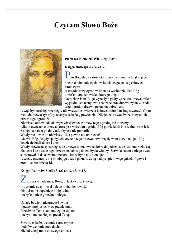 Czytam Słowo Boże Pierwsza Niedziela Wielkiego Postu Księga Rodzaju 2,7-9.3,1-7. P an Bóg ulepił człowieka z prochu ziemi i tchnął w jego nozdrza tchnienie życia, wskutek czego stał się człowiek istotą żywą. A zasadziwszy ogród w Eden na wschodzie, Pan Bóg umieścił tam człowieka, którego ulepił. Na rozkaz Pana Boga wyrosły z gleby wszelkie drzewa miłe z wyglądu i smaczny owoc rodzące oraz drzewo życia w środku tego ogrodu i drzewo poznania dobra i zła. A wąż był bardziej przebiegły niż wszystkie zwierzęta lądowe, które Pan Bóg stworzył. On to rzekł do niewiasty: «Czy rzeczywiście Bóg powiedział: Nie jedzcie owoców ze wszystkich drzew tego ogrodu?» Niewiasta odpowiedziała wężowi: «Owoce z drzew tego ogrodu jeść możemy, tylko o owocach z drzewa, które jest w środku ogrodu, Bóg powiedział: Nie wolno wam jeść z niego, a nawet go dotykać, abyście nie pomarli». Wtedy rzekł wąż do niewiasty: «Na pewno nie umrzecie! Ale wie Bóg, że gdy spożyjecie owoc z tego drzewa, otworzą się wam oczy i tak jak Bóg będziecie znali dobro i zło». Wtedy niewiasta spostrzegła, że drzewo to ma owoce dobre do jedzenia, że jest ono rozkoszą dla oczu i że owoce tego drzewa nadają się do zdobycia wiedzy. Zerwała zatem z niego owoc, skosztowała i dała swemu mężowi, który był z nią, a on zjadł. A wtedy otworzyły się im obojgu oczy i poznali, że są nadzy; spletli więc gałązki figowe i zrobili sobie przepaski. Księga Psalmów 51(50),3-4.5-6a.12-13.14.17. Z miłuj się nade mną, Boże, w łaskawości swojej, w ogromie swej litości zgładź moją nieprawość. Obmyj mnie zupełnie z mojej winy i oczyść mnie z grzechu mojego. Uznaję bowiem nieprawość swoją i grzech mój jest zawsze przede mną. Przeciwko Tobie samemu zgrzeszyłem i uczyniłem, co złe jest przed Tobą. Stwórz, o Boże, we mnie serce czyste i odnów we mnie moc ducha. Nie odrzucaj mnie od swego oblicza i nie odbieraj mi świętego ducha swego. Przywróć mi radość z Twojego zbawienia i wzmocnij mnie duchem ofiarnym. Panie, otwórz wargi moje, a usta moje będą głosić Twoją chwałę. List do Rzymian 5,12-19. B racia: Przez jednego człowieka grzech wszedł na świat, a przez grzech śmierć, i w ten sposób śmierć przeszła na wszystkich ludzi, ponieważ wszyscy zgrzeszyli. Bo i przed Prawem grzech był na świecie, grzechu się jednak nie poczytuje, gdy nie ma Prawa. A przecież śmierć rozpanoszyła się od Adama do Mojżesza nawet nad tymi, którzy nie zgrzeszyli przestępstwem na wzór Adama. On to jest typem Tego, który miał przyjść. Ale nie tak samo ma się rzecz z przestępstwem jak z darem łaski. Jeżeli bowiem przestępstwo jednego sprowadziło na wszystkich śmierć, to o ileż obficiej spłynęła na nich wszystkich łaska i dar Boży, łaskawie udzielony przez jednego Człowieka, Jezusa Chrystusa. I nie tak samo ma się rzecz z tym darem jak i ze skutkiem grzechu, spowodowanym przez jednego grzeszącego. Gdy bowiem jeden tylko grzech przynosi wyrok potępiający, to łaska przynosi usprawiedliwienie ze wszystkich grzechów. Jeżeli bowiem przez przestępstwo jednego śmierć zakrólowała z powodu jego jednego, o ileż bardziej ci, którzy otrzymują obfitość łaski i daru sprawiedliwości, królować będą w życiu z powodu Jednego - Jezusa Chrystusa. A zatem, jak przestępstwo jednego sprowadziło na wszystkich ludzi wyrok potępiający, tak czyn sprawiedliwy Jednego sprowadza na wszystkich ludzi usprawiedliwienie dające życie. Albowiem jak przez nieposłuszeństwo jednego człowieka wszyscy stali się grzesznikami, tak przez posłuszeństwo Jednego wszyscy staną się sprawiedliwymi. Ewangelia wg św. Mateusza 4,1-11. D uch wyprowadził Jezusa na pustynię, aby był kuszony przez diabła. A gdy pościł już czterdzieści dni i czterdzieści nocy, poczuł w końcu głód. Wtedy przystąpił kusiciel i rzekł do Niego: «Jeśli jesteś Synem Bożym, powiedz, żeby te kamienie stały się chlebem». Lecz On mu odparł: «Napisane jest: "Nie samym chlebem żyje człowiek, lecz każdym słowem, które pochodzi z ust Bożych"». Wtedy wziął Go diabeł do Miasta Świętego, postawił na szczycie narożnika świątyni i rzekł Mu: «Jeśli jesteś Synem Bożym, rzuć się w dół, jest przecież napisane: "Aniołom swoim rozkaże o tobie, a na rękach nosić cię będą, byś przypadkiem nie uraził swej nogi o kamień"». Odrzekł mu Jezus: «Ale jest napisane także: "Nie będziesz wystawiał na próbę Pana, Boga swego"». Jeszcze raz wziął Go diabeł na bardzo wysoką górę, pokazał Mu wszystkie królestwa świata oraz ich przepych i rzekł do Niego: «Dam Ci to wszystko, jeśli upadniesz i oddasz mi pokłon». Na to odrzekł mu Jezus: «Idź precz, szatanie! Jest bowiem napisane: "Panu, Bogu swemu, będziesz oddawał pokłon i Jemu samemu służyć będziesz"». Wtedy opuścił Go diabeł, a oto aniołowie przystąpili i usługiwali Mu.