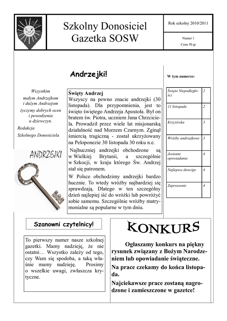 Szkolny Donosiciel Gazetka SOSW Andrzejki! Wszystkim małym Andrzejkom i dużym Andrzejom życzymy dobrych ocen i powodzenia u dziewczyn. Redakcja Szkolnego Donosiciela Rok szkolny 2010/2011 Numer 1 Cena 50 gr W tym numerze: Święty Andrzej Wszyscy na pewno znacie andrzejki (30 listopada). Dla przypomnienia, jest to święto świętego Andrzeja Apostoła. Był on bratem św. Piotra, uczniem Jana Chrzciciela. Prowadził przez wiele lat misjonarską działalność nad Morzem Czarnym. Zginął śmiercią tragiczną - został ukrzyżowany na Peloponezie 30 listopada 30 roku n.e. Najhuczniej andrzejki obchodzone są w Wielkiej Brytanii, a szczególnie w Szkocji, w kraju którego Św. Andrzej stał się patronem. W Polsce obchodzimy andrzejki bardzo hucznie. To wtedy wróżby najbardziej się sprawdzają. Dlatego w ten szczególny dzień najlepiej iść do wróżki lub powróżyć sobie samemu. Szczególnie wróżby matrymonialne są popularne w tym dniu. Święto Niepodległości 2 11 listopada 2 Krzyżówka 3 Wróżby andrzejkowe 3 Jesienne opowiadania 4 Najlepsze dowcipy 4 Zaproszenie 4 Szanowni czytelnicy! To pierwszy numer nasze szkolnej gazetki. Mamy nadzieję, że nie ostatni… Wszystko zależy od tego, czy Wam się spodoba, a taką właśnie mamy nadzieję. Prosimy o wszelkie uwagi, zwłaszcza krytyczne. Ogłaszamy konkurs na piękny rysunek związany z Bożym Narodzeniem lub opowiadanie świąteczne. Na prace czekamy do końca listopada. Najciekawsze prace zostaną nagrodzone i zamieszczone w gazetce! Str. 2 Szkolny Donosiciel Święto Niepodległości Narodowe Święto Niepodległości – polskie święto państwowe, obchodzone co roku 11 listopada, "dla upamiętnienia rocznicy odzyskania przez Naród Polski niepodległego bytu państwowego" w 1918 roku po 123 latach od rozbio- rów dokonanych przez Austrię, Prusy i Rosję. Ustanowione w ostatnich latach II RP, przywrócone w roku 1989. Jest dniem wolnym od pracy. 11 LISTOPADA Dzisiaj wielka jest rocznica jedenasty listopada!... Tym, co zmarli za Ojczyznę, hołd wdzięczności Polska składa. Żołnierzyków mamy dzielnych, bacznie strzegą granic kraju od nas tylko dziś zależy, aby było nam jak w raju. Więc o przyszłość walczmy społem, pod sztandarem z Orłem Białym, tylko pracą i nauką przysporzymy Polsce chwały Ludwik Wiszniewski Numer 1 Str. 3 Krzyżówka andrzejkowa Poziomo Pionowo 3. wróżysz sobie, bo chcesz ją poznać 5. zaczyna się wkrótce po Andrzejkach 6. sposób przepowiadania przyszłości 8. lejemy go przez ucho klucza 9. najlepsza pora na andrzejkową zabawę 11. miesiąc, w którym obchodzi się Andrzejki 1. wróżą sobie panny i ... 2. inaczej wróżba 4. rychło chce go wziąć panna 7. święto wróżb 10. w popularnej wróżbie ustawiamy je kolejno w kierunku drzwi Wróżby andrzejkowe - Wróżenie z obierki jabłka: trzeba obrać jabłko tak, aby powstała jedna cała obierka następnie rzucić ją za siebie, kształt obierki oznacza pierwszą literę imienia przyszłego męża lub żony. - Na stole pod plastykowymi kubkami kładziemy obrączkę i krzyżyk. Trzeci kubek pozostaje pusty. - Na 6 kartkach napisz swoje najskrytsze marzenia. Połóż na dnie dużej szklanej miski i powoli wlewaj wodę. Obserwuj karteczki, która pierwsza wypłynie na powierzchnie wody, to marzenie pierwsze się spełni. - Tradycyjna andrzejkowa wróżba polega na laniu wosku i odgadywaniu przyszłości z kształtu cienia Str. 4 Jesienna twórczość naszych kolegów Karina Lis klasa I gimnazjum „I LISTOPADA” 1 listopada jest Święto Wszystkich Świętych. W tym dniu odwiedza się groby naszych krewnych i bliskich osób, świeci się świeczki i daje się kwiaty lub palmy. W tym pojechałam na rowerze do Zbrosławic oraz Grzybowic, ponieważ tam leży mój dziadek i babcia. „JESIEŃ W PARKU” Podczas spaceru po parku zobaczyłam dużo opadających ładnych kolorowych liści, odlatujące ptaki. Widziałam również bawiące się dzieci, które huśtały się na huśtawkach. Niestety szybko zrobiło się chłodno i ciemno, więc poszłam do domu. Jagoda Sanitra, klasa I gimnazjum „JESIEŃ” Kiedy jesień nadchodzi, widzę dużo pięknych spadających liści z drzew. Czasami wiatr jest tak silny, że uszy mogą odpaść, a czasami jest ciepło. Lubię bardzo jesień. Uwielbiam chodzić na długie spacery. Najczęściej chodzę do dużego parku, a czasami z przyjaciółmi po mieście. Najlepsze dowcipy Trzej chłopcy chwalą się w szkole: -Dzisiaj pomogliśmy staruszce przejść przez ulicę! -Ale dlaczego aż we trzech? Przychodzi Kasia do lekarza: -Panie doktorze, ugryzł mnie pies. -Gdzie? - pyta lekarz. -Przed szkołą. - odpowiada Kasia -No bo się bardzo opierała! Żona do męża: -Odłóż choć raz tę gazetę! Nasza córka wychodzi za mąż! -To my mamy córkę!? -Dlaczego spóźniłeś się do szkoły? - pyta nauczycielka. -Bo mnie napadli bandyci! -Ojej, nic ci się nie stało? -Mnie nic, ale ukradli mi zeszyt z zadaniem Zapraszamy do wspólnego pisania i rysowania. Czekamy na Wasze rysunki, wiersze i opowiadania o tematyce zimowej i świątecznej i nie tylko. Najlepsze zamieścimy w Szkolnym Donosicielu. W następnym numerze także kącik przyrodniczy i geograficzny