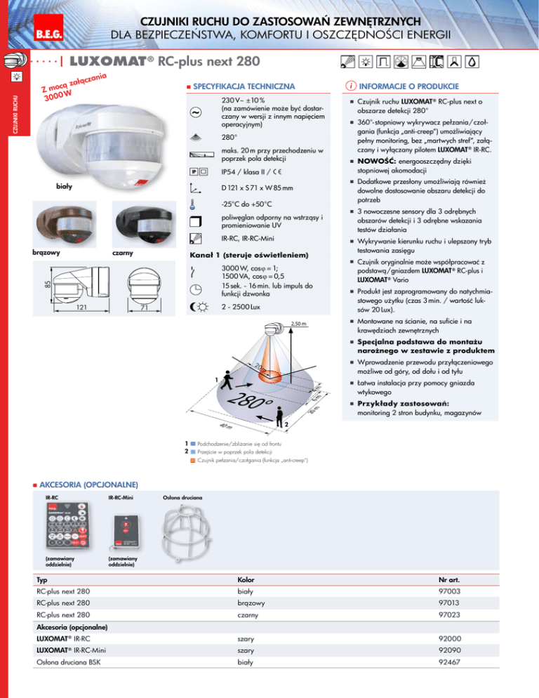 Czujniki ruchu do zastosowań zewnętrznych ® B.E.G. LUXOMAT dla bezpieczeństwa, komfortu i oszczędności energii | LUXOMAT ® RC-plus next 280 Czujniki ruchu ania ałącz z ą c Z mo W 30 0 0 Specyfikacja techniczna Informacje o produkcie 230 V~ ±10 % (na zamówienie może być dostarczany w wersji z innym napięciem operacyjnym) 280° maks. 20 m przy przechodzeniu w poprzek pola detekcji IP54 / klasa II / biały poliwęglan odporny na wstrząsy i promieniowanie UV IR-RC, IR-RC-Mini 85 Nowość: energooszczędny dzięki stopniowej akomodacji 3 nowoczesne sensory dla 3 odrębnych obszarów detekcji i 3 odrębne wskazania testów działania kierunku ruchu i ulepszony tryb testowania zasięgu Kanał 1 (steruje oświetleniem) 2 - 2500 Lux 71 wykrywacz pełzania/czołgania (funkcja „anti-creep”) umożliwiający pełny monitoring, bez „martwych stref”, załączany i wyłączany pilotem LUXOMAT ® IR-RC. Wykrywanie 3000 W, cosϕ = 1; 1500 VA, cosϕ = 0,5 15 sek. - 16 min. lub impuls do funkcji dzwonka 121 360°-stopniowy przesłony umożliwiają również dowolne dostosowanie obszaru detekcji do potrzeb -25°C do +50°C czarny ruchu LUXOMAT ® RC-plus next o obszarze detekcji 280° Dodatkowe D 121 x S 71 x W 85 mm brązowy Czujnik Czujnik oryginalnie może współpracować z podstawą/gniazdem LUXOMAT ® RC-plus i LUXOMAT ® Vario Produkt jest zaprogramowany do natychmiastowego użytku (czas 3 min. / wartość luksów 20 Lux). Montowane na ścianie, na suficie i na krawędziach zewnętrznych 2,50 m Specjalna podstawa do montażu narożnego w zestawie z produktem 20 m 6m 4m 280° 40 m 1 2 przewodu przyłączeniowego możliwe od góry, od dołu i od tyłu 20 1 Wprowadzenie m Łatwa instalacja przy pomocy gniazda wtykowego Przykłady zastosowań: monitoring 2 stron budynku, magazynów 2 Podchodzenie/zbliżanie się od frontu Przejście w poprzek pola detekcji Czujnik pełzania/czołgania (funkcja „anti-creep”) Akcesoria (opcjonalne) IR-RC IR-RC-Mini (zamawiany oddzielnie) (zamawiany oddzielnie) Osłona druciana Typ Kolor Nr art. RC-plus next 280 biały 97003 RC-plus next 280 brązowy 97013 RC-plus next 280 czarny 97023 LUXOMAT ® IR-RC szary 92000 LUXOMAT ® IR-RC-Mini szary 92090 Osłona druciana BSK biały 92467 Akcesoria (opcjonalne)