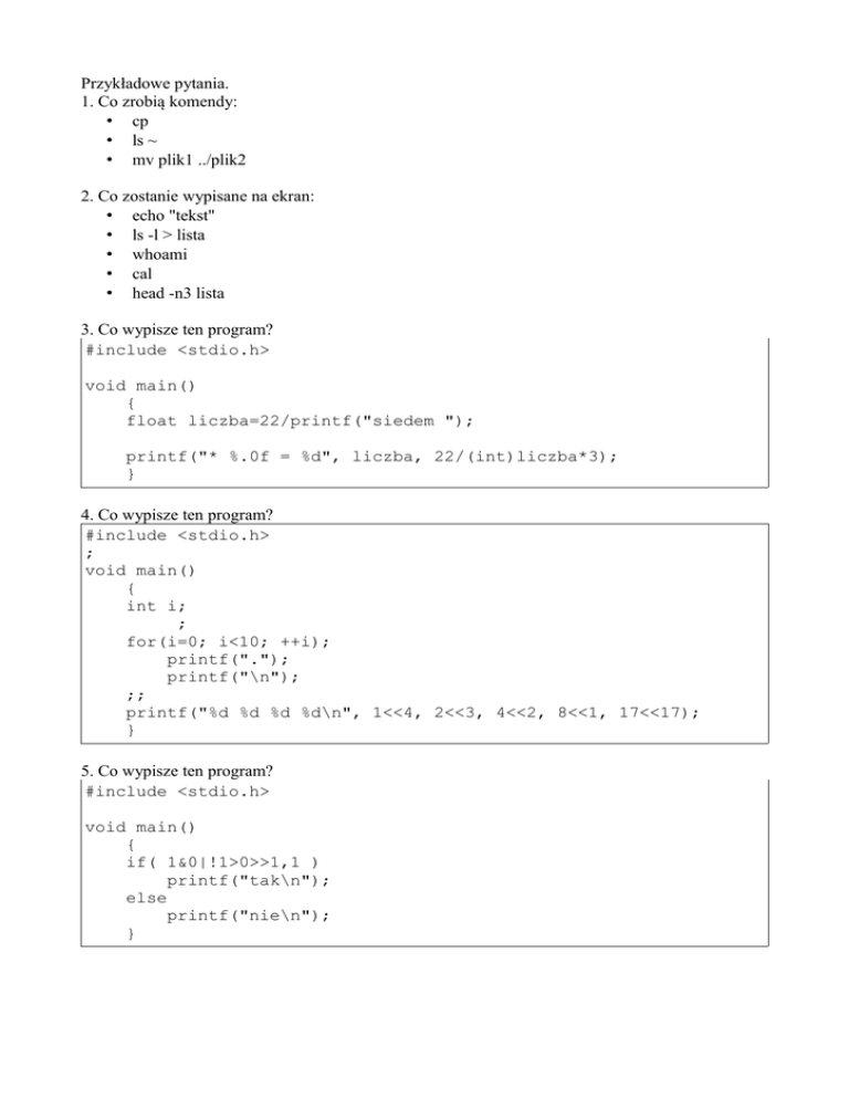 Przykładowe pytania. 1. Co zrobią komendy: • cp • ls ~ • mv plik1