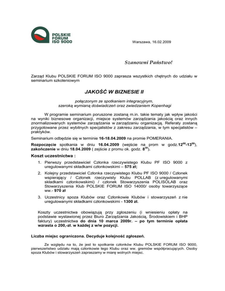 Warszawa, 16.02.2009 Szanowni Państwo! Zarząd Klubu POLSKIE FORUM ISO 9000 zaprasza wszystkich chętnych do udziału w seminarium szkoleniowym JAKOŚĆ W BIZNESIE II połączonym ze spotkaniem integracyjnym, szeroką wymianą doświadczeń oraz zwiedzaniem Kopenhagi W programie seminarium poruszone zostaną m.in. takie tematy jak wpływ jakości na wyniki biznesowe organizacji, miejsce systemów zarządzania jakością oraz innych znormalizowanych systemów zarządzania w zarządzaniu organizacją. Referaty zostaną przygotowane przez wybitnych specjalistów z zakresu zarządzania, w tym specjalistów – praktyków. Seminarium odbędzie się w terminie 16-18.04.2009 na promie POMERANIA. Rozpoczęcie spotkania w dniu 16.04.2009 (wejście na prom w godz.1200-1300), zakończenie w dniu 18.04.2009 ( zejście z promu ok. godz. 830). Koszt uczestnictwa : 1. Pierwszy przedstawiciel Członka rzeczywistego Klubu PF ISO 9000 z uregulowanymi składkami członkowskimi – 575 zł; 2. Kolejny przedstawiciel Członka rzeczywistego Klubu PF ISO 9000 / Członek wspierający / Członek rzeczywisty Klubu POLLAB (z uregulowanymi składkami członkowskimi) / członek Stowarzyszenia POLISOLAB oraz Stowarzyszenia Klub POLSKIE FORUM ISO 14000/ osoby towarzyszące ww.- 970 zł 3. Uczestnicy spoza Klubów oraz Członkowie Klubów i stowarzyszeń z nie uregulowanymi składkami członkowskimi - 1300 zł. Koszty uczestnictwa obowiązują przy zgłoszeniu (i wniesieniu opłaty na podstawie wystawionej przez Biuro Zarządzania Jakością, Środowiskiem i BHP faktury) uczestnictwa do dnia 10 marca 2009r. – po tym terminie opłata wzrasta o 200,-zł. w kaŜdej z w/w pozycji. Liczba miejsc ograniczona. Decyduje kolejność zgłoszeń. Ze względu na to, Ŝe jest to spotkanie członków Klubu POLSKIE FORUM ISO 9000, pierwszeństwo udziału mają członkowie tego Klubu oraz ww. gremiów współpracujących. Osoby spoza Klubów i stowarzyszeń zapraszamy w miarę wolnych miejsc. Organizatorzy zapewniają moŜliwość: - przyjazdu do Świnoujścia w przeddzień rozpoczęcia seminarium (tzn. 15.04.2009r.) w cenie 100,-zł/osoba (cena obejmuje: kolację w dniu 15.04.br, nocleg, śniadanie 16.04.br, transport hotel-prom oraz moŜliwość pozostawienia samochodu na parkingu hotelowym. LUB - przewozu uczestników seminarium z dworca kolejowego Szczecin Dąbie do bazy promowej w Świnoujściu – autobus odjedzie z parkingu przed dworcem PKP Szczecin 00 Dąbie 16.04.br o godz. 12 (autokar czeka na pasaŜerów pociągu IC, wyjeŜdŜającego z 35 Warszawy o godzinie 6 LUB - parking w bazie promowej w Świnoujściu (cena 40,-zł – płatne gotówką na miejscu, za cały okres rejsu) Informacji szczegółowych dotyczących programu seminarium udziela organizator techniczny spotkania - Biuro Zarządzania Jakością, Środowiskiem i BHP (BZJŚBHP) (tel. O22 691 8191) oraz Sekretariat Klubu (tel. 022 4645503). Ze względów organizacyjnych prosimy o odcięcie i przesłanie KARTY UCZESTNICTWA (w załączeniu) na adres Organizatora technicznego faxem pod numer 022 632 28 20 w terminie najlepiej do 10 marca 2009. Z powaŜaniem ElŜbieta Krodkiewska-Skoczylas Prezes Klubu POLSKIE FORUM ISO 9000 KARTA UCZESTNICTWA w seminarium szkoleniowym „JAKOŚĆ W BIZNESIE II” Członek rzeczywisty PF ISO 9000 nr: Członek wspierający PF ISO 9000 nr: 16-18.04.2009 Członek Rzeczywisty Klubu POLLAB nr 1. Pierwsza osoba członka rzeczywistego Klubu PF ISO 9000 z uregulowanymi składkami 575 zł.: Nazwa firmy, adres: Imię i nazwisko: Data i miejsce urodzenia, nr dowodu osobistego lub paszportu, adres zameldowania: Telefon : Fax : E-mail : 2. Kolejna osoba Członka rzeczywistego Klubu PF ISO 9000 / Członek wspierający / Członek rzeczywisty Klubu POLLAB (z uregulowanymi składkami członkowskimi) / członek Stowarzyszenia POLISOLAB oraz Stowarzyszenia Klub POLSKIE FORUM ISO 14000 / osoby towarzyszące ww.- 970 zł. Nazwa firmy, adres: Imię i nazwisko: Data i miejsce urodzenia, nr dowodu osobistego lub paszportu, adres zameldowania: Telefon : Fax : E-mail : 3. Uczestnicy spoza Klubów oraz Członkowie Klubów i Stowarzyszeń z nie uregulowanymi składkami członkowskimi - 1300 zł Nazwa firmy, adres: Imię i nazwisko: Data i miejsce urodzenia, nr dowodu osobistego lub paszportu, adres zameldowania: Telefon : E-mail : Fax : • • • Rezerwuję nocleg w Świnoujściu dn.15/16.04.br w cenie 100 zł/osoba dla …… osób TAK* NIE* Rezerwuję miejsce w autokarze Szczecin Dąbie – baza promowa w Świnoujściu dla …… osób TAK* NIE* Rezerwuję miejsce parkingowe w bazie promowej w Świnoujściu TAK* NIE* * właściwe zakreślić Zobowiązujemy się do pokrycia kosztów udziału po otrzymaniu faktury VAT Nasz NIP : Data Podpis uczestnika Data Organizator techniczny: Biuro Zarządzania Jakością, Środowiskiem i BHP Sp. z o.o. ul. Kasprzaka 25, 01-224 Warszawa, tel. 022 691 81 91, 691 81 92 e-mail: [email protected]; www.bzj.pl Uwaga: Wymagane posiadanie aktualnego dowodu osobistego. Kartę uczestnictwa proszę przesłać faxem do organizatora technicznego pod numer (022) 632 28 20 do dnia 10.03.2009 r. Podpis osoby delegującej