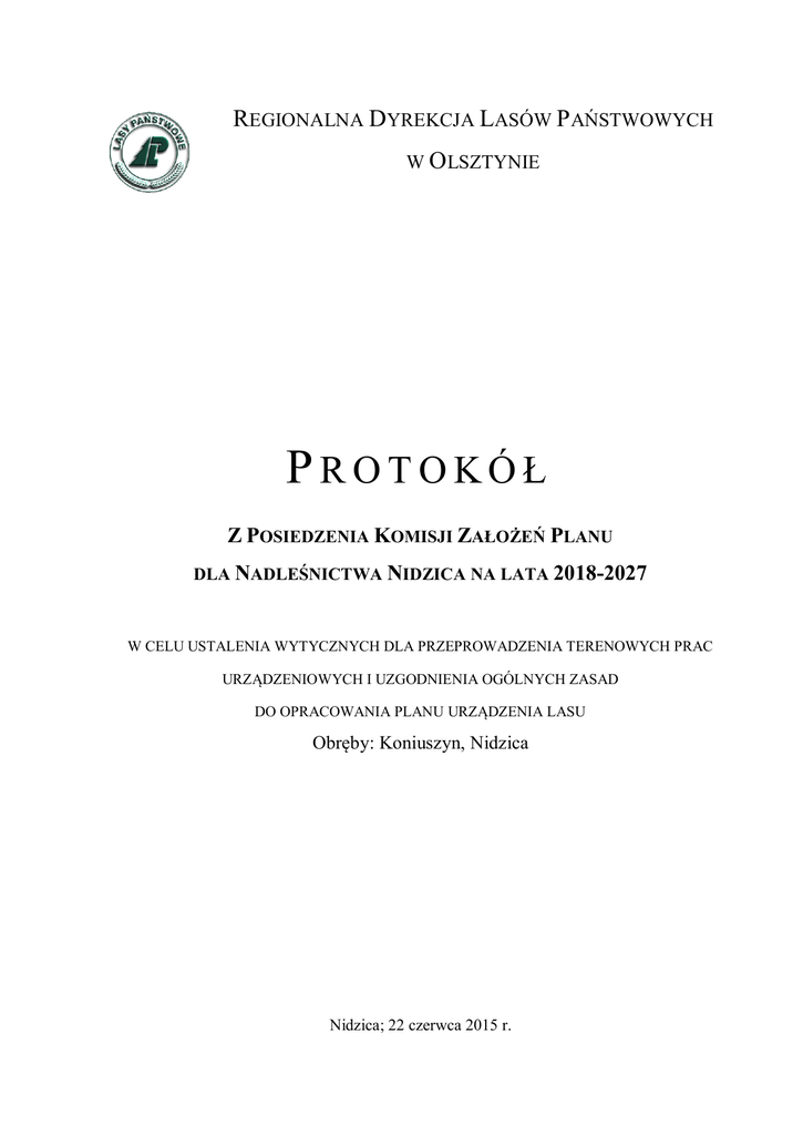 REGIONALNA DYREKCJA LASÓW PAŃSTWOWYCH W O LSZTYNIE PROTOKÓŁ Z POSIEDZENIA KOMISJI ZAŁOŻEŃ PLANU DLA NADLEŚNICTWA NIDZICA NA LATA 2018-2027 W CELU USTALENIA WYTYCZNYCH DLA PRZEPROWADZENIA TERENOWYCH PRAC URZĄDZENIOWYCH I UZGODNIENIA OGÓLNYCH ZASAD DO OPRACOWANIA PLANU URZĄDZENIA LASU Obręby: Koniuszyn, Nidzica Nidzica; 22 czerwca 2015 r. Na podstawie ustawy o lasach z dnia 28 września 1991 r., w lasach Skarbu Państwa, w zarządzie Państwowego Gospodarstwa Leśnego Lasy Państwowe, trwale zrównoważoną gospodarkę leśną prowadzi nadleśniczy na podstawie planu urządzenia lasu. Oprócz ustawy o lasach, plan będzie zgodny z ustawami: prawo ochrony środowiska z dnia 27 kwietnia 2001 r.; o ochronie przyrody z dnia 16 kwietnia 2004 r., o dostępie do informacji publicznej dnia 6 września 2001; o ochronie baz danych z dnia 27 lipca 2001 r.; o udostępnianiu informacji o środowisku i jego ochronie, udziale społeczeństwa w ochronie środowiska oraz ocenach oddziaływania na środowisko z dnia 3 października 2008 r.; o planowaniu przestrzennym z dnia 27 marca 2003 r.; o leśnym materiale rozmnożeniowym z dnia 7 czerwca 2001 r. i innych. Na podstawie Zarządzenia nr 55 Dyrektora Generalnego Lasów Państwowych z dnia 21 listopada 2011 r., Dyrektor Regionalnej Dyrekcji Lasów Państwowych w Olsztynie zwołał posiedzenie Komisji Założeń Planu, mającej na celu ustalenie i przyjęcie wytycznych do prac terenowych nowego planu urządzenia lasu, na lata 1.01.2018 do 31.12.2027. Posiedzenie Komisji odbyło się w dniu 30 czerwca 2015 r. w siedzibie Nadleśnictwa Nidzica. Skład Komisji: Przewodniczący: Paweł Artych - Zastępca Dyrektora ds. Gospodarki Leśnej RDLP w Olsztynie 1) Przedstawiciele RDLP w Olsztynie Zbigniew Karaś - Naczelnik Wydziału Zarządzania Zasobami Leśnymi Aleksander Sydoruk - Specjalista SL Piotr Mioduszewski - Naczelnik Wydziału Gospodarowania Ekosystemami Mieszko Godlewski - Starszy specjalista SL Wojciech Wolcendorf - Wydział Urządzania Lasu Wojciech Chmielewski - Zespół Ochrony Lasu 2) Przedstawiciele DGLP 3) Przedstawiciele Nadleśnictwa Nidzica Ryszard Schuetz - Nadleśniczy Piotr Stelmaszczyk - Zastępca Nadleśniczego Dominik Gonciarz - Inżynier Nadzoru Marcin Pena - Sekretarz Bartosz Hutek - Specjalista SL Justyna Rogowska - Specjalista SL Zbigniew Słupski - PSP Nidzica Marcin Kuran - Stowarzyszenie „Dolina Naszej Łyny” Lucjan Szuniewicz - SITLiD Kazimierz Łapa - Orłowskie Centrum Aktywności Lokalnej Tomasz Stojanowski - ZPHU „Falco” Witold Zagożdżon - Towarzystwo Ziemi Nidzickiej Leszek Jabłoński - Urząd Gminy Janowiec Kościelny Jolanta Ziemska - Towarzystwo Rozwoju okolic Omulewa „Razem dla 4) Goście wszystkich” Krzyszfof Zdziarski - UG Janowo W wyniku dyskusji nad referatem Nadleśniczego oraz koreferatem Naczelnika Wydziału Zarządzania Zasobami Leśnymi przedłożonymi na posiedzeniu Komisji Założeń Planu, przyjęto następujące ustalenia: 1. Wstęp Nadleśnictwo Nidzica jest jednym z 33 nadleśnictw nadzorowanych przez Regionalną Dyrekcję Lasów Państwowych w Olsztynie. Podzielone jest na dwa obręby leśne oraz 15 leśnictw. W Nadleśnictwie funkcjonuje również OHZ. Według regionalizacji przyrodniczo – leśnej Polski 2010 lasy nadleśnictwa położone są w: I Krainie Bałtyckiej, w mezoregionie: Garbu Lubawskiego (I.26) II Krainie Mazursko - Podlaskiej, w mezoregionie: Puszcz Mazurskich (II.4) IV Krainie Mazowiecko-Podlaskiej, w mezoregionie: Wzniesień Mławskich (IV.1) Terytorialnie Nadleśnictwo znajduje się w województwie warmińsko-mazurskim, na terenie trzech powiatów i siedmiu gmin. 2. Zagadnienia geodezyjne, stan posiadania Nadleśnictwo ma założone księgi wieczyste na 100 % powierzchni, a na jednej działce istnieje współwłasność (0,20 ha). Aktualna powierzchnia wg stanu na dzień 31.12.2014 r. wynosi: 24 134,54 ha (ze zredukowanymi współwłasnościami). Przebieg granic jest zgodny z zarządzeniem Dyrektora Generalnego nr 82 z dnia 29 grudnia 2014 r. Od 1.07.2017 r. należy, w miarę możliwości, wstrzymać obrót gruntami w celu zapewnienia zgodności planu urządzenia lasu. Wykonawca dokona porównania zapisów ewidencyjnych ze stanem na gruncie, przy wykorzystaniu nowej ortofotomapy. Tak sporządzony wykaz rozbieżności zostanie przedstawiony Nadleśniczemu, do akceptacji. Dane cyfrowe z Ewidencji Gruntów i Budynków zostaną pobrane przez RDLP i przekazane wykonawcy. Zasięg terytorialny nadleśnictwa obejmuje plan zagospodarowania przestrzennego województwa warmińsko – mazurskiego uchwalony Nr XXXIII/505/02 z dnia 12 lutego 2002 roku. został przez Sejmik Województwa Uchwałą Teren z żadnej gmin nie posiada całościowego miejscowego planu zagospodarowania przestrzennego. Istnieją tylko plany dla niektórych obrębów ewidencyjnych. 3. Klasyfikacja gruntów leśnych i nieleśnych Ustalono, że podczas prac terenowych wykonawca na bieżąco będzie sporządzał wykaz rozbieżności pomiędzy stanem ewidencyjnym, a faktycznym na gruncie. Protokół rozbieżności zostanie uzgodniony z Nadleśnictwem i przekazany do wiadomości RDLP. Przed przystąpieniem do prac terenowych, Nadleśnictwo w porozumieniu z Wydziałem Gospodarowania Ekosystemami oraz Zarządzania Zasobami Leśnymi RDLP dokona analizy pod kątem zagospodarowania użytków nieleśnych (szczególnie pod kątem możliwości zalesień). Należy wnikliwie przeanalizować: użytki rolne – 316,54 ha oraz nieużytki – 431,14 ha. Wg EGiB w Nadleśnictwie znajduje się około 11 ha Wp. Użytki te należy przekazać Marszałkowi Województwa (po wydzieleniu ich przez niego geodezyjnie) lub dokonać zmian w ewidencji. Do planu zalesień zostaną przeznaczone jedynie działki objęte decyzją o ustaleniu wstępnych warunków zabudowy i zagospodarowania terenu lub zakwalifikowane do zalesienia w mpzp. Obowiązek uzyskania takiej decyzji spoczywa na Nadleśnictwie, które przekaże wykonawcy listę dzi