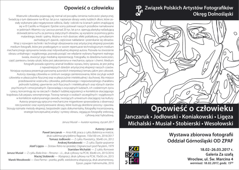 Opowieść o człowieku Wizerunki człowieka pojawiają się niemal od początku istnienia twórczości plastycznej. Świadczą o tym datowane na 40 tys. lat p.n.e. najstarsze obrazy wielu ludzkich dłoni, które zostały wykonane jako negatywowe odbicia, ślady i odciski na ścianach jaskini znajdującej się w El Castillo w Hiszpanii. Epickie sceny polowań naszych przodków namalowane w jaskiniach Altamiry czy Lascoux ponad 20 tys. lat p.n.e. operują plastyką naśladującą doświadczenia ruchu za pomocą statycznych obrazów, są wyrażone za pomocą gestu malarskiego, kreski i palmy. Można w nich dostrzec efekt poklatkowy, symultanizm zachodzących zjawisk, częściowe nakładanie i przenikanie się obrazów. Wraz z rozwojem techniki i technologii obrazowania oraz artystycznej ekspresji powstało medium fotografii, które jest przebogatym w swoim repertuarze technologicznym medium mechanicznego opisywania świata oraz indywidualnej ekspresji autora. Pozwala na stworzenie obrazu unikalnego i wyjątkowego, pozwala posiąść we władanie wybrany fragment realnego świata, stworzyć jego medialną reprezentację. Fotografia, to dziedzina twórczości, część panteonu świata sztuki, która jest zakorzeniona w mechanice, optyce i chemii. Medium fotografii posiada ogromny arsenał środków wyrazu, który sprawia, że jest jedną z najważniejszych dziedzin artystycznej ekspresji naszych czasów. Niniejsza wystawa prezentuje panoramę autorskich interpretacji tematu jakim jest człowiek. Autorzy stawiają człowieka w centrum swojego zainteresowania, które oscyluje wokół człowieka w płaszczyźnie fizycznej oraz w płaszczyźnie intelektualnej i duchowej. Ma miejsce przedstawienie wizerunku człowieka, jednostkowego i niepowtarzalnego charakteru jednostki ludzkiej, ujawnienie cech fizycznych i intelektualnych oraz różnych stanów psychicznych i emocjonalnych. Opowiadają o zwyczajnych ludziach, ich codziennym życiu i pracy, koncentrują się na rzeczach i śladach ludzkiej egzystencji w kontekście otaczającego krajobrazu lub pejzażu wewnętrznego. Tworzą narracje o osobach szczególnych i wyjątkowych w kontekście wykonywanego zawodu, tworzących uniwersum otaczającej nas kultury. Autorzy proponują optyczno-mechaniczne migawkowe sprawozdania z obserwacji rzeczywistości oraz wyreżyserowane obrazy, które ilustrują określone procesy i zjawiska. Stosują rozmaite metody ekspresji, bezpośredni zapis dokumentalny, fotografię inscenizowaną, strategie konceptualnej analizy i syntezy obrazu, sięgają po fotografię srebrową, cyfrową oraz hybrydową. Janusz Musiał — kurator wystawy, styczeń 2017 Autorzy i prace: Paweł Janczaruk — Ania # 88, praca z cyklu Baletnica w mieście, druk sublimacyjny/płótno flagowe, 150x100 cm, 2016/2017 Tomasz Jodłowski — Z cyklu Powstańcy, 30x40 cm, 2012 Andrzej Koniakowski — Z cyklu Śląskie spojrzenie Józef Ligęza — Zestaw Retro na sprzedaż, Clignancourt pod Paryżem, 1979 Stanisław Michalski — Z cyklu Romowie Janusz Musiał — Z cyklu Biała linia – Persona – J.L., druk cyfrowy na PCW, 30x40 cm, 2015/2016 Maciej Stobierski — Wytapiacz, druk cyfrowy na PCW, 70x50 cm, 2015 Marek Wesołowski — Ewa Parma – poetka, grafik, wielokrotna ekspozycja, druk atramentowy, Epson, papier Hahnemuhle, 2016 Związek Polskich Artystów Fotografików Okręg Dolnośląski Opowieść o człowieku Janczaruk • Jodłowski • Koniakowski • Ligęza Michalski • Musiał • Stobierski • Wesołowski Wystawa zbiorowa fotografii Oddział Górnośląski OD ZPAF 18.02–26.03.2017 r. Galeria Za szafą Wrocław, ul. Św. Marcina 4 wernisaż: 18.02.2017, godz. 1500 Paweł Janczaruk Andrzej Koniakowski Józef Ligęza Ekonomista, ukończył Wyższą Szkołę Ekonomiczną w Katowicach. Fotografią zainteresował się jeszcze w szkole średniej. Po ukończeniu studiów przez 17 lat był aktywnym członkiem Katowickiego Towarzystwa Fotograficznego, które ukształtowało jego postawę artystyczną. Zdobył ponad 100 nagród, medali i wyróżnień na Krajowych i Międzynarodowych Salonach Fotografii Artystycznej, w tym 25 nagród głównych oraz prestiżowy Złoty Medal Międzynarodowej Federacji Sztuki Fotograficznej (FIAP). Otrzymał Medal 150-lecia Fotografii. Stypendysta Ministerstwa Kultury. Jego prace znajdują się w zbiorach wielu muzeów w kraju i za granicą. Autor wielu wystaw indywidualnych i przeszło 270 wystaw zbiorowych. Poświęca wiele czasu dla młodzieży, której pracami fotograficznymi żywo się interesuje. Członek ZPAF od 1977 r., nr leg. 452. Członek ZPAF i Fotoklubu RP. Organizator Warsztatów Fotowidzenia, współtwórca Tylko Fotografia — Prawdziwa Szkoła Fotografii, prowadzi Pracownię Edukacji Fotograficznej ZUTW grupy Fotograficzna Fabryczna. Autor 37 wystaw indywidualnych. Uczestnik ponad 490 wystaw zbiorowych, gdzie otrzymał 75 nagród. Odznaczony Srebrnym Medalem Zasłużony dla Fotografii Polskiej, Brązową Odznaką Polskiej Federacji Stowarzyszeń Fotograficznych i Złotą Odznaką LubuskiegoTowarzystwa Kultury. Prace w kolekcjach prywatnych w Polsce, Holandii, Niemczech, Francji, Czechach i Belgii. Autor książek Wszystko, co chcę powiedzieć o otworkach, RetroFotografia, czyli dawne techniki fotograficzne, Wszystko, co wiem o technikach fotograficznych i minialbumu Puchełki, kiedy życie było piękne — łomografie z puchełkami, Jest taki samotny dwór. Stypendysta Marszałka Województwa Śląskiego w Dziedzinie Kultury: projekt fotograficzny Sound of Silesia. Współtwórca zdjęć do ogólnopolskiej kampanii społecznej Wychowały nas książki na zlecenie Ministerstwa Kultury i Dziedzictwa Narodowego. Liczne nagrody w konkursach fotograficznych. Uczestnik kilkudziesięciu wystaw krajowych i zagranicznych. Publikacje albumowe: Polska i Polacy, 303 zdjęcia, które musisz znać, 10 lat Grand Press Photo, Fotografie Rzeczpospolitej 2006–2009, Poland Polska Polonia, Wielka woda. Wsp