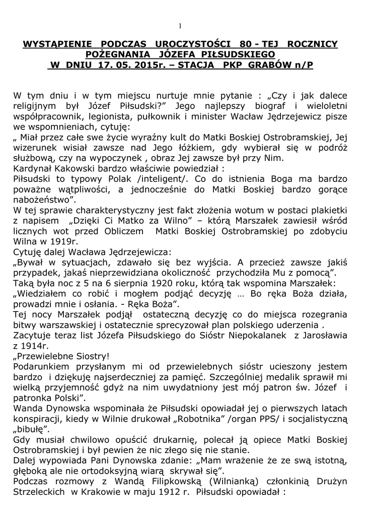 1 WYSTĄPIENIE PODCZAS UROCZYSTOŚCI 80 - TEJ ROCZNICY POŻEGNANIA JÓZEFA PIŁSUDSKIEGO W DNIU 17. 05. 2015r. – STACJA PKP GRABÓW n/P W tym dniu i w tym miejscu nurtuje mnie pytanie : „Czy i jak dalece religijnym był Józef Piłsudski?” Jego najlepszy biograf i wieloletni współpracownik, legionista, pułkownik i minister Wacław Jędrzejewicz pisze we wspomnieniach, cytuję: „ Miał przez całe swe życie wyraźny kult do Matki Boskiej Ostrobramskiej, Jej wizerunek wisiał zawsze nad Jego łóżkiem, gdy wybierał się w podróż służbową, czy na wypoczynek , obraz Jej zawsze był przy Nim. Kardynał Kakowski bardzo właściwie powiedział : Piłsudski to typowy Polak /inteligent/. Co do istnienia Boga ma bardzo poważne wątpliwości, a jednocześnie do Matki Boskiej bardzo gorące nabożeństwo”. W tej sprawie charakterystyczny jest fakt złożenia wotum w postaci plakietki z napisem „Dzięki Ci Matko za Wilno” – którą Marszałek zawiesił wśród licznych wot przed Obliczem Matki Boskiej Ostrobramskiej po zdobyciu Wilna w 1919r. Cytuję dalej Wacława Jędrzejewicza: „Bywał w sytuacjach, zdawało się bez wyjścia. A przecież zawsze jakiś przypadek, jakaś nieprzewidziana okoliczność przychodziła Mu z pomocą”. Taką była noc z 5 na 6 sierpnia 1920 roku, którą tak wspomina Marszałek: „Wiedziałem co robić i mogłem podjąć decyzję … Bo ręka Boża działa, prowadzi mnie i osłania. - Ręka Boża”. Tej nocy Marszałek podjął ostateczną decyzję co do miejsca rozegrania bitwy warszawskiej i ostatecznie sprecyzował plan polskiego uderzenia . Zacytuje teraz list Józefa Piłsudskiego do Sióstr Niepokalanek z Jarosławia z 1914r. „Przewielebne Siostry! Podarunkiem przysłanym mi od przewielebnych sióstr ucieszony jestem bardzo i dziękuję najserdeczniej za pamięć. Szczególniej medalik sprawił mi wielką przyjemność gdyż na nim uwydatniony jest mój patron św. Józef i patronka Polski”. Wanda Dynowska wspominała że Piłsudski opowiadał jej o pierwszych latach konspiracji, kiedy w Wilnie drukował „Robotnika” /organ PPS/ i socjalistyczną „bibułę”. Gdy musiał chwilowo opuścić drukarnię, polecał ją opiece Matki Boskiej Ostrobramskiej i był pewien że nic złego się nie stanie. Dalej wypowiada Pani Dynowska zdanie: „Mam wrażenie że ze swą istotną, głęboką ale nie ortodoksyjną wiarą skrywał się”. Podczas rozmowy z Wandą Filipkowską (Wilnianką) członkinią Drużyn Strzeleckich w Krakowie w maju 1912 r. Piłsudski opowiadał : 2 „Wie Pani , że ja stary socjalista gdy mam podjąć ważną decyzję, to przedtem modlę się do Matki Boskiej Ostrobramskiej .” We wrześniu 1935 roku, już po śmierci Piłsudskiego , ojciec Maksymilian Maria Kolbe opublikował artykuł w „Rycerzu Niepokalanej” pt. „Jak Marszałek Piłsudski kochał Niepokalaną „’ którego fragmenty cytuję: „ „Wiadomo było bliskim, że modli się codziennie przed zawieszonym nad łóżkiem wizerunkiem Ostrobramskiej Pani, który go nigdy nie opuszczał… Ks. Senator Żebrowski opowiadał mi jak to Marszałek jako Naczelnik Państwa przyjechał do Wilna i nie chciał się położyć na spoczynek dopokąd nie znaleziono dla Niego obrazu Matki Bożej Ostrobramskiej i nie umieszczono nad łóżkiem…” W dniu 25 sierpnia 1920r. a więc tuż po przełomie Bitwy Warszawskiej Marszałek Józef Piłsudski ogłasza akt oddania Polski - Sercu Najświętszej Panny Maryi który cytuję: „Jako Naczelnik Rzeczpospolitej Polskiej, Najwyższy Wódz Wojska Polskiego, imieniem własnym i całego Narodu składam Tobie Najświętsza Panno Maryio, a przez Ciebie Bogu w Trójcy Jedynemu najgorętsze dzięki za wszystkie łaski wyświadczone Narodowi Polskiemu w ciągu dziewięciu wieków, za wydźwignięcie go z ciężkiej niewoli i za zwycięstwo Oręża Polskiego w ostatnich walkach. Wdzięczni za Twoją opiekę błagamy Cię o nią nadal, my dzieci Twoje i poddani Twoi. Bądź że nam jak dotąd dobrą Matką i łaskawą Królową, oddal od nas grzechy i klęski, a przywróć nam pożądany pokój. My wzajem przyrzekamy, że według sił naszych starać się będziemy, by Naród nasz i Twój spełnił sumiennie posłannictwo dane mu od Boga, by też za jego przyczyną kwitły dobre obyczaje, ofiarna miłość Ojczyzny, sprawiedliwość dla wszystkich, troskliwość o poprawę doli Narodu. Do tego niech nam dopomoże Bóg, Ty zaś, Najświętsza Królowo, wstaw się za nami i wyproś nam błogosławieństwo Niebios. Amen” Nuncjusz Kardynał Achille Ratti - późniejszy Papież Pius XI pisał: „Pamiętam, gdy byliśmy razem u Marszałka Piłsudskiego w Wilnie, byłem świadkiem jak gorąco modlił się Marszałek Piłsudski w Ostrej Bramie przed obrazem Matki Boskiej. Dał mi do poświęcenia dwa obrazy Matki Bożej, ażeby później powiesić Je nad łóżkami najdroższych istot, swoich córeczek”. Ojciec Maksymilian Kolbe, pisał że kiedy Piłsudski otrzymał obraz Matki Bożej Ostrobramskiej – powiedział. „Matka Najświętsza wzięła na Siebie jakoby ministerium dobroci, bo kiedy człowiek chociażby tylko patrzy na ten obraz , to staje się lepszym.” Jest rok 1927, drugi dzień lipca, Wilno. Wielki dzień koronacji obrazu Matki Boskiej Łaskawej w Ostrej Bramie. Pada ulewny deszcz. Któryś z dostojników kościelnych proponuje przenieść uroczystości do Katedry Wileńskiej, ale ... czekają na decyzję Marszałka Józefa Piłsudskiego - toż to jego ukochane miasto. Chwile płyną, deszcz pada. 3 Wreszcie ... przedstawiają propozycję ... Nie, nie zgodził się! Stoi przed Ostrą Bramą w ulewie .... Jeden z księży rozpościera nad nim parasol, a On rzekł: „Schowaj, ksiądz ten parasol ! Kiedy koronują Królowe Polski - można stać na deszczu! Jestem u Matki Boskiej na ordynansach !" /Czy tak może powiedzieć niewierzący?/ Srebrny medalik z Matką Boską Ostrobramską miał Józef Piłsudski 