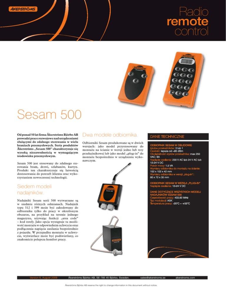 Radio remote control Sesam 500 Od ponad 50 lat firma Åkerströms Björbo AB prowadzi prace rozwojowe nad urządzeniami służącymi do zdalnego sterowania w wielu branżach przemysłowych. Seria produktów Åkerströms „Sesam 500” charakteryzuje się wysoką niezawodnością w wymagającym środowisku przemysłowym. Sesam 500 jest stosowany do zdalnego sterowania bram, drzwi, szlabanów, kurtyn. Produkt ten charakteryzuje się łatwością dostosowania do potrzeb klienta oraz wykorzystaniem nowoczesnej technologii. Dwa modele odbiornika. Odbiorniki Sesam produkowane są w dwóch wersjach: jako model przystosowany do montażu na ścianie w wersji jedno lub trzy przekaźnikowej lub jako model „plug-in” do montażu bezpośrednio w urządzeniu wykonawczym. ODBIORNIK SESAM W OBUDOWIE Liczba przekaźników: 3 lub 1 Czułość: lepsza od –95 dBm Obciążalność styków przekaźnika: max 250 VAC; 6A Napięcie zasilania: 230 V AC lub 24 V AC lub 12-24 V DC Pobór mocy: 1.5 VA Wymiary odbiornika do montażu na ścianie: 152 x 102 x 42 mm Wymiary odbiornika w wersji „plug-in”: 80 x 72 x 35 mm ODBIORNIK SESAM W WERSJI „PLUG-IN” Napięcie zasilania: 12-24 V DC Siedem modeli nadajników. Nadajniki Sesam serii 500 wytwarzane są w siedmiu różnych odmianach. Nadajnik typu 512 i 599 może być zakodowany do odbiornika tylko do pracy w określonym obszarze, na przykład na terenie jednego magazynu, używając funkcji „area code” – kod strefy. Jako opcja występuje tu możliwość montażu w odpowiednim uchwycie oraz podłączenia napięcia zasilania bezpośrednio z pojazdu. W przypadku montażu w uchwycie, wyświetlacz może być podświetlany, co znakomicie polepsza komfort pracy. Version 6, August 2009 DANE TECHNICZNE Åkerströms Björbo AB, SE-785 45 Björbo, Sweden. DANE DOTYCZĄCE WSZYSTKICH MODELI NADAJNIKÓW SESAM 500 Częstotliwość pracy: 433.92 MHz Typ modulacji: ASK Temperatura pracy: -25°C – +55°C [email protected] Åkerströms Björbo AB reserve the right to change information in this document without notice. akerstroms.com remote Radio control remote control Radio remote control DANE TECHNICZNE SESAM 501 Liczba funkcji: 1 Liczba drzwi: 1 Moc nadajnika: 10 mW Pobór prądu: 25 mA Napięcie zasilania: 9 V bateria Wymiary: 100 x 60 x 25 mm Waga: 125 g SESAM 503 Liczba funkcji: 3 Liczba drzwi: 3 Moc nadajnika: 10 mW Pobór prądu: 25 mA Napięcie zasilania: 9 V bateria Wymiary: 100 x 60 x 25 mm Waga: 125 g SESAM 506 Liczba funkcji: 6 Liczba drzwi: 6 Moc nadajnika: 10 mW Pobór prądu: 25 mA Napięcie zasilania: 9 V bateria Wymiary: 100 x 60 x 25 mm Waga: 125 g SESAM 512 & SESAM 512 B Liczba funkcji nadajnika 512: 3 Liczba funkcji nadajnika 512 B: 1 Liczba drzwi: 12 Liczba kodów stref: 27 Moc nadajnika: 10 mW Pobór prądu: 35 mA przy zastosowaniu bateri, 100 mA przy wykorzystaniu uchwytu Napięcie zasilania: 9 V bateria lub 12–24 V DC przy wykorzystaniu uchwytu Wymiary: 142 x 68 x 26 mm Waga: 175 g SESAM 599 & SESAM 599 B Liczba funkcji nadajnika 599: 3 Liczba funkcji nadajnika 599 B: 1 Liczba drzwi: max 999 Liczba kodów stref: min 27 Moc nadajnika: 10 mW Pobór prądu: 35 mA przy zastosowaniu bateri, 100 mA przy wykorzystaniu uchwytu Napięcie zasilania: 9 V bateria lub 12–24 V DC przy wykorzystaniu uchwytu Wymiary: 142 x 68 x 26 mm Waga: 175 g Version 6, August 2009 Åkerströms Björbo AB, SE-785 45 Björbo, Sweden. Radioautomatyka e-mail: [email protected] tel. +48 22 756 49 10 fax +48 22 717 51 42 akerstroms.com [email protected] www.radioautomatyka.pl Åkerströms Björbo AB reserve the right to change information in this document without notice. Version 6, August 2009 Åkerströms Björbo AB, SE-785 45 Björbo, Sweden. [email protected] Åkerströms Björbo AB reserve the right to change information in this document without notice. akerstroms.com