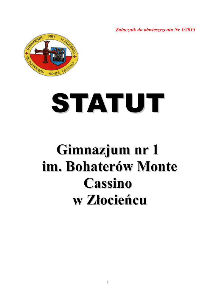 Załącznik do obwieszczenia Nr 1/2015 STATUT Gimnazjum nr 1 im. Bohaterów Monte Cassino w Złocieńcu 1 SPIS TREŚCI: ROZDZIAŁ I Postanowienia ogólne …..................................................................................str.3 ROZDZIAŁ II Cele i zadania szkoły …..................................................................................str.3 ROZDZIAŁ III Sposoby realizacji zadań szkoły ….................................................................str.5 ROZDZIAŁ IV Organy szkoły i ich kompetencje …...............................................................str.9 ROZDZIAŁ V Organizacja gimnazjum …................ ….........................................................str.18 ROZDZIAŁ VI Szkolny system wychowania ….....................................................................str.22 ROZDZIAŁ VII Nauczyciele i pracownicy szkoły …..............................................................str.24 ROZDZIAŁ VIII Podstawowe prawa i obowiązki członka społeczności .................................str.31 ROZDZIAŁ IX Uczniowie szkoły ….......................................................................................str.35 ROZDZIAŁ X Gospodarka finansowa …...............................................................................str.37 ROZDZIAŁ XI Przepisy przejściowe …..................................................................................str.37 ROZDZIAŁ XII Przepisy końcowe …......................................................................................str.38 2 ROZDZIAŁ I POSTANOWIENIA OGÓLNE § 1.1 Gimnazjum nr 1 im. Bohaterów Monte Cassino w Złocieńcu, zwane dalej szkołą jest placówką publiczną. 2. Siedzibą gimnazjum jest budynek przy ul. Chopina 10 w Złocieńcu. 3. Organem prowadzącym jest gmina Złocieniec. 4. Nadzór pedagogiczny sprawuje Kurator Oświaty w Szczecinie. 5. Szkoła używa nazwy: Gimnazjum nr 1 im. Bohaterów Monte Cassino w Złocieńcu. 1) Nazwa skrócona szkoły: Gimnazjum nr 1 w Złocieńcu. 6. Ustalona nazwa używana jest w pełnym brzmieniu. 7. Gimnazjum nr 1 im. Bohaterów Monte Cassino w Złocieńcu jest jednostką budżetową. 8. Gimnazjum nr 1 im. Bohaterów Monte Cassino w Złocieńcu działa z mocy ustawy z dnia 7 września 1991 r. o systemie oświaty zwanej dalej Ustawą o Systemie Oświaty, uchwały Nr VII/54/99 Rady Miejskiej w Złocieńcu z dnia 4 marca 1999 r. – Akt Założycielski Gimnazjum w Złocieńcu (z późniejszymi zmianami) oraz niniejszego Statutu. ROZDZIAŁ II CELE I ZADANIA SZKOŁY § 2. Szkoła realizuje cele i zadania określone w Ustawie o Systemie Oświaty, w przepisach wydanych na jej podstawie, uwzględniające Program Wychowawczy szkoły, stanowiący załącznik nr 1 i Program Profilaktyki, załącznik nr 2 do Statutu dostosowany do potrzeb rozwojowych uczniów i potrzeb danego środowiska, a w szczególności zapewnia: 1.zdobycie ogólnej wiedzy, zgodnie z aktualnym stanem nauki, na wysokim poziomie merytorycznym określonym w dokumentacji programowej szkoły, 2.kształcenie i wychowanie młodzieży oraz ich przygotowanie do nauki w szkołach ponadgimnazjalnych i życia we współczesnym świecie, 3.niezbędne warunki sprzyjające wszechstronnemu rozwojowi uczniów w wymiarze intelektualnym, psychicznym, społecznym, zdrowotnym, estetycznym, moralnym, duchowym, 4.kształcenie i wychowanie w duchu humanizmu, solidarności, tolerancji, demokracji i patriotyzmu, 5.kształcenie i wychowanie ukierunkowane na kształtowanie postaw aktywnego i odpowiedzialnego obywatela społeczności lokalnej, swojego kraju, szanującego kulturę i tradycję narodową przy jednoczesnym otwarciu się na wartości kultur Europy i świata, 6. rozwijanie zainteresowań uczniów, 7. opiekę nad uczniem słabszym, 8.dokonanie świadomego wyboru dalszego kierunku kształcenia przez absolwentów, 9. opiekę z uwzględnieniem zasad bezpieczeństwa oraz promocji i ochrony zdrowia poprzez pomoc pedagogiczną. 3 § 3. Gimnazjum opracowało Misję i Wizję Szkoły. Stanowią one integralną część oferty edukacyjnej, a osiągnięcie zawartych w niej założeń jest jednym z głównych celów szkoły. 1. Misja szkoły - tworzenie dogodnych warunków do osiągnięcia wszechstronnego rozwoju każdego ucznia ukierunkowanego na jego sukces, a przede wszystkim: 1) kierowanie się wyznawanymi wartościami oraz poszanowaniem praw i godności człowieka, zgodnie z Konwencją o Prawach Dziecka oraz Konwencją o Ochronie Praw Człowieka i Podstawowych Wolności, 2) wychowywanie uczniów w duchu uniwersalnych wartości moralnych, tolerancji, solidarności, demokracji, patriotyzmu, wolności i sprawiedliwości społecznej, 3) kultywowanie tradycji oraz ceremoniału szkolnego, 4) tworzenie odpowiednich warunków do intelektualnego, emocjonalnego, społecznego, estetycznego i fizycznego rozwoju uczniów, 5) przygotowanie młodzieży do świadomego i racjonalnego funkcjonowania w świecie ludzi dorosłych oraz do pełnienia ważnych ról społecznych, 6) współdziałanie z rodzicami, którzy są najlepszymi sojusznikami nauczycieli oraz innymi partnerami zewnętrznymi wspierającymi szkołę w jej rozwoju, 7) diagnozowanie potrzeb i oczekiwań środowiska lokalnego, 8) systematyczne przeprowadzanie ewaluacji w wybranych obszarach pracy szkoły w celu stałego doskonalenia działalności gimnazjum we wszystkich obszarach jego funkcjonowania. 2. Wizja Gimnazjum nr 1 w Złocieńcu jako szkoły: 1) kreującej aspiracje edukacyjne młodzieży, 2) uczącej się społeczności, 3) stwarzającej warunki do uzyskania wykształcenia i wychowania na wysokim poziomie, 4) dobrze i nowocześnie wyposażonej, gotowej do prowadzenia atrakcyjnych dla uczniów zajęć. § 4. Absolwent Gimnazjum nr 1 im. Bohaterów Monte Cassino w Złocieńcu to młody obywatel, który: 1. zna i szanuje historię, kulturę oraz tradycje swego narodu oraz regionu, 2. posługuje się sprawnie dwoma języka