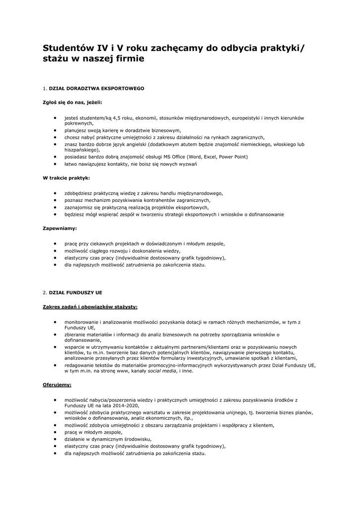 Studentów IV i V roku zachęcamy do odbycia praktyki/ stażu w naszej firmie 1. DZIAŁ DORADZTWA EKSPORTOWEGO Zgłoś się do nas, jeżeli: jesteś studentem/ką 4,5 roku, ekonomii, stosunków międzynarodowych, europeistyki i innych kierunków pokrewnych, planujesz swoją karierę w doradztwie biznesowym, posiadasz bardzo dobrą znajomość obsługi MS Office (Word, Excel, Power Point) chcesz nabyć praktyczne umiejętności z zakresu działalności na rynkach zagranicznych, znasz bardzo dobrze język angielski (dodatkowym atutem będzie znajomość niemieckiego, włoskiego lub hiszpańskiego), łatwo nawiązujesz kontakty, nie boisz się nowych wyzwań W trakcie praktyk: zdobędziesz praktyczną wiedzę z zakresu handlu międzynarodowego, poznasz mechanizm pozyskiwania kontrahentów zagranicznych, zaznajomisz się praktyczną realizacją projektów eksportowych, będziesz mógł wspierać zespół w tworzeniu strategii eksportowych i wniosków o dofinansowanie Zapewniamy: pracę przy ciekawych projektach w doświadczonym i młodym zespole, możliwość ciągłego rozwoju i doskonalenia wiedzy, elastyczny czas pracy (indywidualnie dostosowany grafik tygodniowy), dla najlepszych możliwość zatrudnienia po zakończenia stażu. 2. DZIAŁ FUNDUSZY UE Zakres zadań i obowiązków stażysty: monitorowanie i analizowanie możliwości pozyskania dotacji w ramach różnych mechanizmów, w tym z Funduszy UE, zbieranie materiałów i informacji do analiz biznesowych na potrzeby sporządzania wniosków o dofinansowanie, wsparcie w utrzymywaniu kontaktów z aktualnymi partnerami/klientami oraz w pozyskiwaniu nowych klientów, tu m.in. tworzenie baz danych potencjalnych klientów, nawiązywanie pierwszego kontaktu, analizowanie przesyłanych przez klientów formularzy inwestycyjnych, umawianie spotkań z klientami, redagowanie tekstów do materiałów promocyjno-informacyjnych wykorzystywanych przez Dział Funduszy UE, w tym m.in. na stronę www, kanały social media, i inne. Oferujemy: możliwość nabycia/poszerzenia wiedzy i praktycznych umiejętności z zakresu pozyskiwania środków z Funduszy UE na lata 2014-2020, możliwość zdobycia praktycznego warsztatu w zakresie projektowania unijnego, tj. tworzenia biznes planów, wniosków o dofinansowania, analiz ekonomicznych, itp., możliwość zdobycia umiejętności z obszaru zarządzania projektami i współpracy z klientem, pracę w młodym zespole, działanie w dynamicznym środowisku, elastyczny czas pracy (indywidualnie dostosowany grafik tygodniowy), dla najlepszych możliwość zatrudnienia po zakończenia stażu. Od kandydatów oczekujemy: chęci nabywania nowej wiedzy i umiejętności, mile widziana znajomość j. angielskiego min. na poziomie B1. gotowości podejmowania nowych wyzwań, rozwiniętych umiejętności interpersonalnych, znajomości obsługi MS Office (Word, Excel, Power Point), mile widziane wykształcenie w obszarze Ekonomii/ Finansów i Rachunkowości/ Europeistyki/ Zarządzania/ Prawa, Czas trwania praktyk oraz grafik tygodniowy jest indywidualnie dostosowany. Praktyki są bezpłatne. Po zakończeniu praktyk najlepsi będą mieli możliwość podjęcia dalszej współpracy! Jeśli chcesz odbyć staż w naszej firmie - prześlij do nas swoje dokumenty aplikacyjne (CV, listy motywacyjne) na adres e-mail: [email protected] w tytule wpisując "Praktyka w dziale ........." W aplikacji należy zawrzeć poniższą klauzulę: „Wyrażam zgodę na przetwarzanie moich danych osobowych dla potrzeb niezbędnych do realizacji procesu rekrutacji (zgodnie z ustawą o ochronie danych osobowych z dn.29.08.97 Dz. U. 133 Poz. 883)". Dziękujemy za wszystkie aplikacje. Jednocześnie informujemy, że do dalszego etapu zaprosimy tylko wybrane osoby.