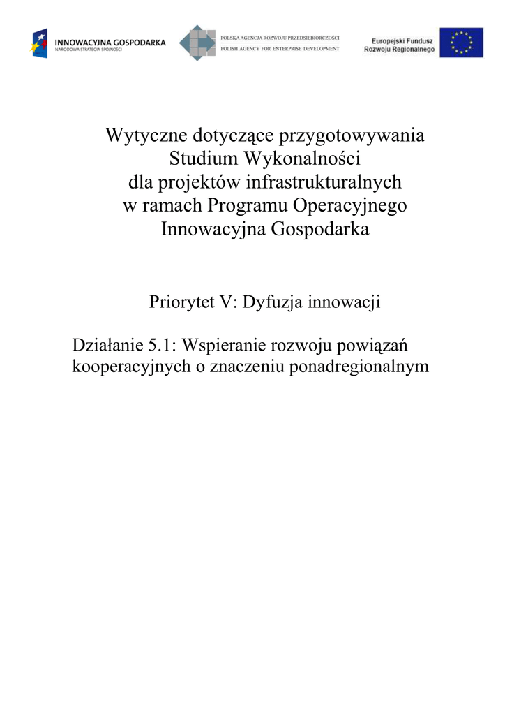 Wytyczne dotyczące przygotowywania Studium Wykonalności dla projektów infrastrukturalnych w ramach Programu Operacyjnego Innowacyjna Gospodarka Priorytet V: Dyfuzja innowacji Działanie 5.1: Wspieranie rozwoju powiązań kooperacyjnych o znaczeniu ponadregionalnym Spis treści I. Wstęp 1. Wprowadzenie 2. Podstawowe pojęcia 3. Zasady ogólne II. Struktura studium Wykonalności 1. Wykorzystane materiały i dokumentacje związane z projektem, definicje 2. Wnioski z przeprowadzonych analiz - podsumowanie 3. Przedmiot i zakres projektu (ogólnie) 4. Charakterystyka projektu a. Tytuł projektu b. Nazwa podmiotu odpowiedzialnego za realizacje projektu c. Planowana lokalizacja projektu (gmina/powiat/województwo) d. Polityka rządowa, regionalna i lokalna. Polityki horyzontalne 5. Analiza otoczenia społeczno-gospodarczego 6. Zidentyfikowane problemy 7. Logika interwencji a. Cele projektu – oddziaływanie b. Wskaźniki (wskaźniki produktu i rezultatu) 8. Komplementarność projektu z innymi działaniami/programami 9. Analiza instytucjonalna a. Beneficjenci projektu b. Wykonalność instytucjonalna projektu c. Trwałość projektu d. Analiza prawna wykonalności projektu e. Promocja projektu 10. Analiza techniczna projektu a. Ocena techniczna projektu b. Opis alternatywnych wariantów, analiza opcji c. Analiza specyficzna dla sektora 11. Analiza finansowa a. Nakłady inwestycyjne na realizację projektu b. Program sprzedaŜy. Kalkulacja przychodów c. Polityka cenowa d. Aktualny i przyszły popyt na usługi e. Plam przychodów f. Kalkulacja kosztów operacyjnych g. Rachunek zysków i strat h. Rachunek przepływów pienięŜnych w okresie realizacji i eksploatacji inwestycji i. Określenie luki w finansowaniu j. Źródła finansowania projektu k. Wskaźniki rentowności 12. Analiza ekonomiczna a. Obliczenie wskaźnika efektywności kosztowej b. Opis i kwantyfikacja jakościowych i ilościowych efektów inwestycji 13. Analiza wraŜliwości i ryzyka 14. Analiza oddziaływania na środowisko 2 I. Wstęp 1. Wprowadzenie Niniejsze wytyczne są przeznaczone dla osób przygotowujących Studia Wykonalności dla inwestycji realizowanych w ramach Działania 5.1 „Wspieranie rozwoju powiązań kooperacyjnych o znaczeniu ponadregionalnym” Programu Operacyjnego Innowacyjna Gospodarka (PO IG) na lata 2007-2013. Głównym celem niniejszych wytycznych jest ujednolicenie zasad przygotowywania Studiów Wykonalności, co ma zapewnić porównywalność projektów aplikujących o dofinansowanie w ramach PO IG. Przygotowywane Studia Wykonalności mają udowodnić zasadność realizacji projektu oraz wskazać na najbardziej korzystne dla projektu rozwiązanie techniczne i organizacyjne, jak równieŜ pokazać wykonalność projektu, szczególnie w aspekcie: finansowym, instytucjonalnym, prawnym i środowiskowym. Mają takŜe wykazać zgodność przyjętych rozwiązań z dokumentami programowymi, politykami horyzontalnymi UE i krajowymi oraz wskazać znaczenie projektu dla społeczności lokalnej i regionu. JeŜeli Wnioskodawca przygotował Studium Wykonalności według innej struktury niŜ przedstawiona w wytycznych, ale odpowiadającej zakresowi niniejszego dokumentu, nie musi, dla celów złoŜenia wniosku o dofinansowanie, uzupełniać swojego Studium. 2. Podstawowe pojęcia PROJEKT – działanie lub zestaw działań zmierzających do osiągnięcia pewnego, precyzyjnie określonego celu. ZADANIE - wyodrębniona technicznie część przedsięwzięcia inwestycyjnego wymagająca oddzielnego pozwolenia na budowę. PROJEKT GENERUJĄCY DOCHÓD - wszelkie operacje obejmujące inwestycje w infrastrukturę, korzystanie z której podlega opłatom ponoszonym bezpośrednio przez korzystających oraz wszelkie operacje pociągające za sobą sprzedaŜ gruntu lub budynków, lub dzierŜawę gruntu, lub budynków, lub najem budynków, lub wszelkie inne odpłatne świadczenie usług; WNIOSKODAWCA/BENEFICJENT – koordynator powiązania kooperacyjnego spełniający warunki § 26 Rozporządzenia Ministra Rozwoju Regionalnego w sprawie udzielania przez Polską Agencję Rozwoju Regionalnego pomocy finansowej w ramach Programu Operacyjnego Innowacyjna Gospodarka BENEFICJENT POŚREDNI - podmiot lub grupa bezpośrednio korzystająca z efektów projektu. CELE OGÓLNE/POŚREDNIE – cele wyjaśniające, w kategoriach długoterminowych korzyści dla beneficjentów i szerszych korzyści dla innych grup, dlaczego projekt jest waŜny dla społeczeństwa,. . 3 CEL BEZPOŚREDNI – cel odnoszący się do kluczowego problemu, definiowany w kategoriach korzyści dla beneficjentów lub grup docelowych, jest rezultatem wykorzystania powstałych produktów.. PRODUKT – wynik interwencji w stan aktualny, czyli bezpośredni, materialny efekt realizacji przedsięwzięcia mierzony konkretnymi wielkościami (np. kubatura budynku). WSKAŹNIKI PRODUKTU - wskaźniki odnoszące się do wyniku interwencji, liczone w jednostkach materialnych lub monetarnych (np. długość zbudowanej drogi, ilość firm, które uzyskały pomoc). REZULTATY - bezpośrednie i natychmiastowe efekty zrealizowanego projektu. Rezultaty dostarczają informacji o zmianach, jakie nastąpiły w wyniku wdroŜenia projektu u beneficjentów pomocy, bezpośrednio po uzyskaniu przez nich wsparcia. WSKAŹNIKI REZULTATU - wskaźniki odpowiadające bezpośrednim i natychmiastowym efektom wynikającym z projektu. Dostarczają one informacji o zmianach dotyczących beneficjentów. Wskaźniki mogą przybierać formę wskaźników materialnych lub finansowych. ODDZIALYWANIE - konsekwencje dla bezpośrednich beneficjentów po zakończeniu ich udziału w projekcie lub po zakończeniu danej inwestycji, a takŜe pośrednie konsekwencje dla innych adresatów, którzy skorzystali lub stracili w wyniku realizacji projektu. 3. Zasady ogólne Przy sporządzaniu Studium Wykonalności naleŜy stosować następujące zasady ogólne: Studium Wykonalności stanowi załącznik do Wniosku o dofinansowanie p